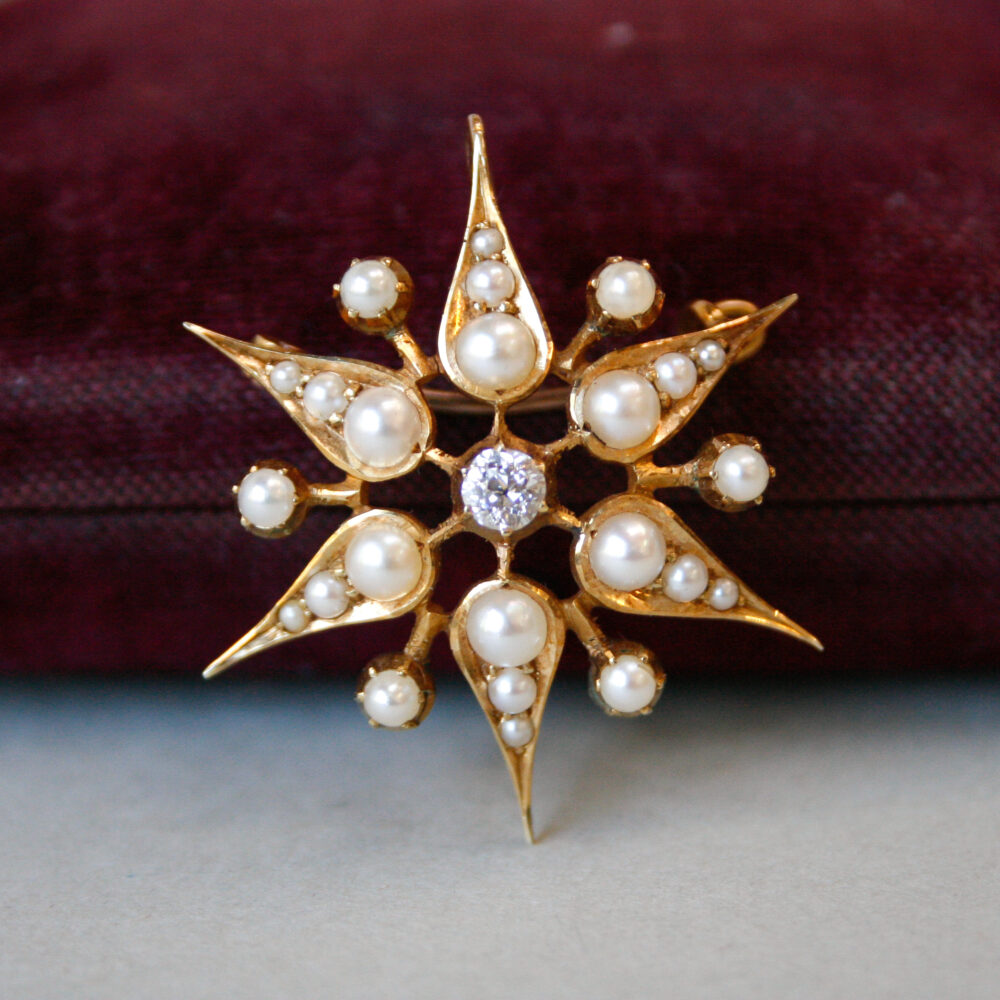 Antique Victorian 15ct gold pearl old cut diamond star brooch pendant c.1860s – 1880s