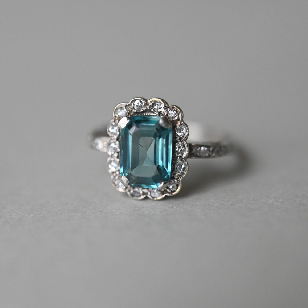 Antique Art Deco 18ct white gold step cut blue zircon and diamond cluster ring