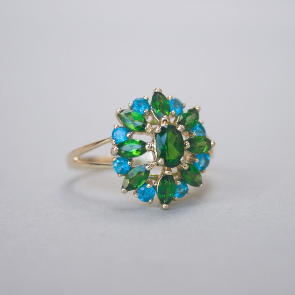 Contemporary 9ct gold chrome diopside and apatite cluster ring