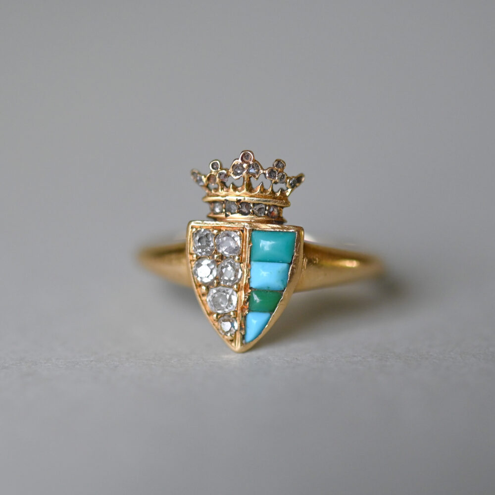 Victorian 18ct gold turquoise and old cut diamond crown shield ring, c.1860s