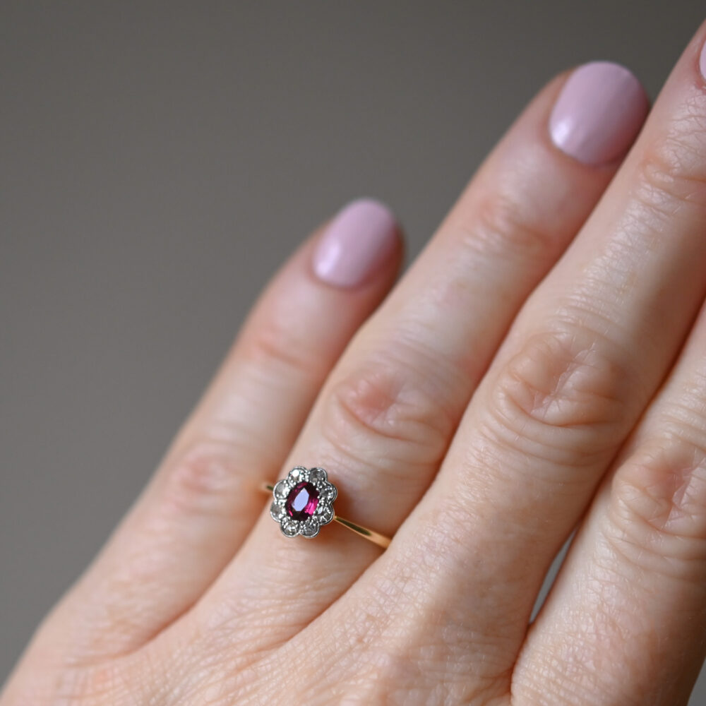 Art Deco 18ct gold platinum ruby and diamond cluster ring, c.1930s