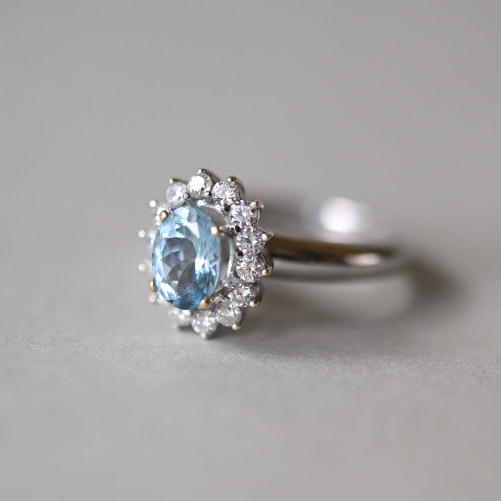Classic 18ct white gold aquamarine and diamond cluster ring