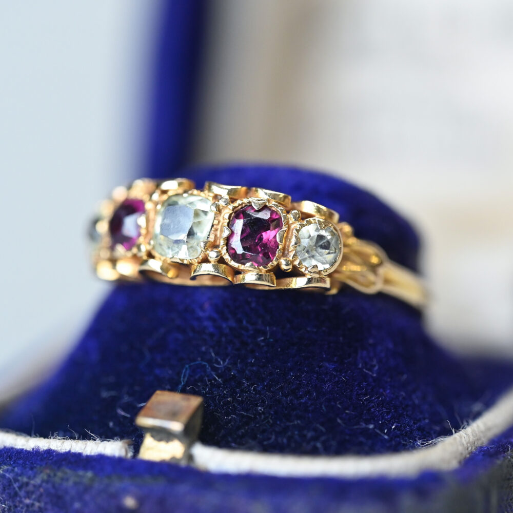Victorian 15ct gold garnet and pale yellow topaz five stone ring. C.1860s