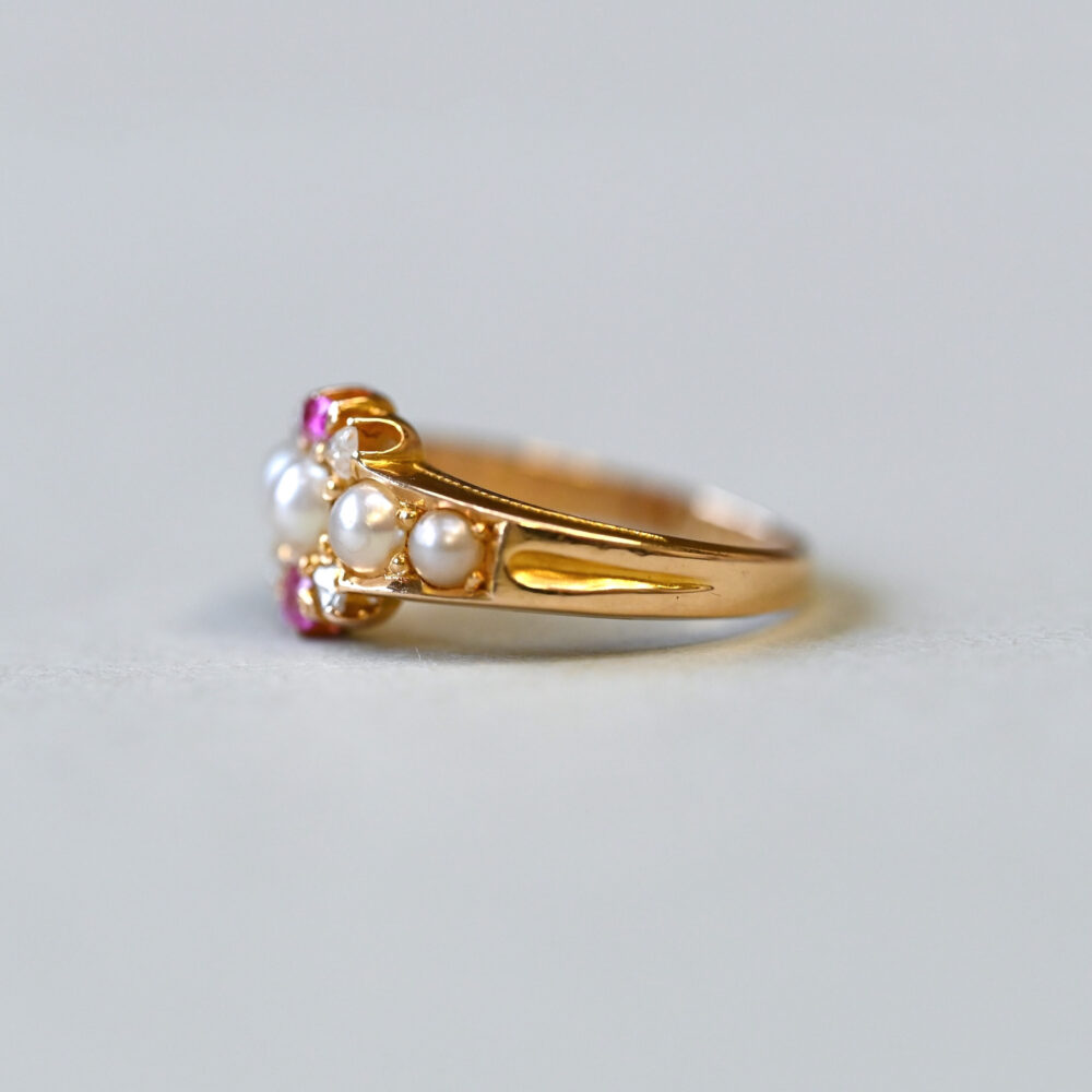 Victorian 18ct gold pearl, diamond and pink sapphire ring, c.1860s