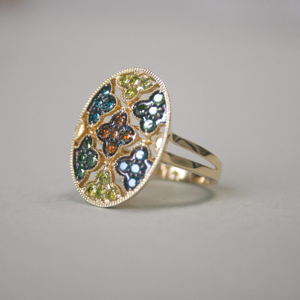 Contemporary 9ct gold multi colour diamond quatrefoil openwork ring