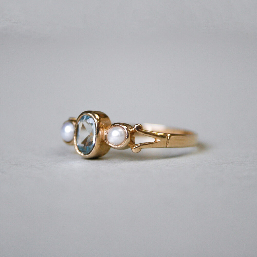 Cutie 9ct gold aquamarine and pearl three stone ring