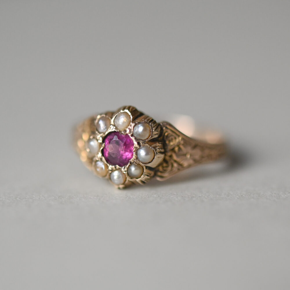 Victorian 9ct gold pearl and garnet floral ring