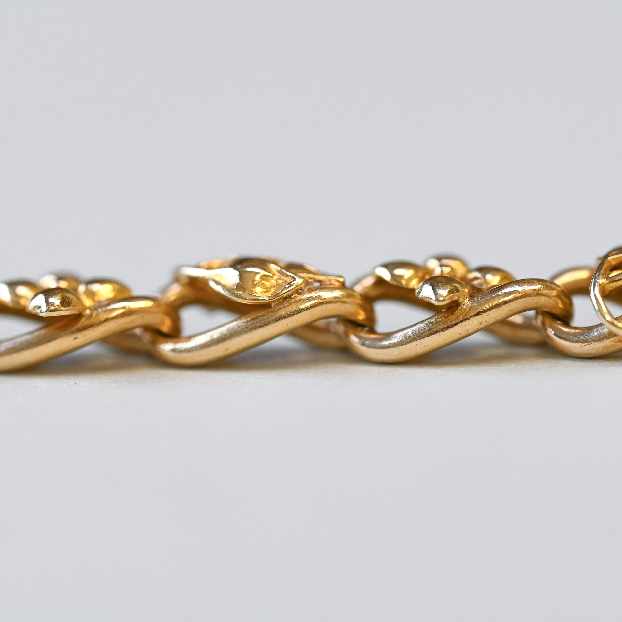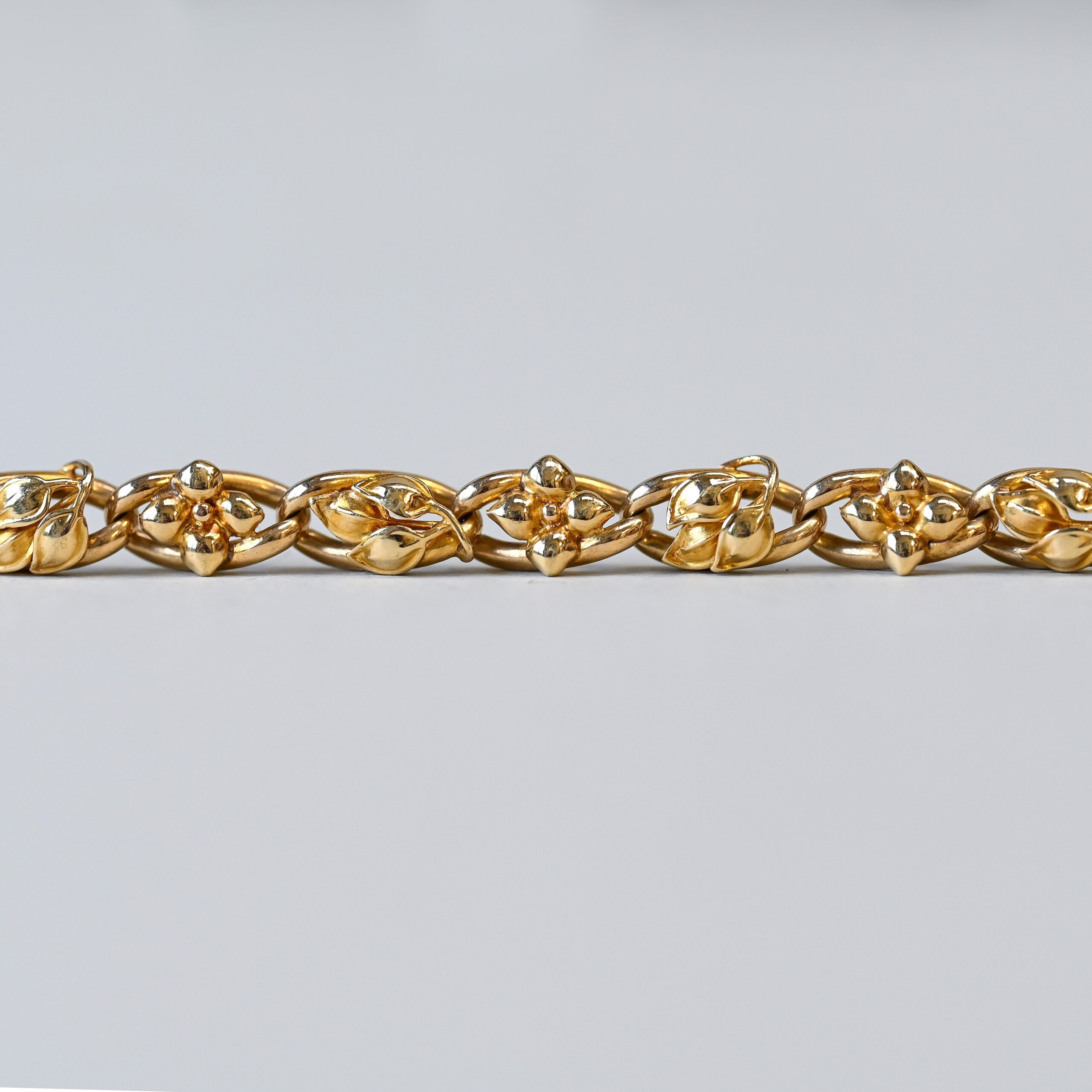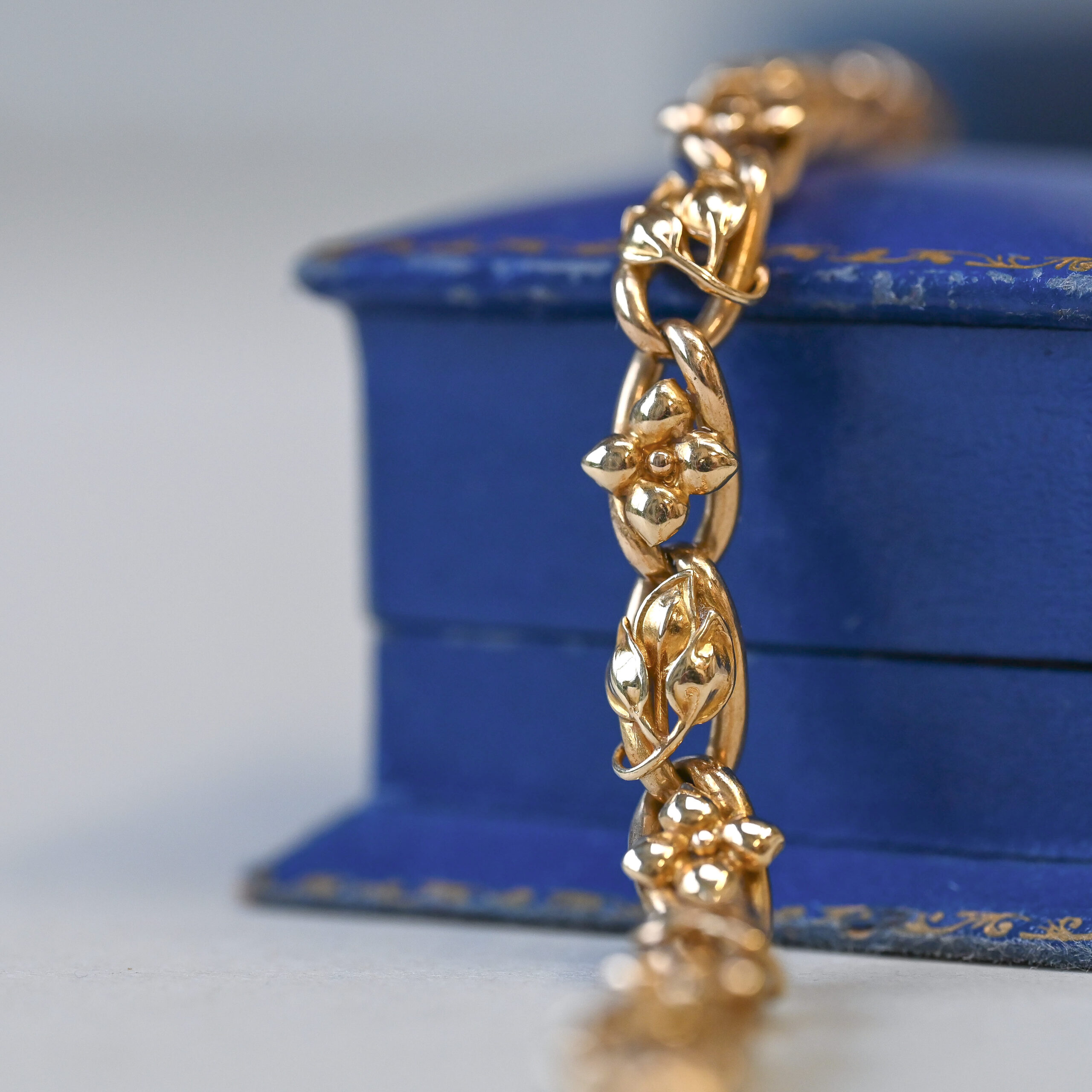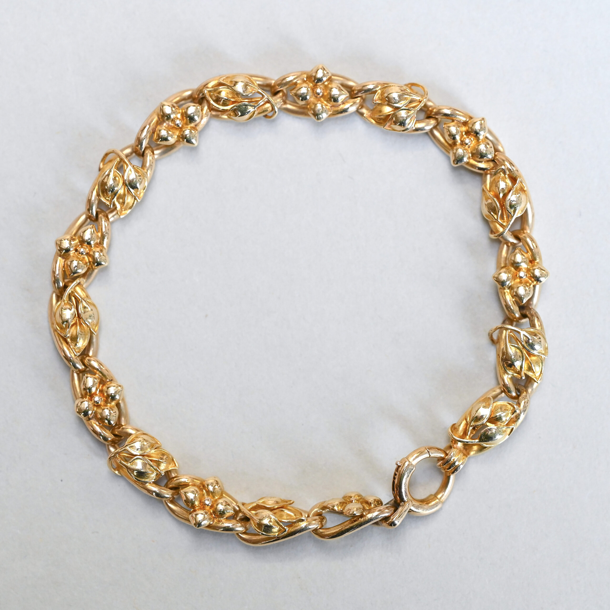 Dating to the c.1920s, this gorgeous 14ct gold embossed leaf bracelet carries a repeating pattern of alternating leaves and four-petal flowers. Beautifully linked together by an interlinking chain and finished with a large bolt clasp. The delicate leaves and flowers make a visually pleasing contrast to the chunkier openwork chain. This piece falls under the aesthetic movement of Jugendstil jewellery. Jugendstil, which spanned the end of the 19th century and early 20th century, was a German and Austrian art movement and part of the broader Art Nouveau era. Emphasis was made on beautiful organic, flowing, and nature-inspired designs as well as fine, handcrafted quality. This 14ct gold bracelet has been exquisitely made and is a wonderful example of aesthetic jewellery. Please note the box shown is for demonstration purposes.