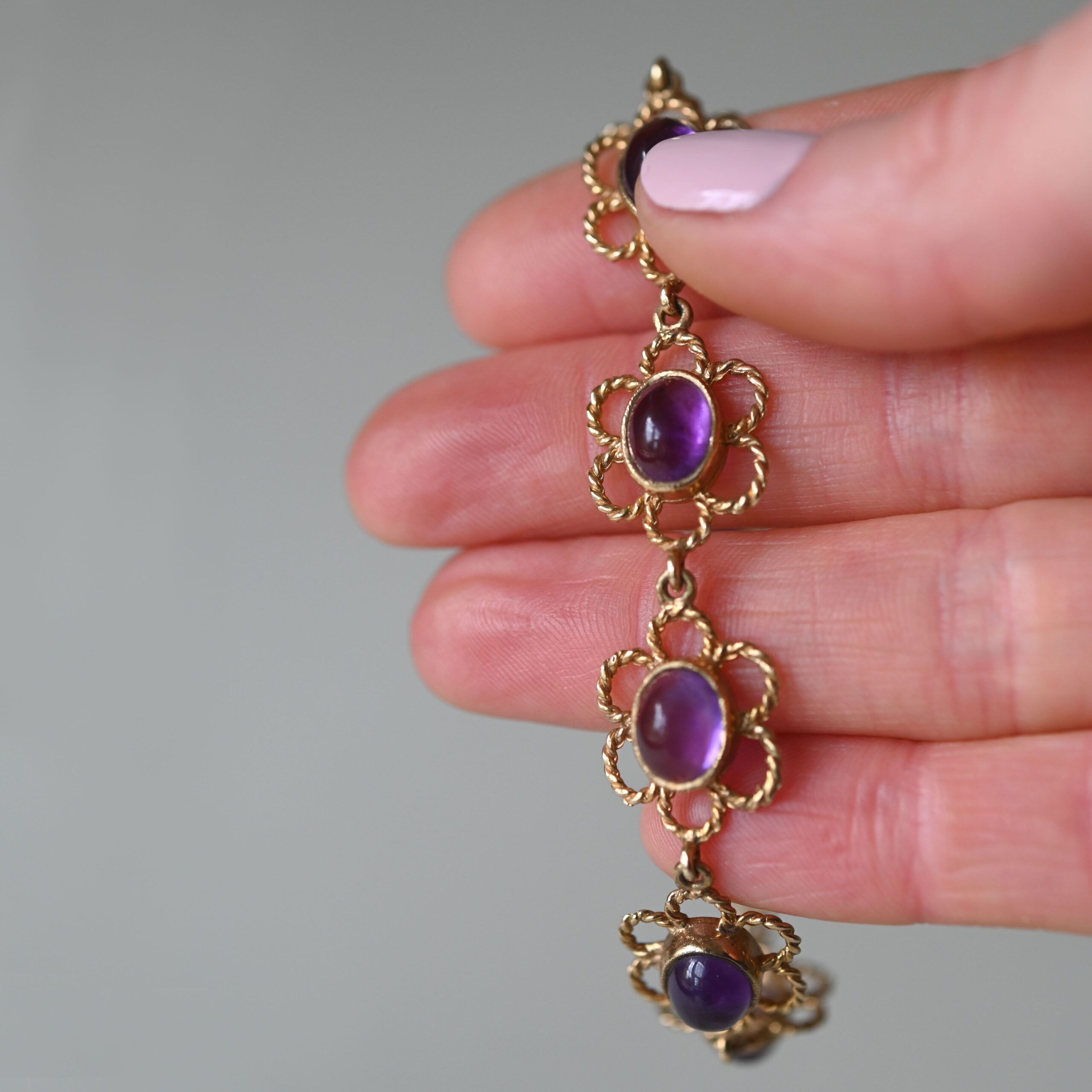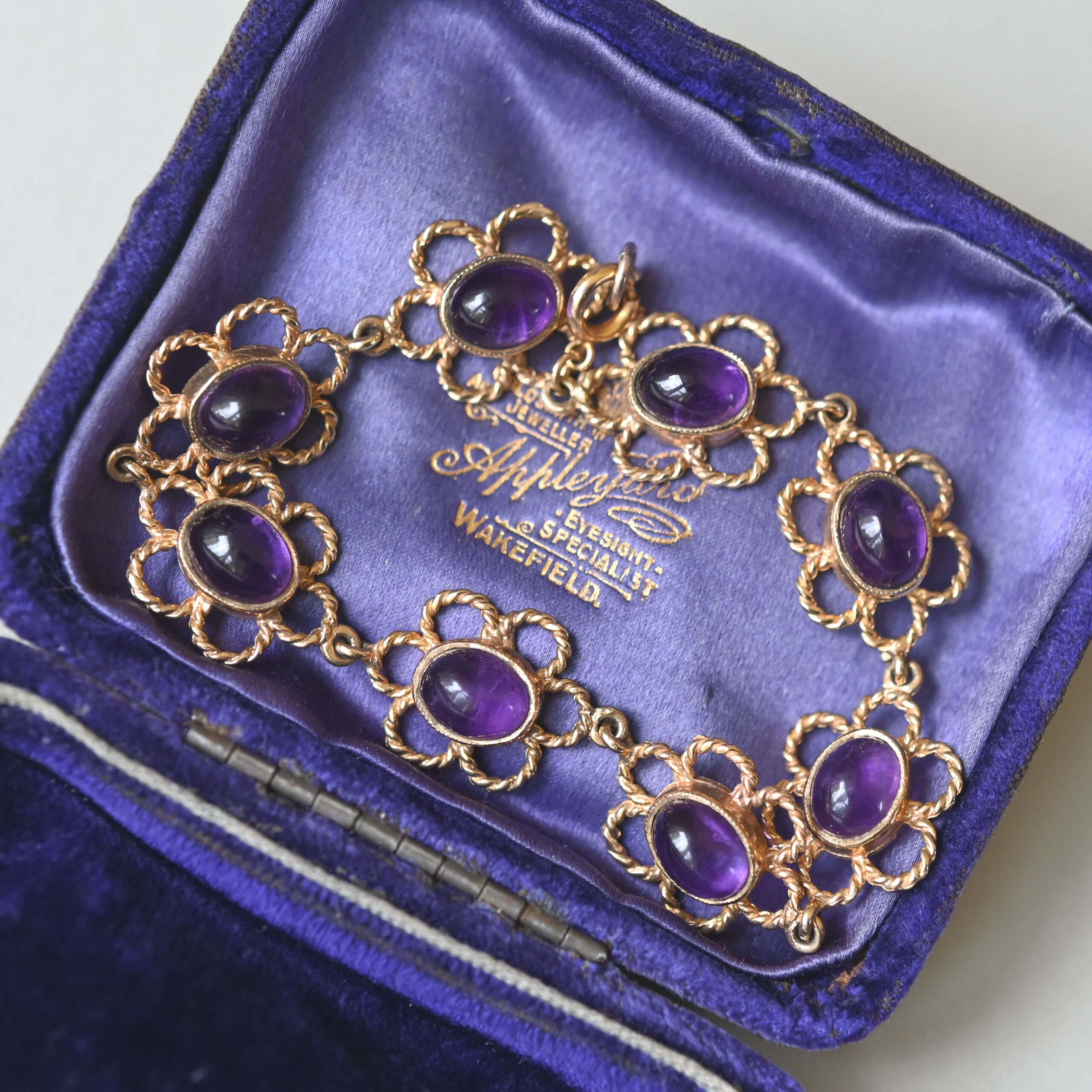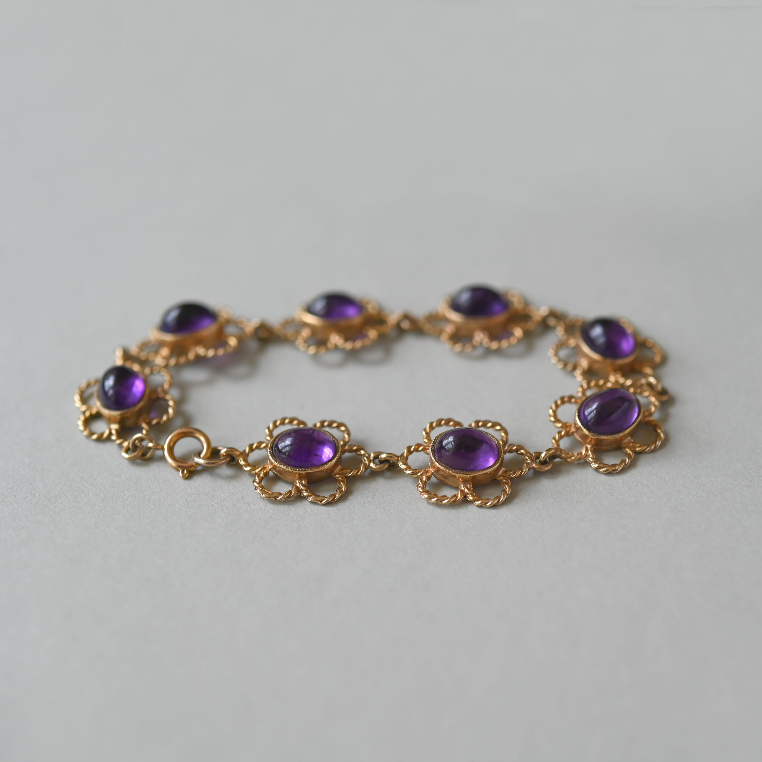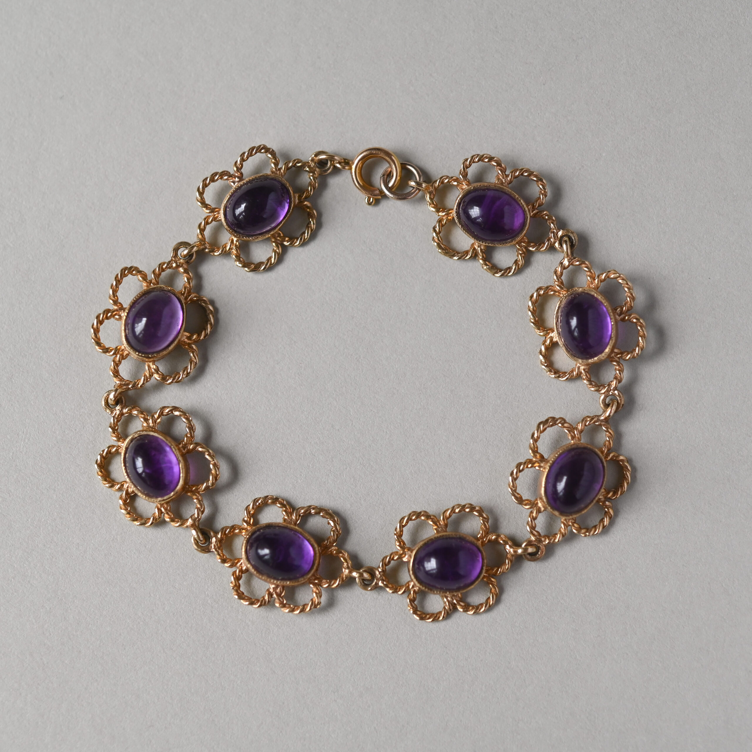 Dating to the late 1970s, this aesthetic piece has been beautifully designed as a linked series of openwork floral forms. Each flower is set with an oval shaped amethyst cabochon. The amethysts are well saturated and measure 9 mm x 7 mm, totalling an estimated 20.0 carats. The floral links measure 20 mm x 15 mm. With a spring clasp. A gorgeous piece of English 9ct gold vintage jewellery by makers HBJ. Please note the box shown is for demonstration purposes.
