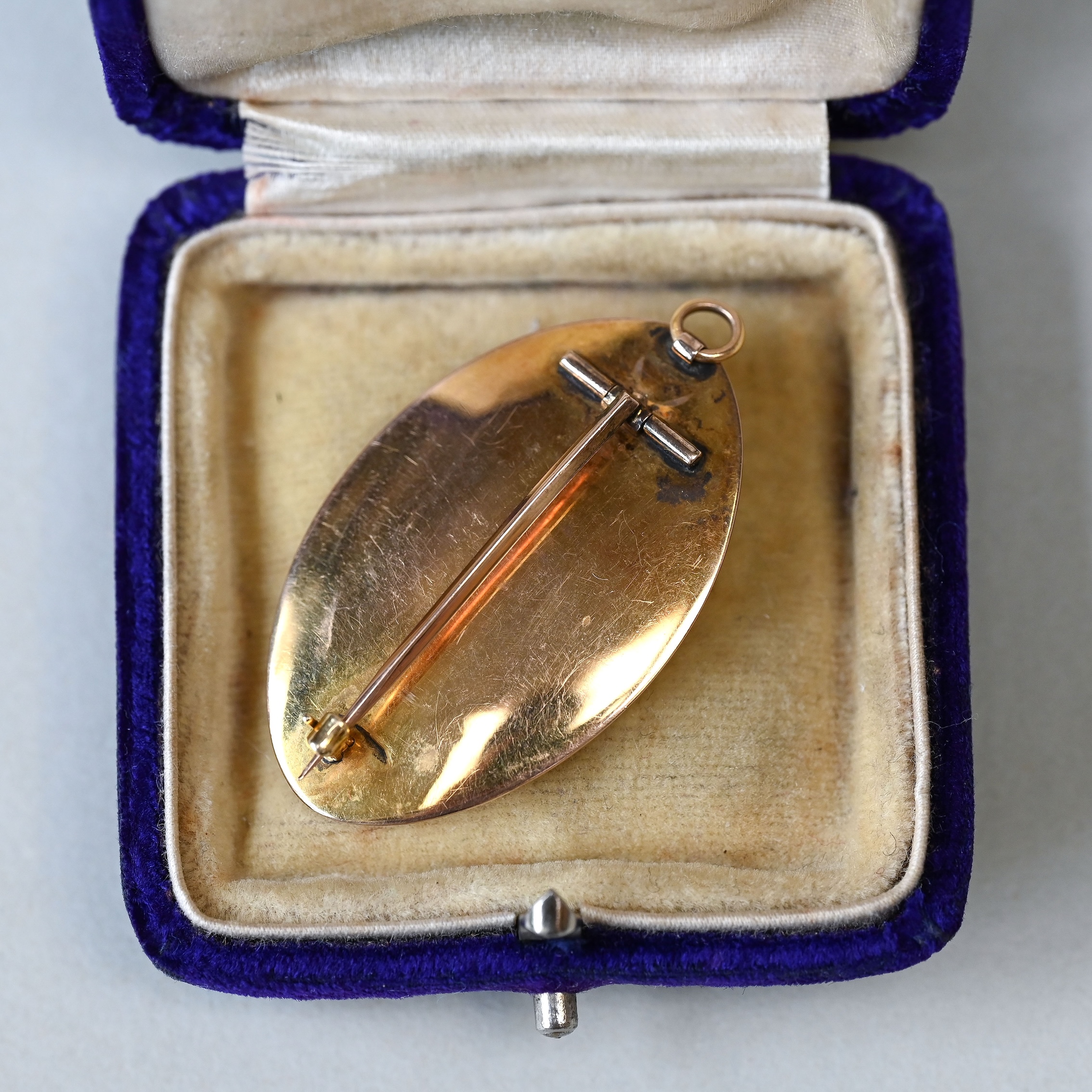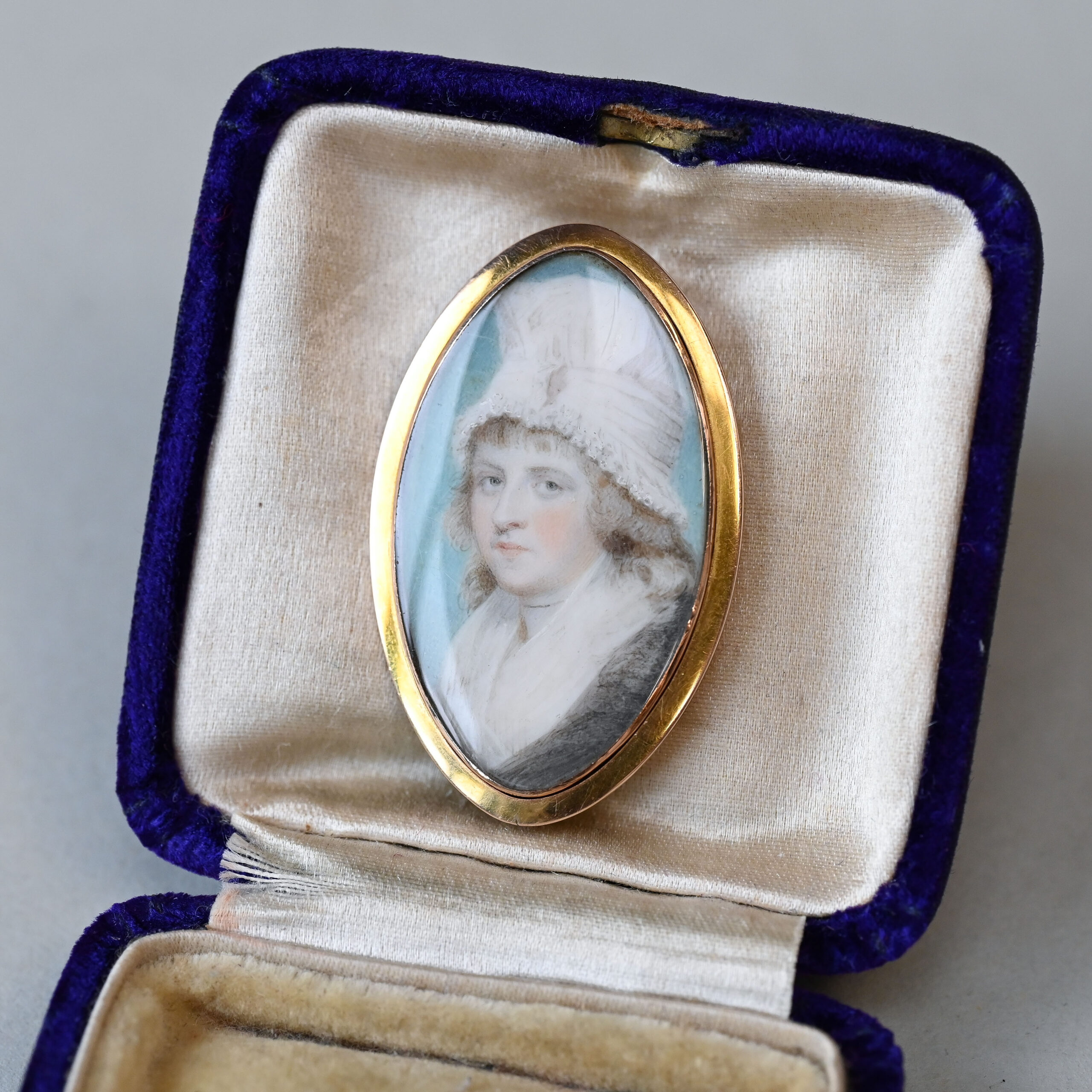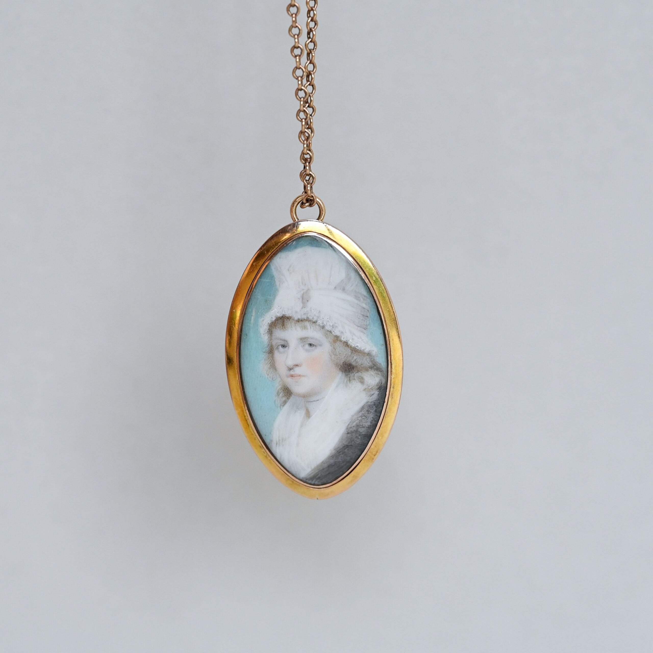 Dating to the late 1700s, this is currently one of the oldest pieces in the collection. Fitting neatly into the Georgian era, this exquisite pendant is a beautiful example of quintessential English jewellery. Designed as a glazed miniature portrait painting, set in a rounded navette shape 9ct gold frame. With a dome glazed panel to the front and both bail and brooch fittings to the reverse. The sitter is a young woman, painted with rosey cheeks and long curly hair. She must have been of notable standing to have such a painting commissioned. The artist’s hand is exceptional, with minute brushstrokes capturing each and every tiny detail. Can be worn as either a pendant or brooch. Please note the box and chain shown are for demonstration purposes.