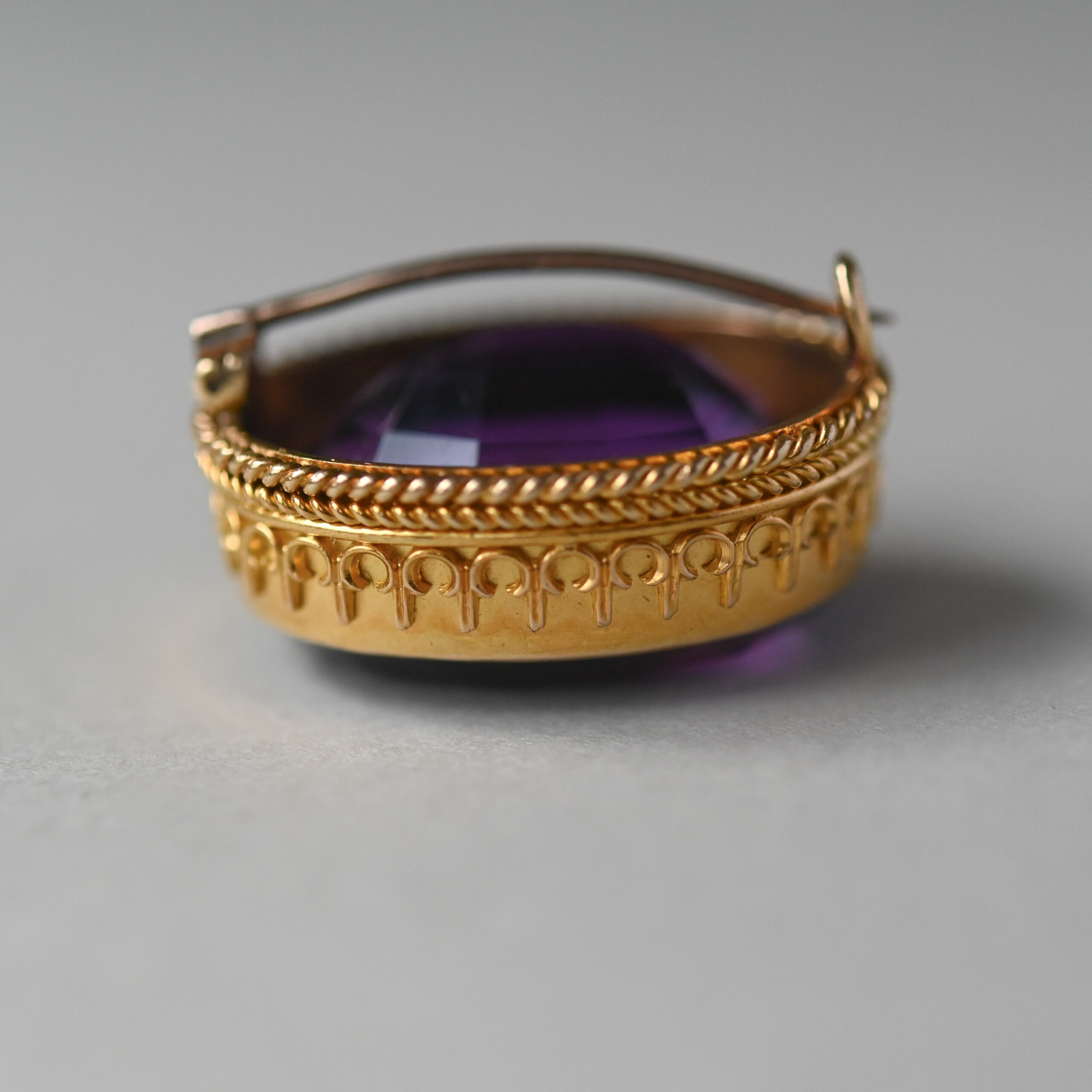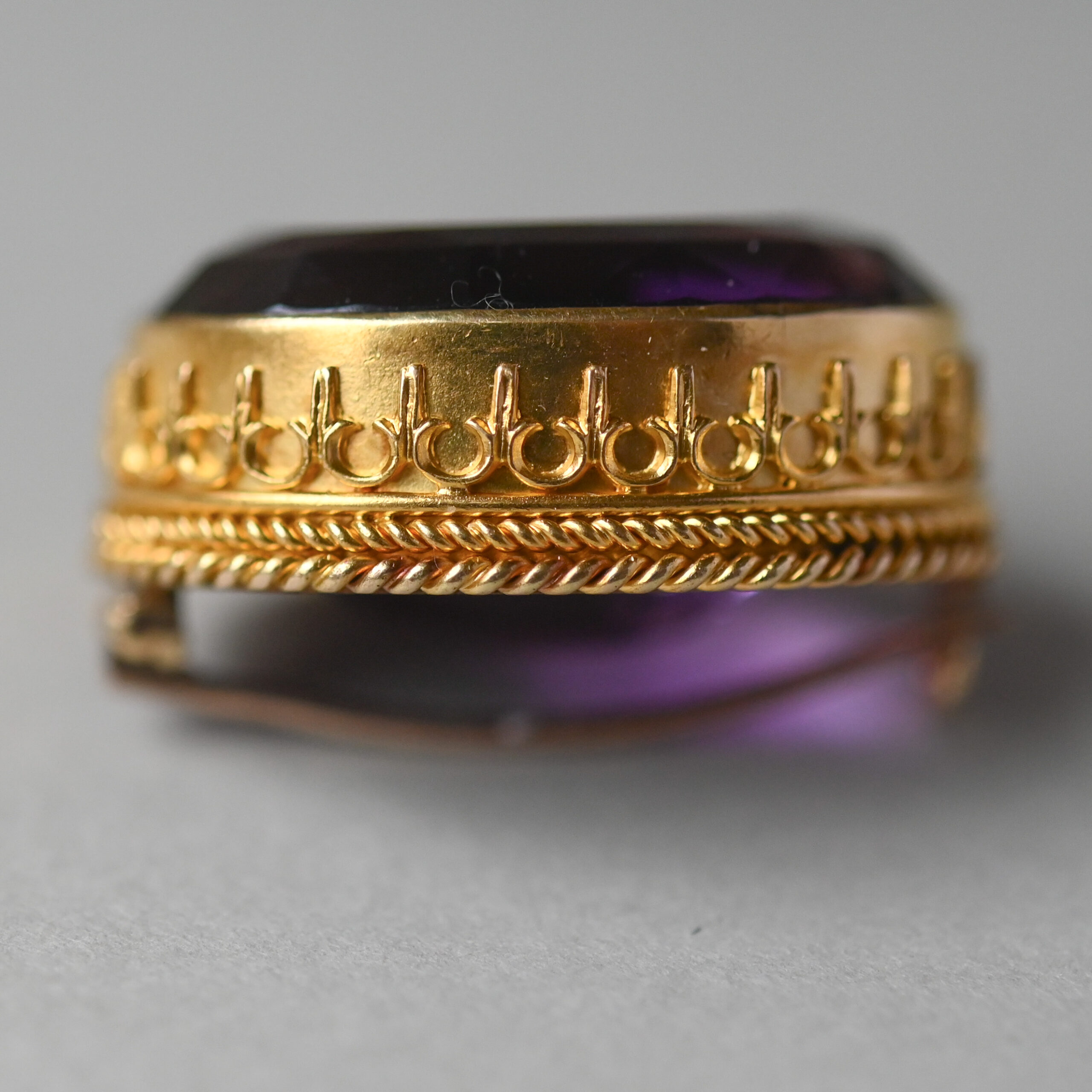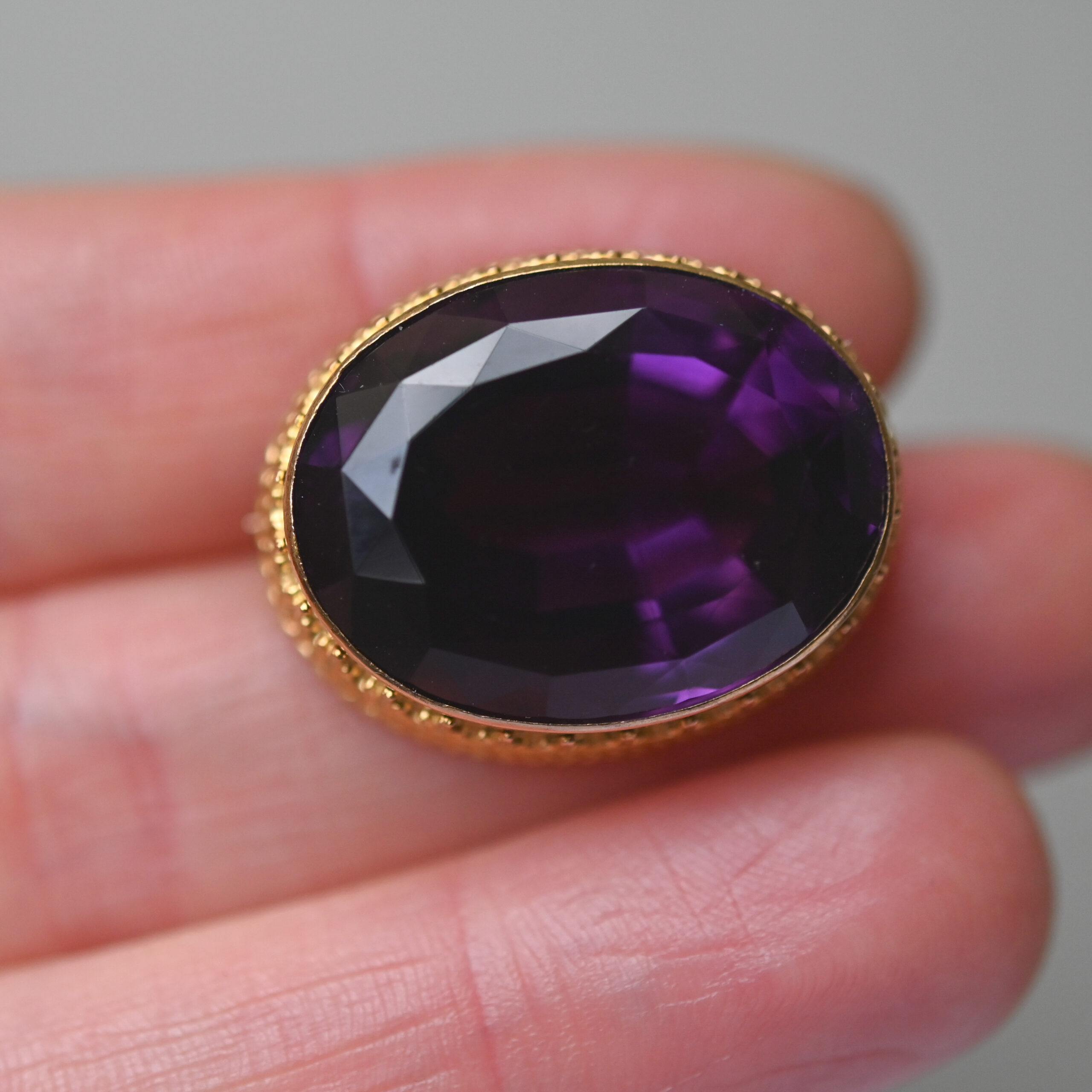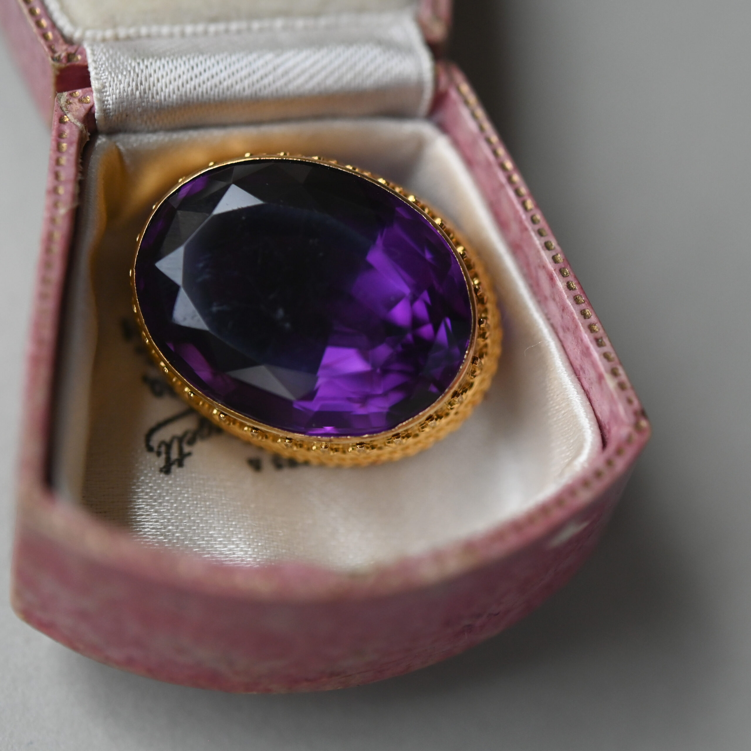 Dating to the 19th century, this beautifully rich piece fits neatly into the Victorian era, c.1860s. Set with an exquisite, royal purple amethyst that displays flashes of pinks and blues. The amethyst measures 24 mm x 19 x 13 mm. Framed by a finely detailed fleur de lis and rope twist setting, which beams fabulous quality. With a simple c hook and pin clasp fitting. The brooch face measures 21 x 26 mm. Please note the box shown is for demonstration purposes.