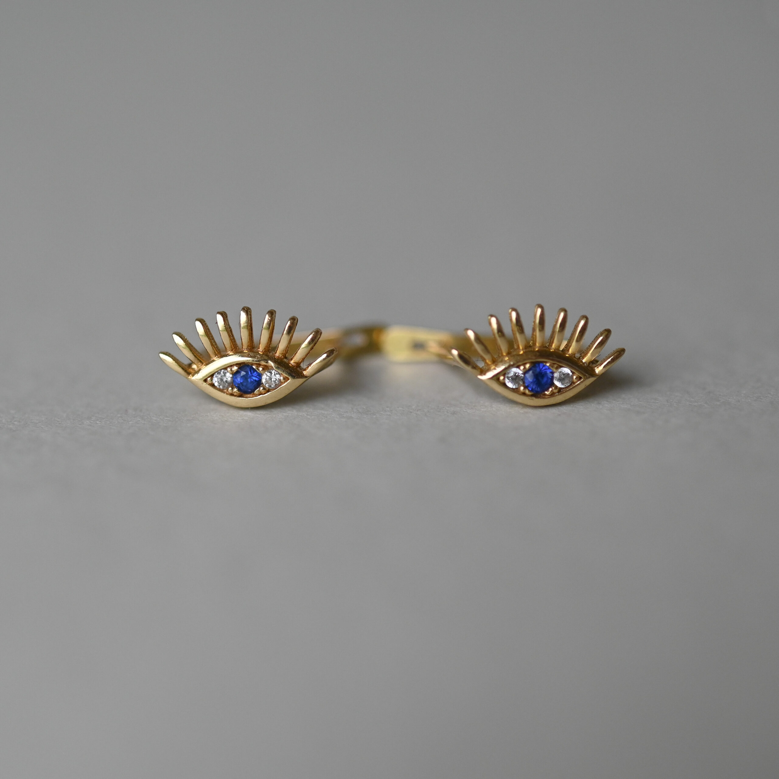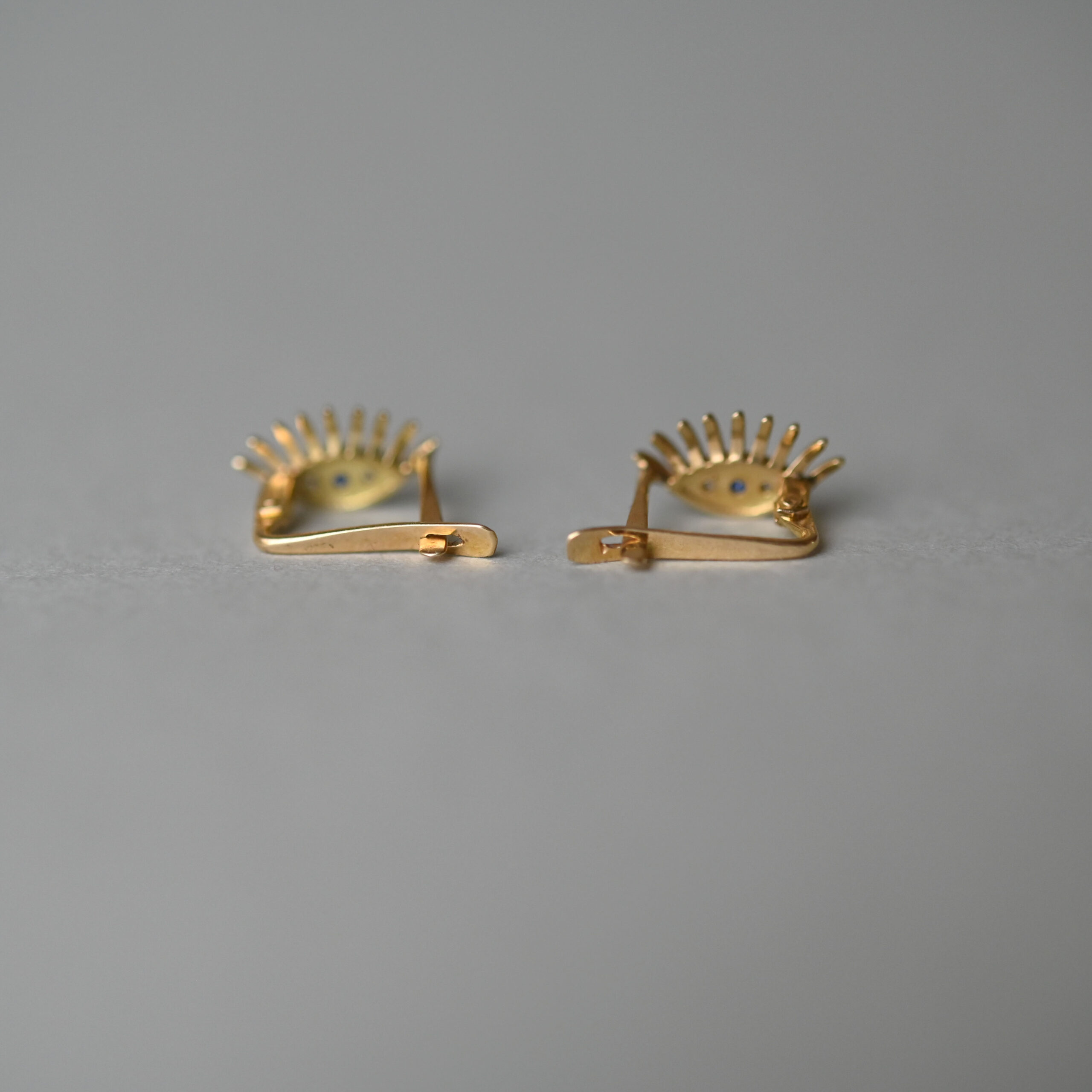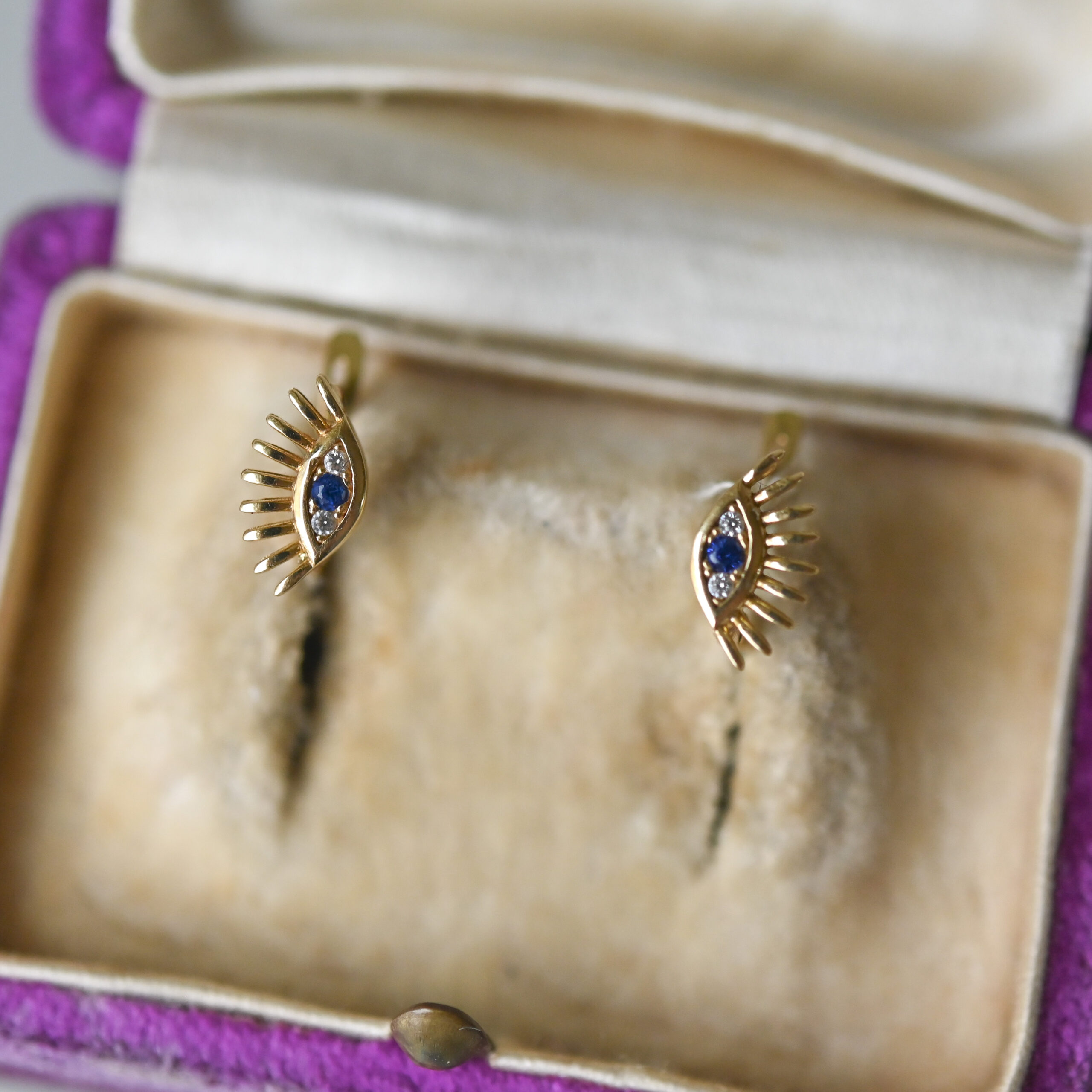 A pretty pair of aesthetically designed 18ct gold earrings. Each earring is set with white and blue paste in an eye shaped frame. The eyes have beautifully long eye lashes. Worn so that the eye sits north south in orientation, rather than east west. With post and lever back fittings that close securely. Please note the box shown is for demonstration purposes.