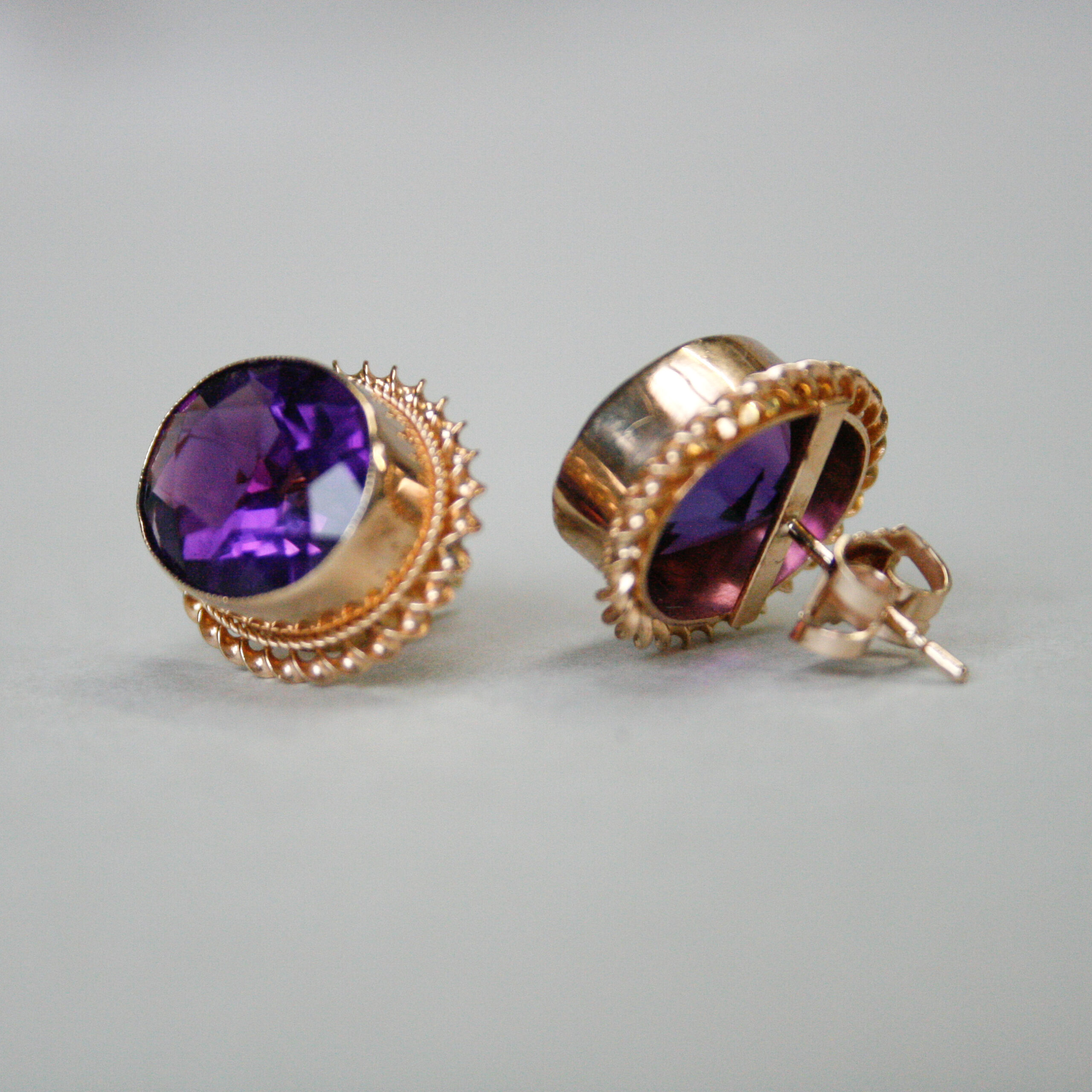 A beautifully designed pair of large oval amethyst 9ct gold earrings. The amethysts are a rich and gorgeously saturated royal purple hue and each measure 12 mm x 10 mm. An estimated total of carats 9.0 combined. Set with finely detailed rope twist frames. With post and butterfly scroll fittings. Please note the box shown is for demonstration purposes.