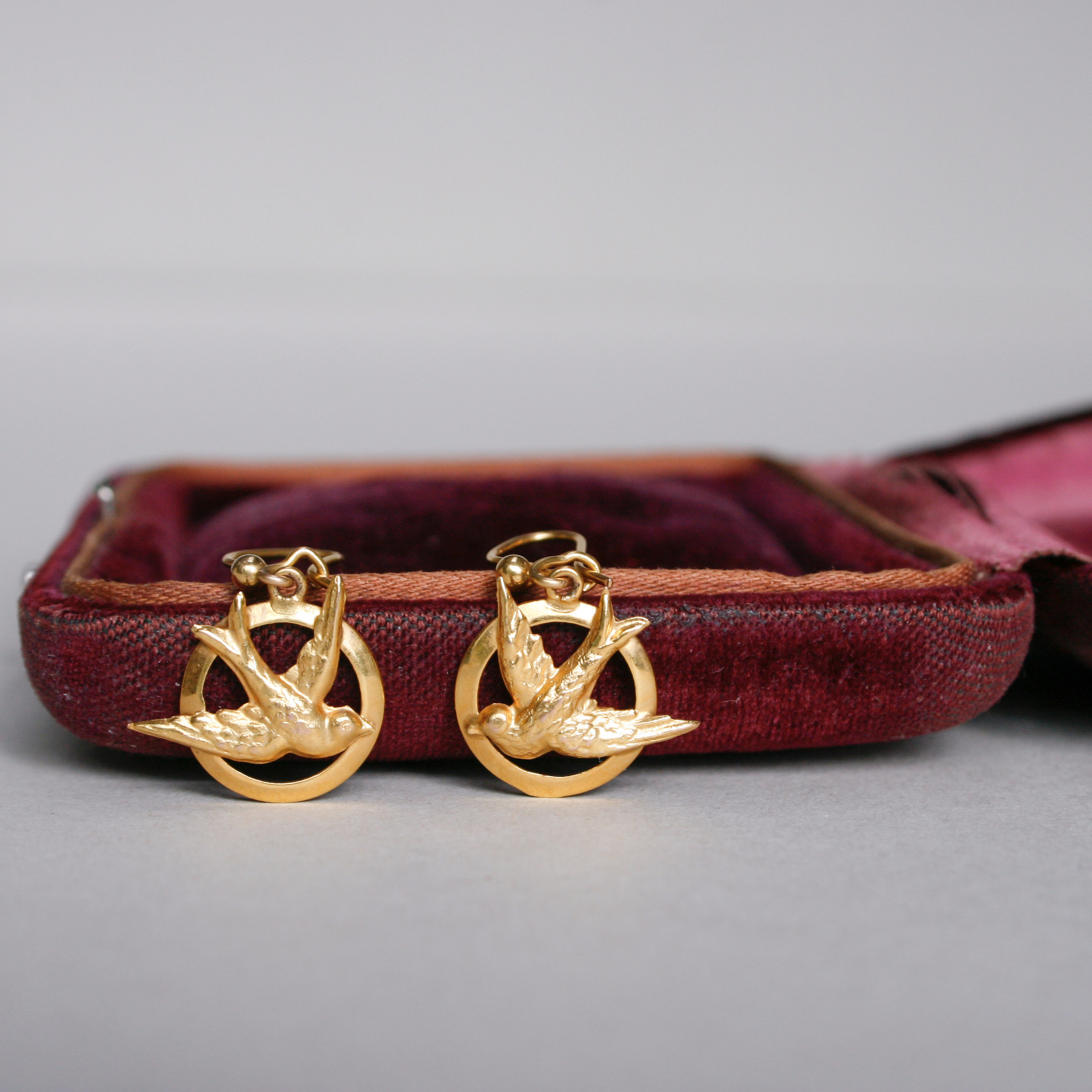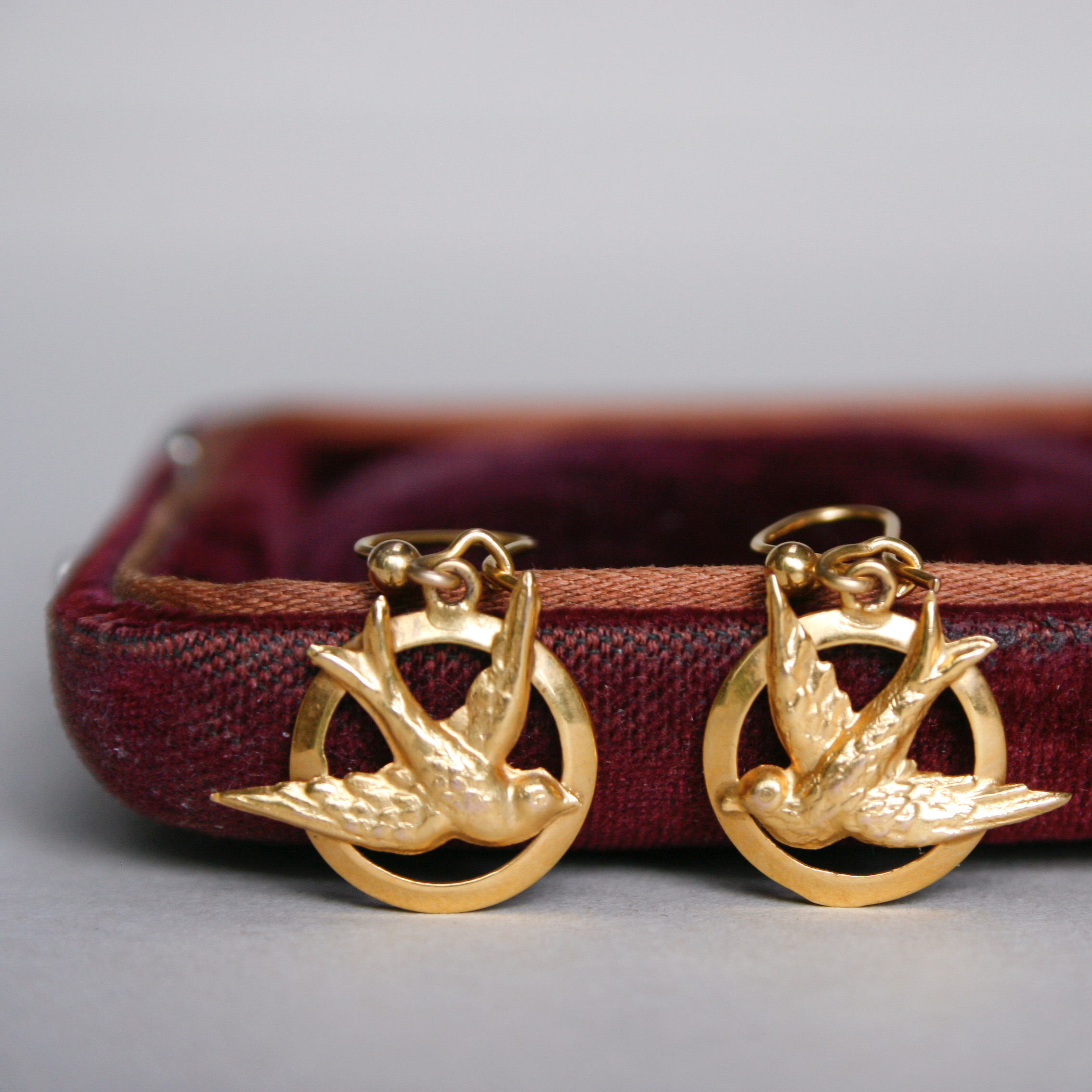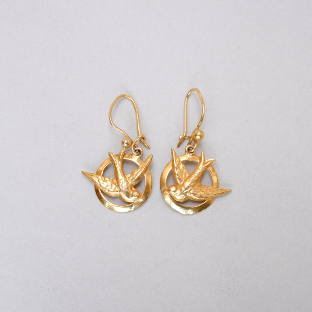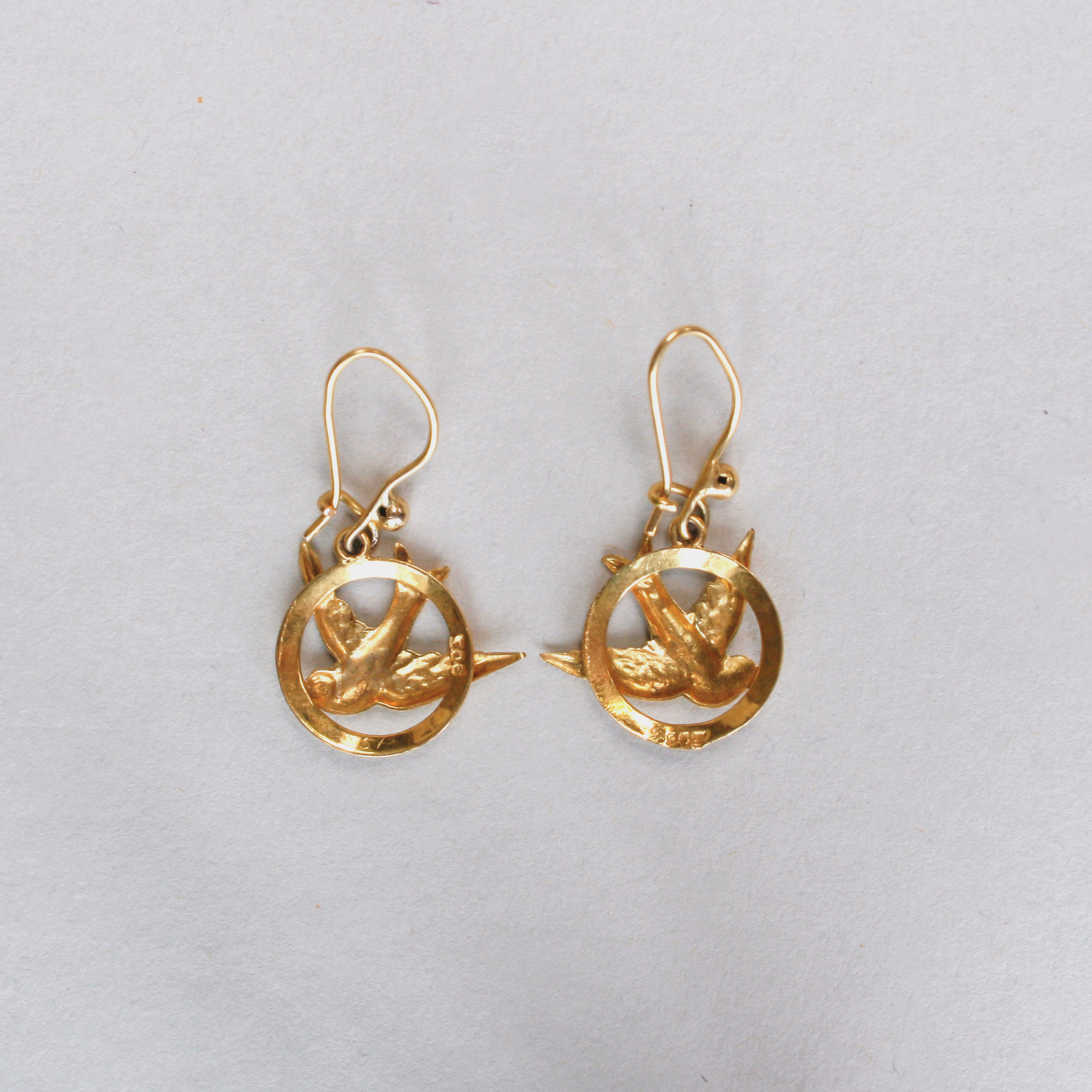 A very sweet and dainty pair of 9ct gold drop earrings designed as swallow in flight. The swallows measure 14 mm x 11 mm. Suspended from hook fittings. Please note the box shown is for demonstration purposes. Dates to mid 20th century, c.1940 – 1950s.