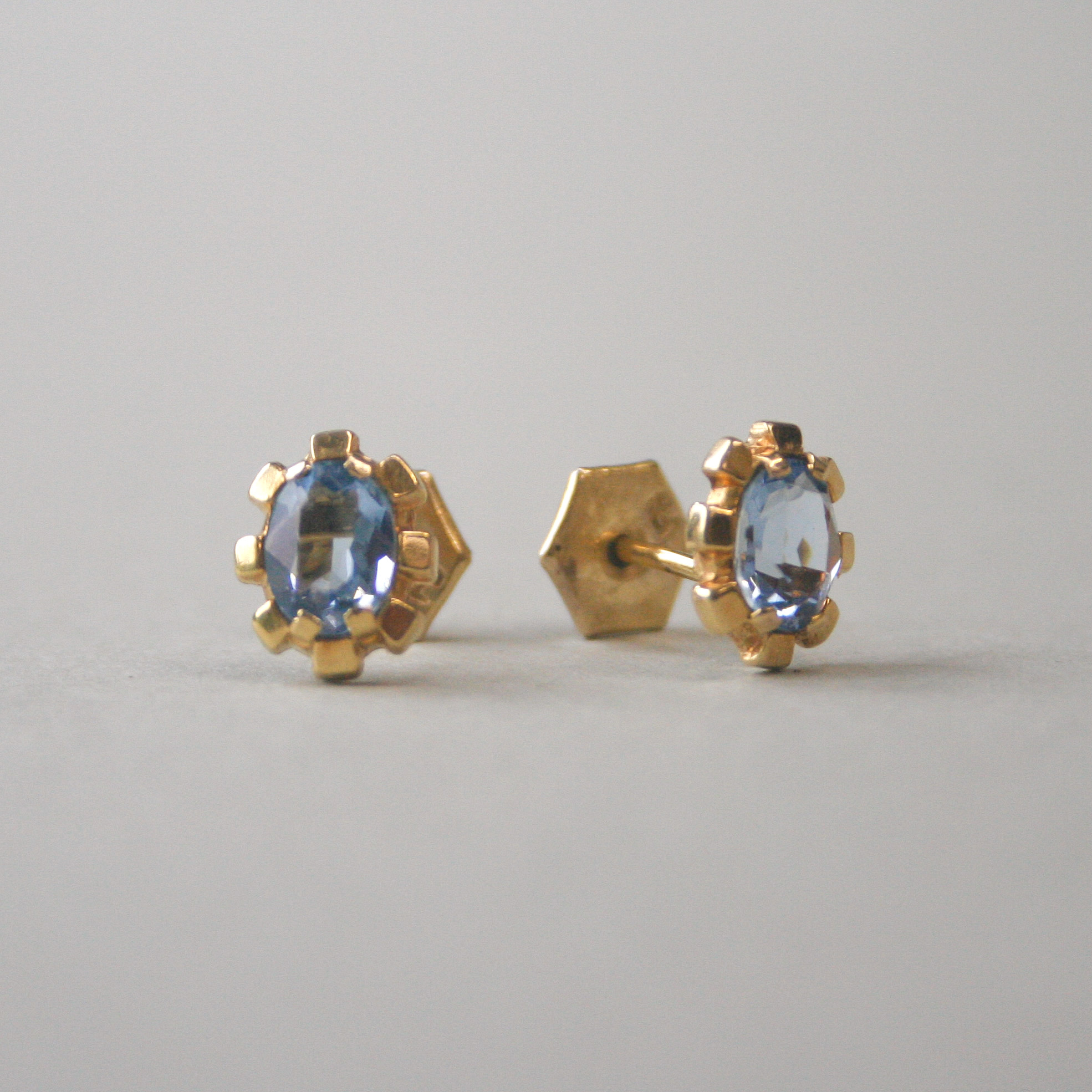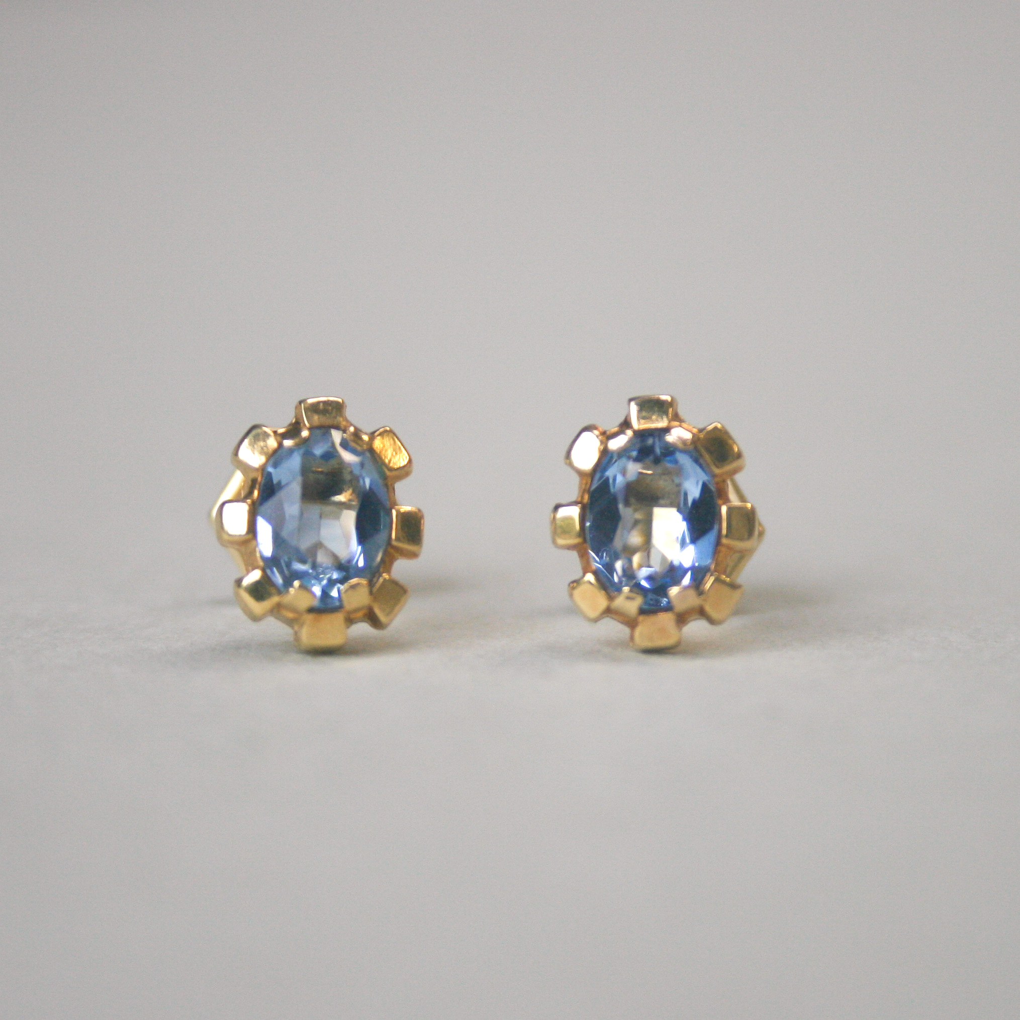 A very pretty and aesthetically pleasing pair of light blue topaz 9ct gold earrings. Each earring is set with an oval shape 4 mm x 6 mm topaz. Set in a cutie square beaded frame. With post and hexagonal button butterfly fittings. Lovingly made in the last 30 years or so.