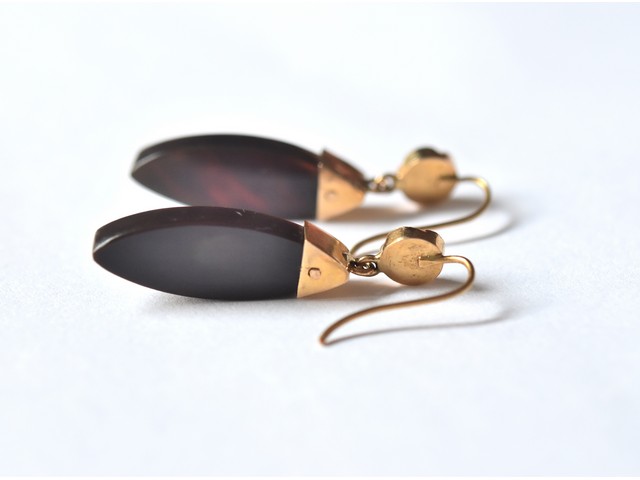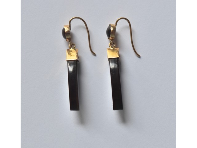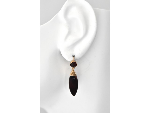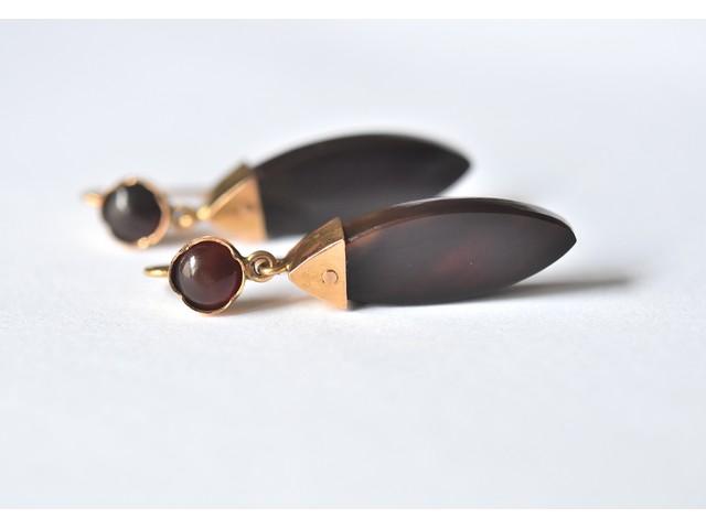 A gorgeous pair of bespoke made 9ct gold earrings. Each earring is designed as a faux tortoise shell torpedo drop, suspended from a cabochon set surmount. With hook fittings. Finely made from warm rose tinted yellow gold. Gorgeous attention to detail.