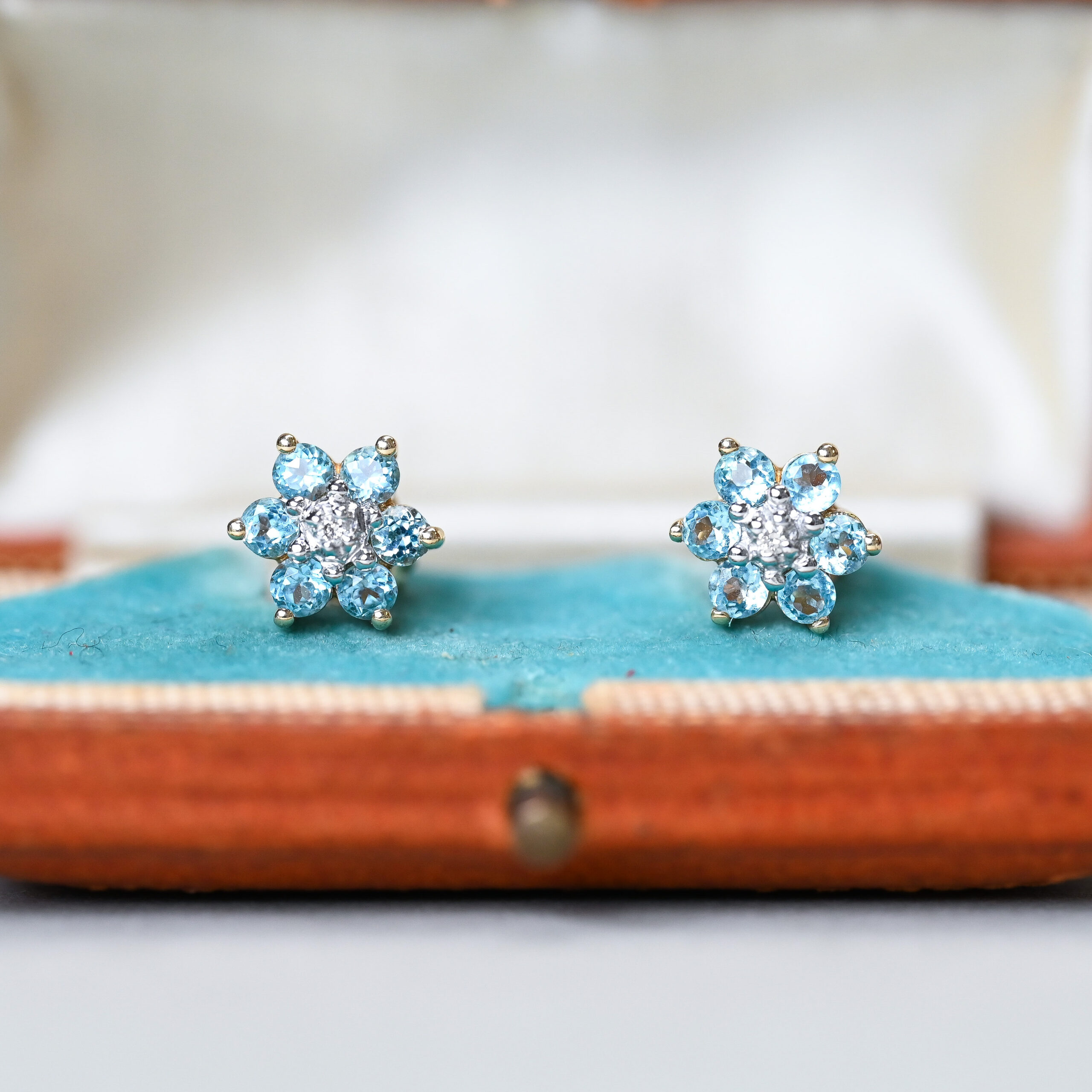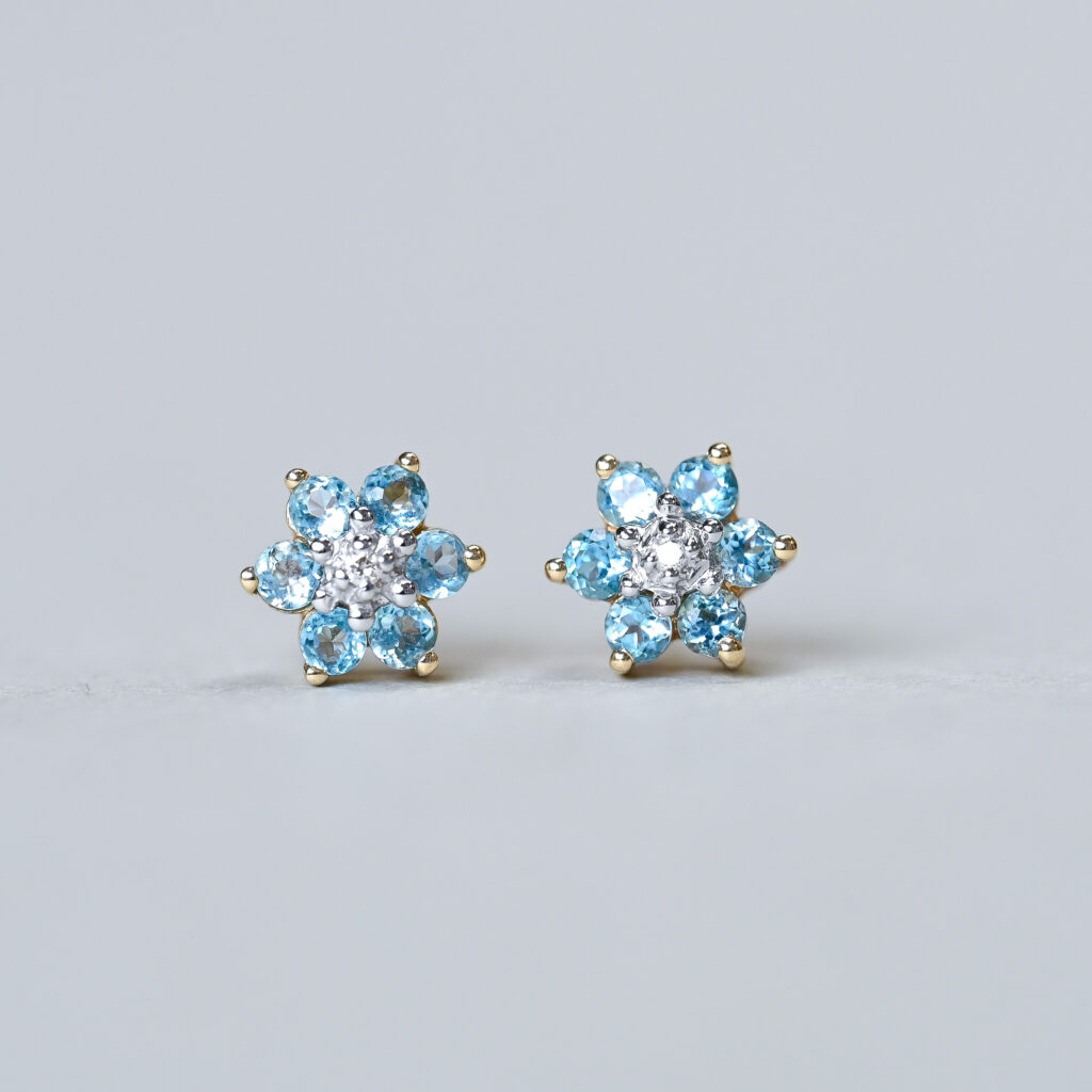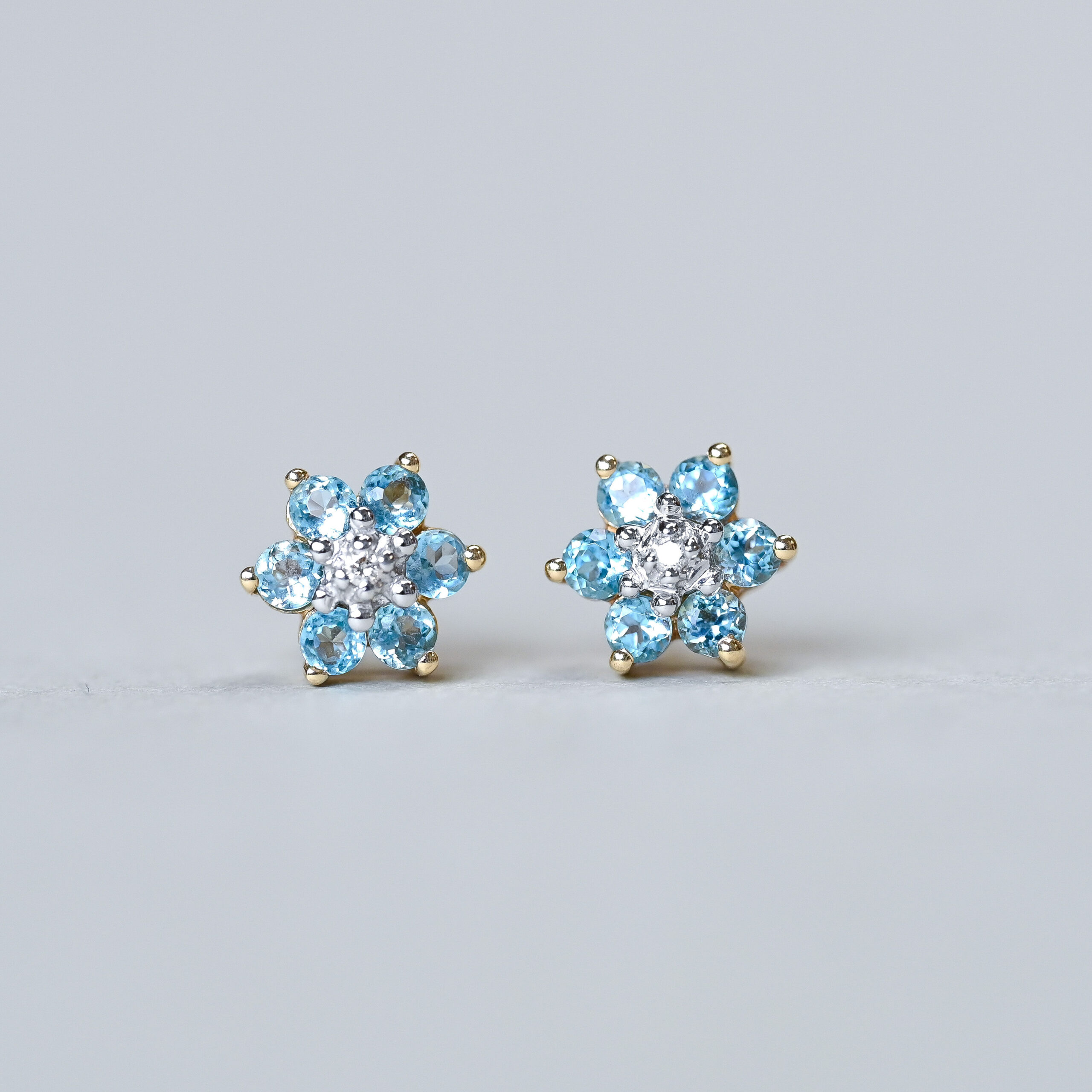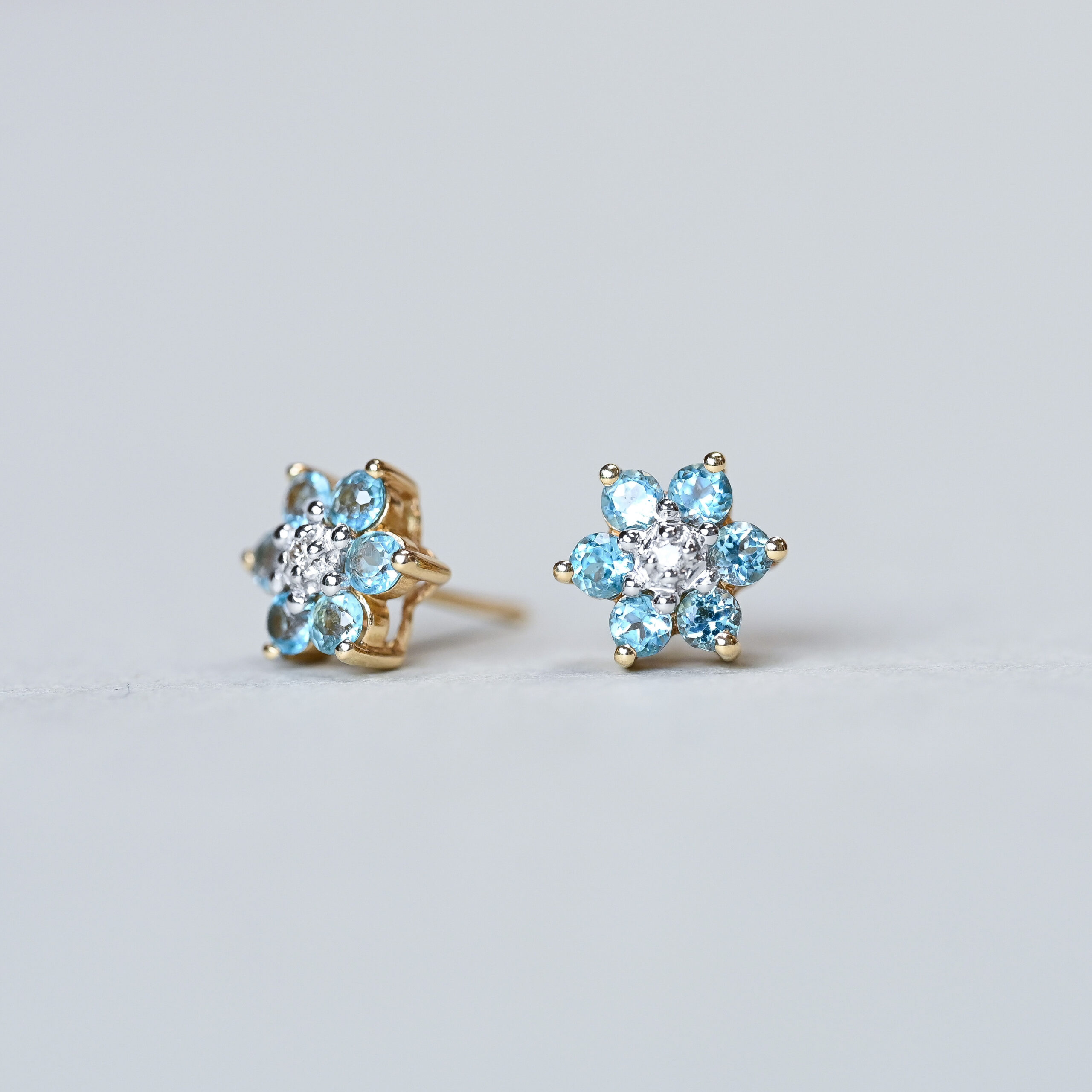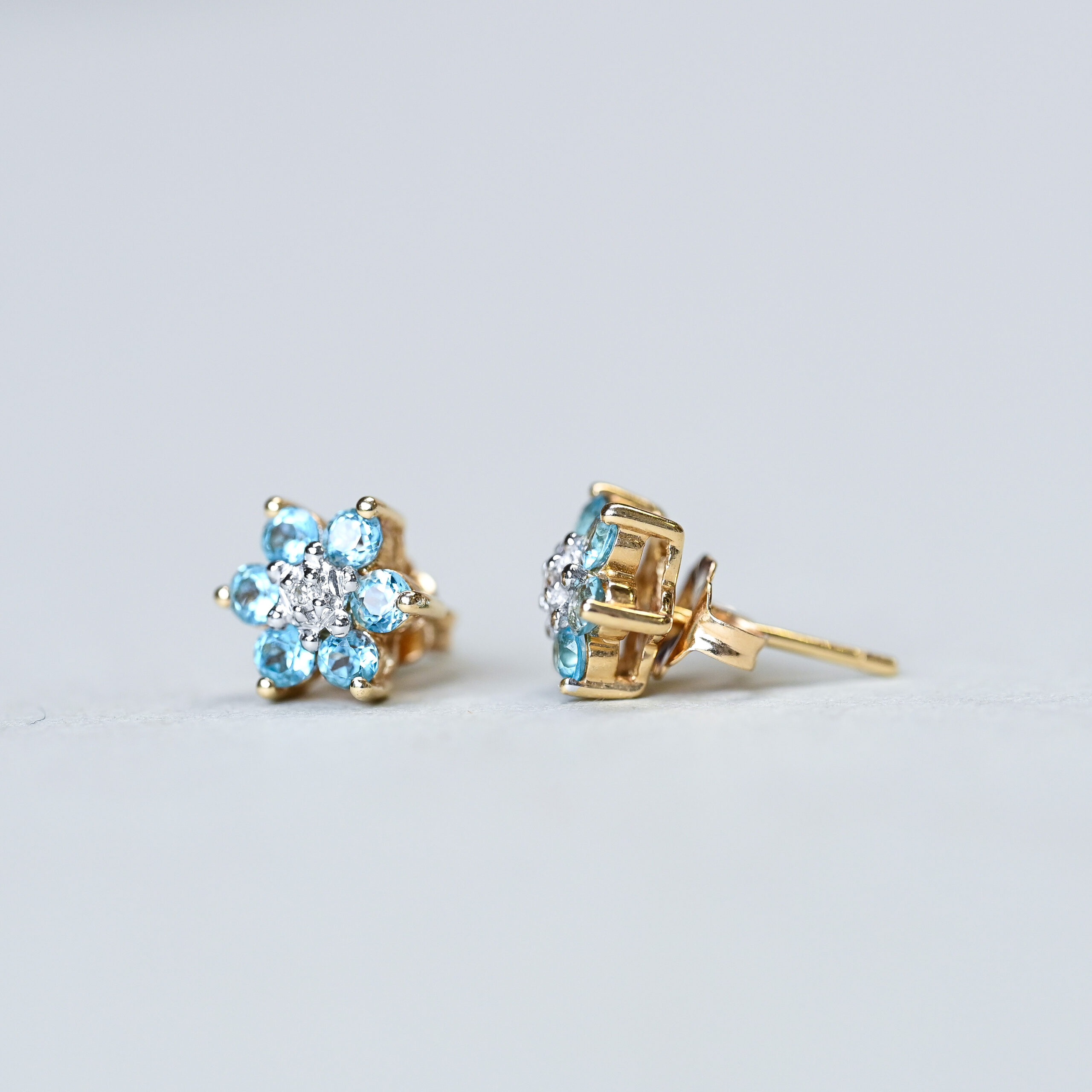 A classically designed pair of 14ct gold topaz and diamond cluster earrings. Each earring is claw set with six round sky blue topaz and a central brilliant cut diamond. The topaz are well matched and catch the light beautifully. With posts and butterfly scroll fittings. Please note the box shown is for demonstration purposes.