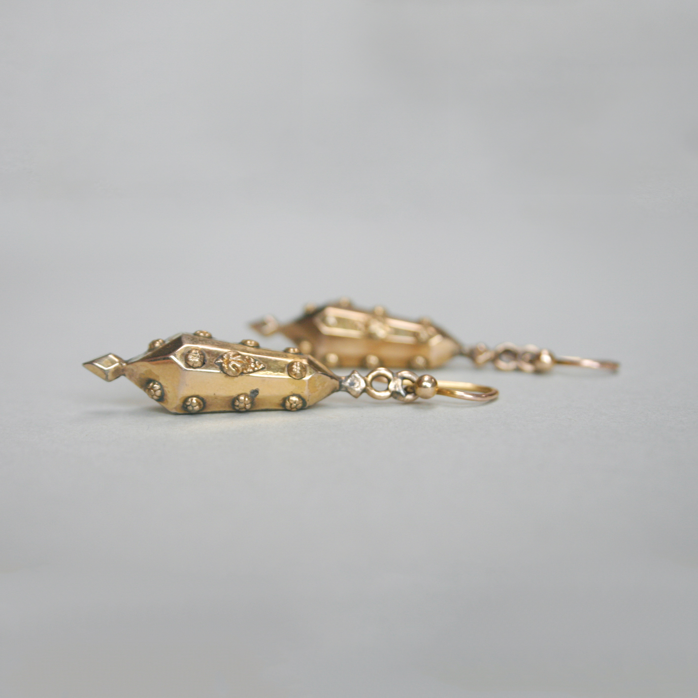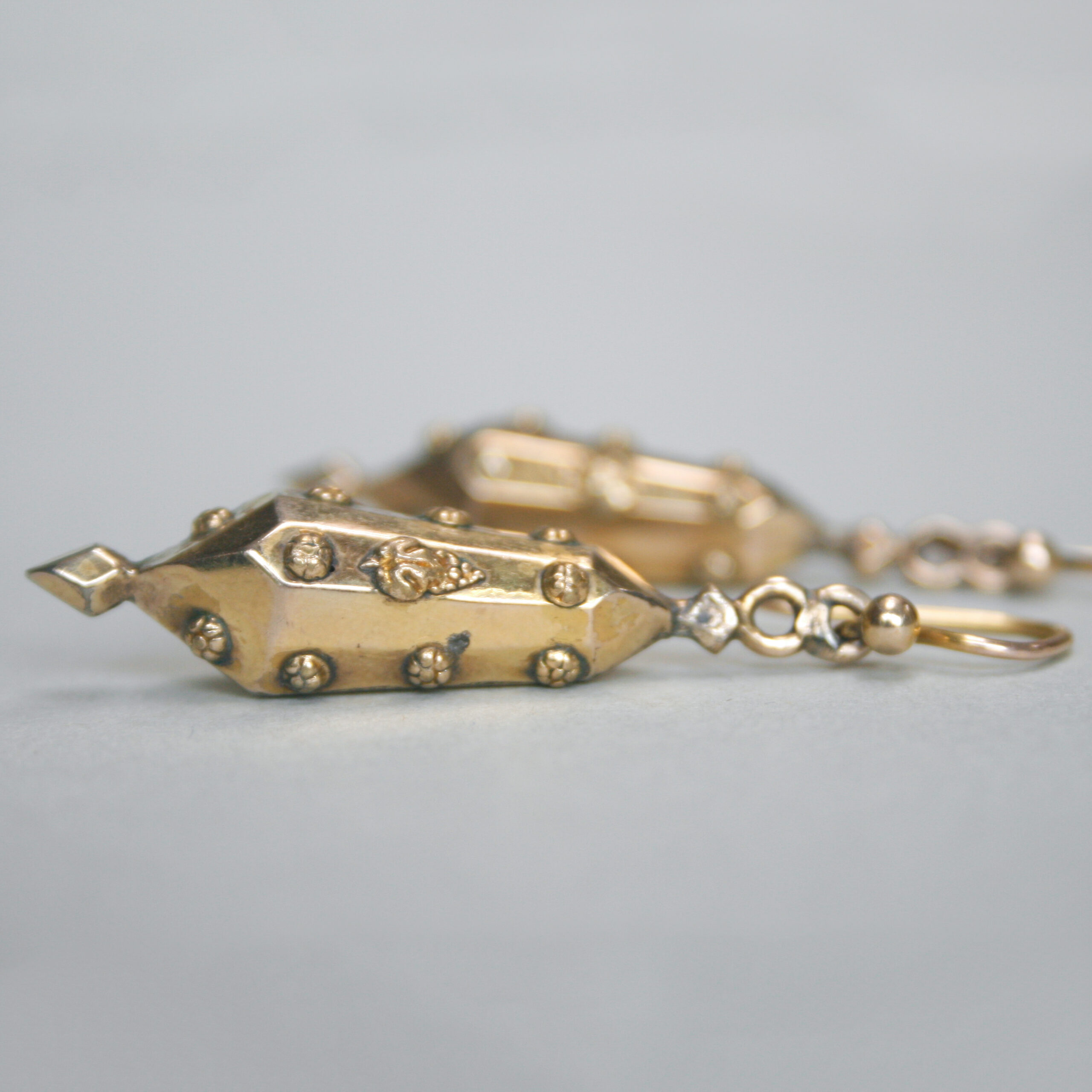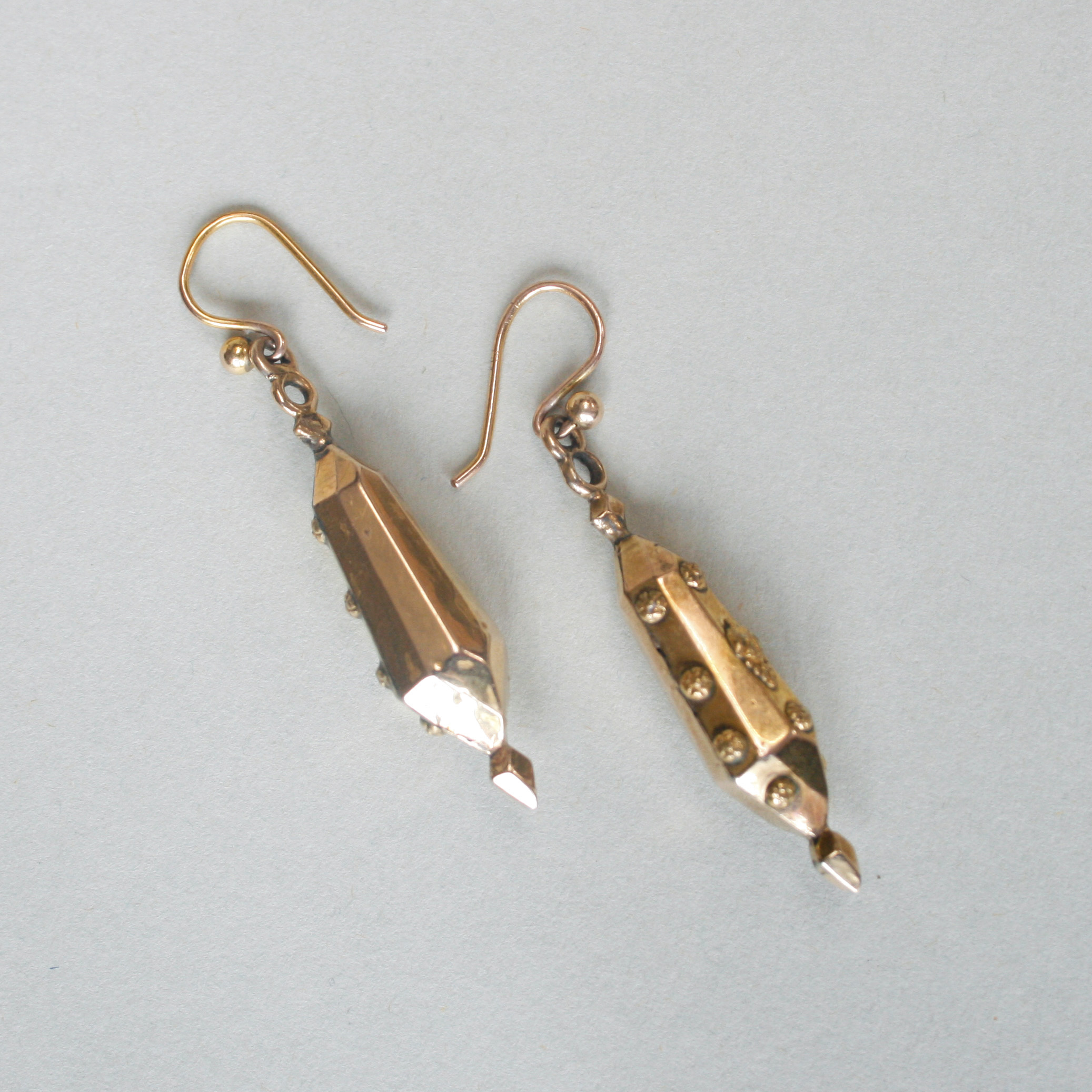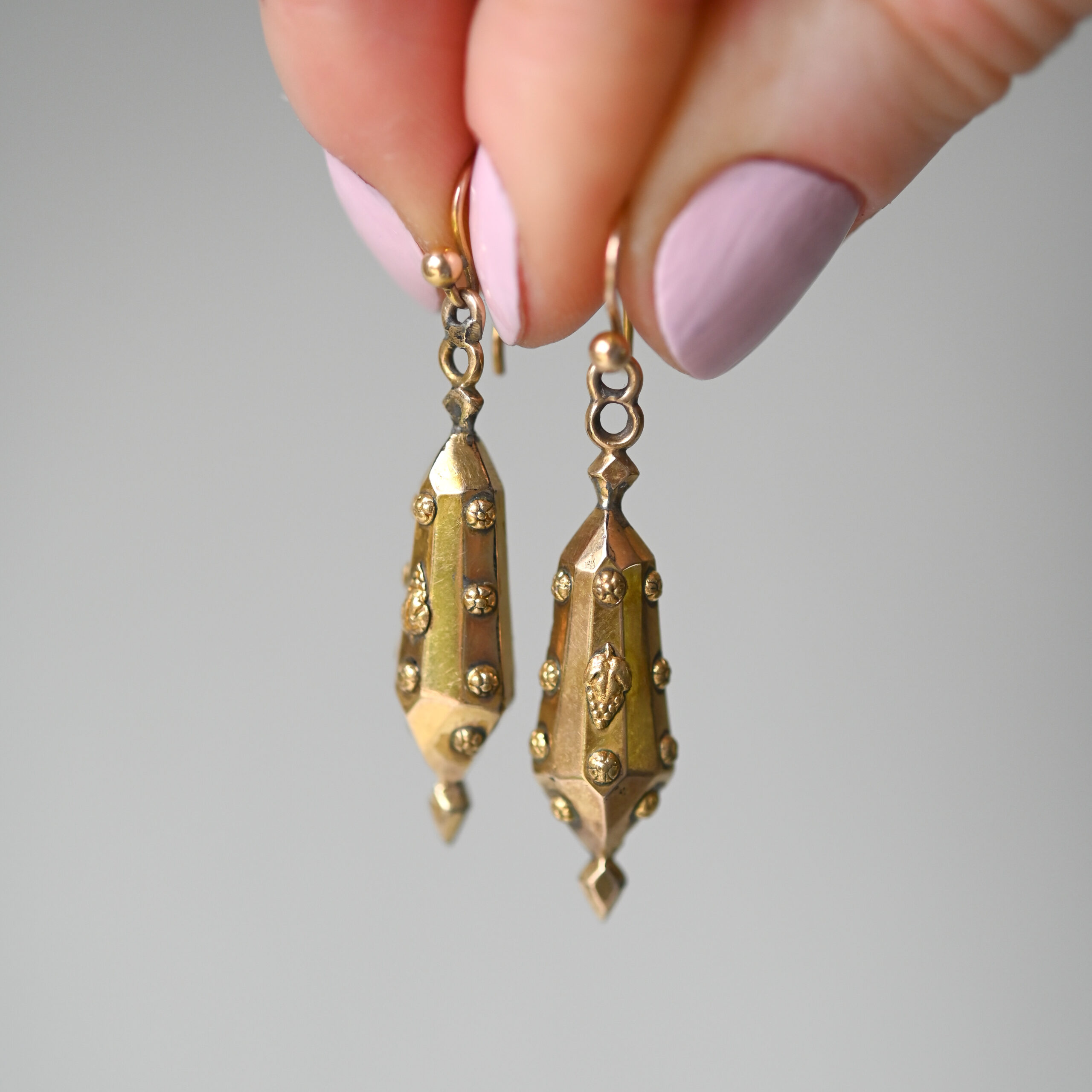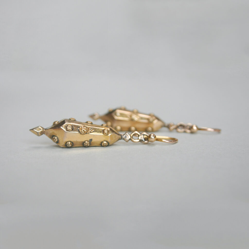 A meticulous pair of 9ct gold antique earrings, designed as facetted torpedo style drops. Each earring has been finely detailed with embossed flower heads and sweet bunches of grapes. Suspended from hook fittings, they create gorgeous movement and glisten in the light. Dating to c. 1880s, fitting neatly into the Victorian era. A very pretty pair of antique English 9ct gold earrings.