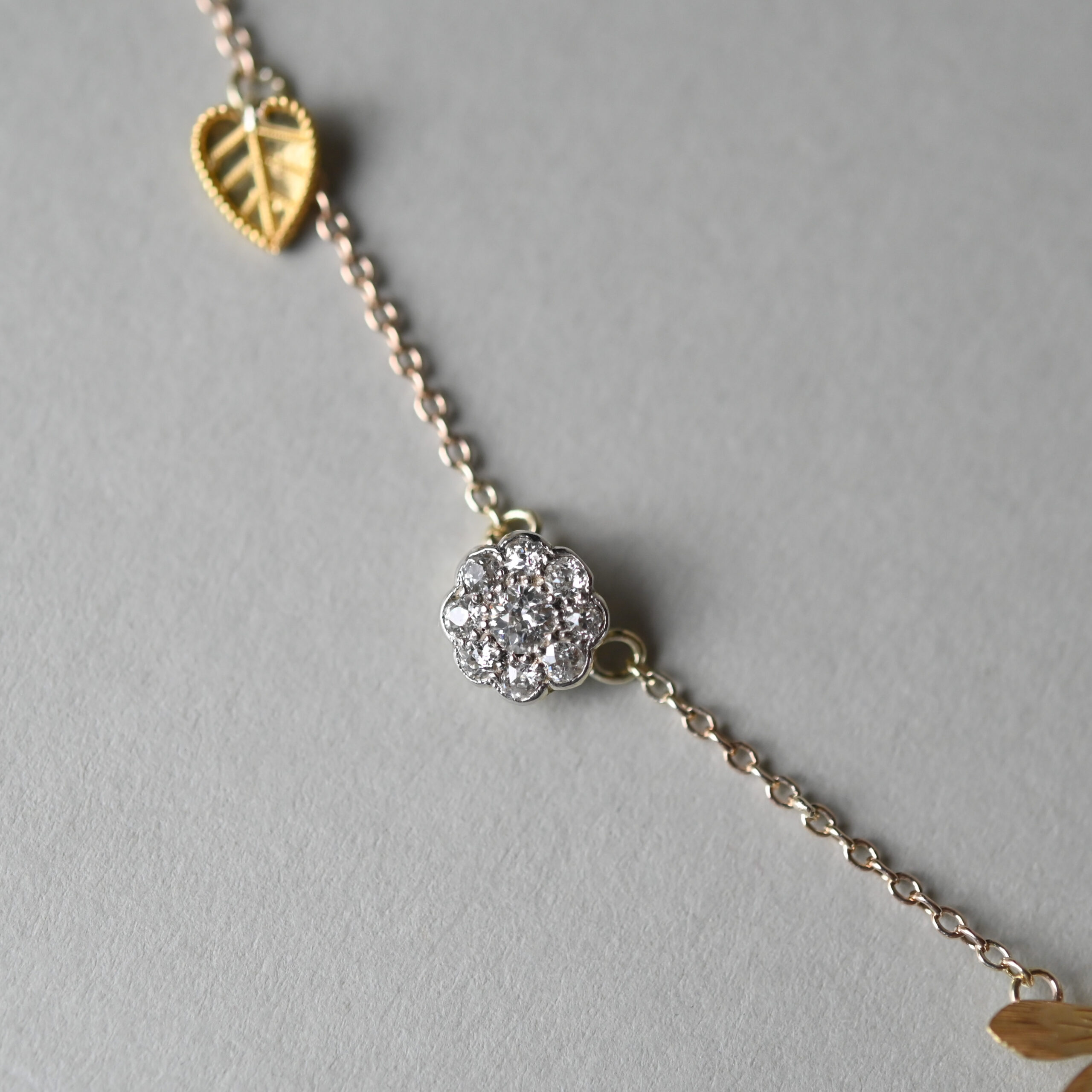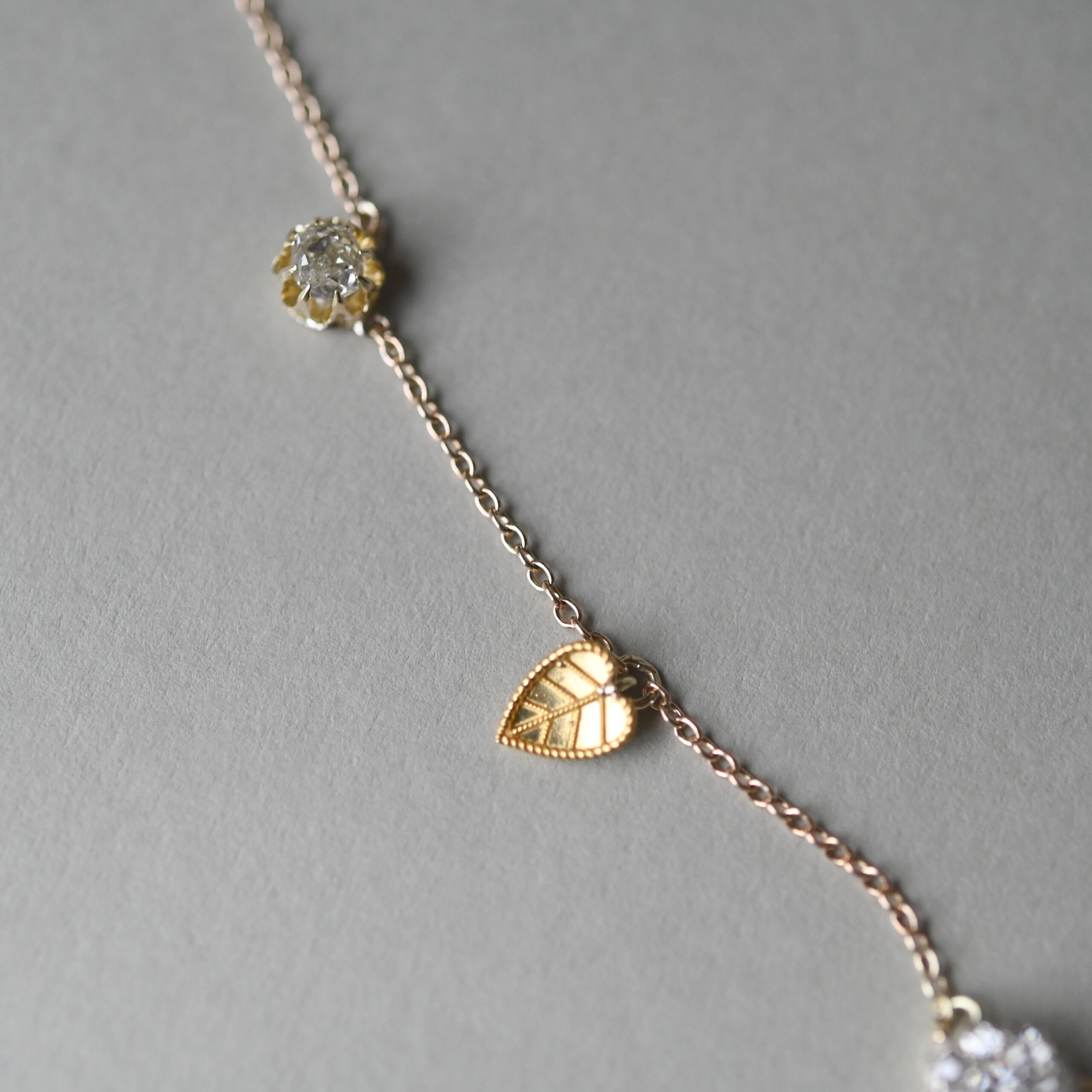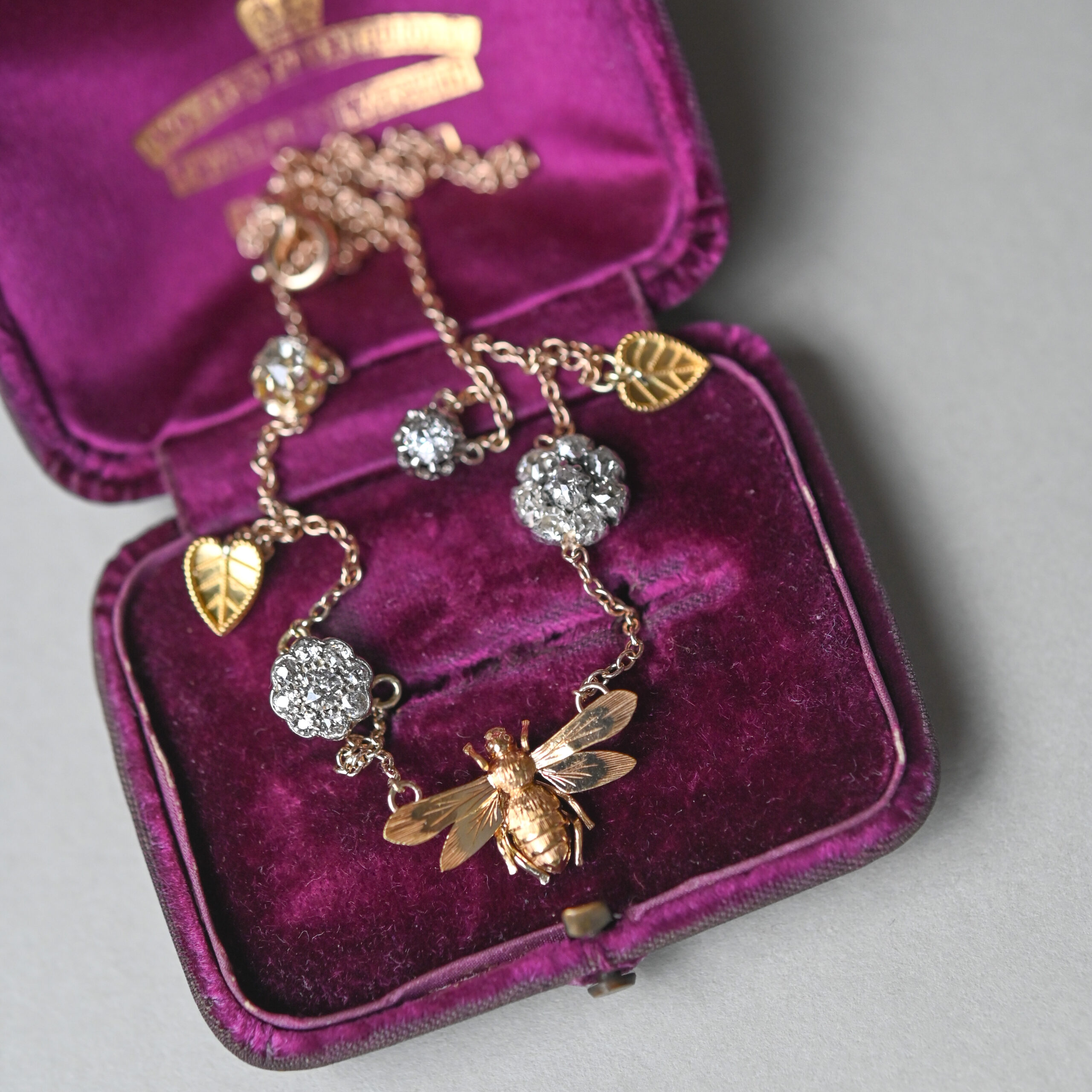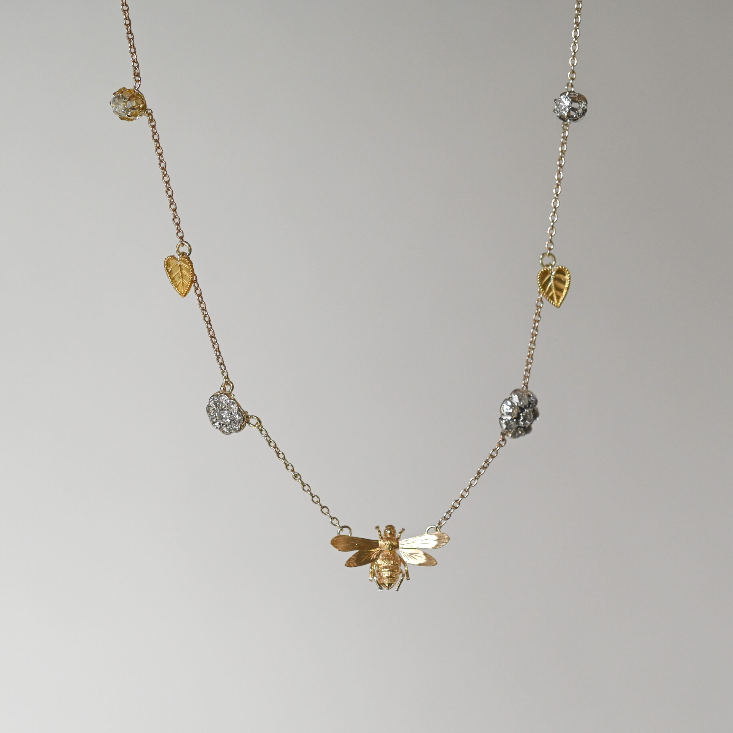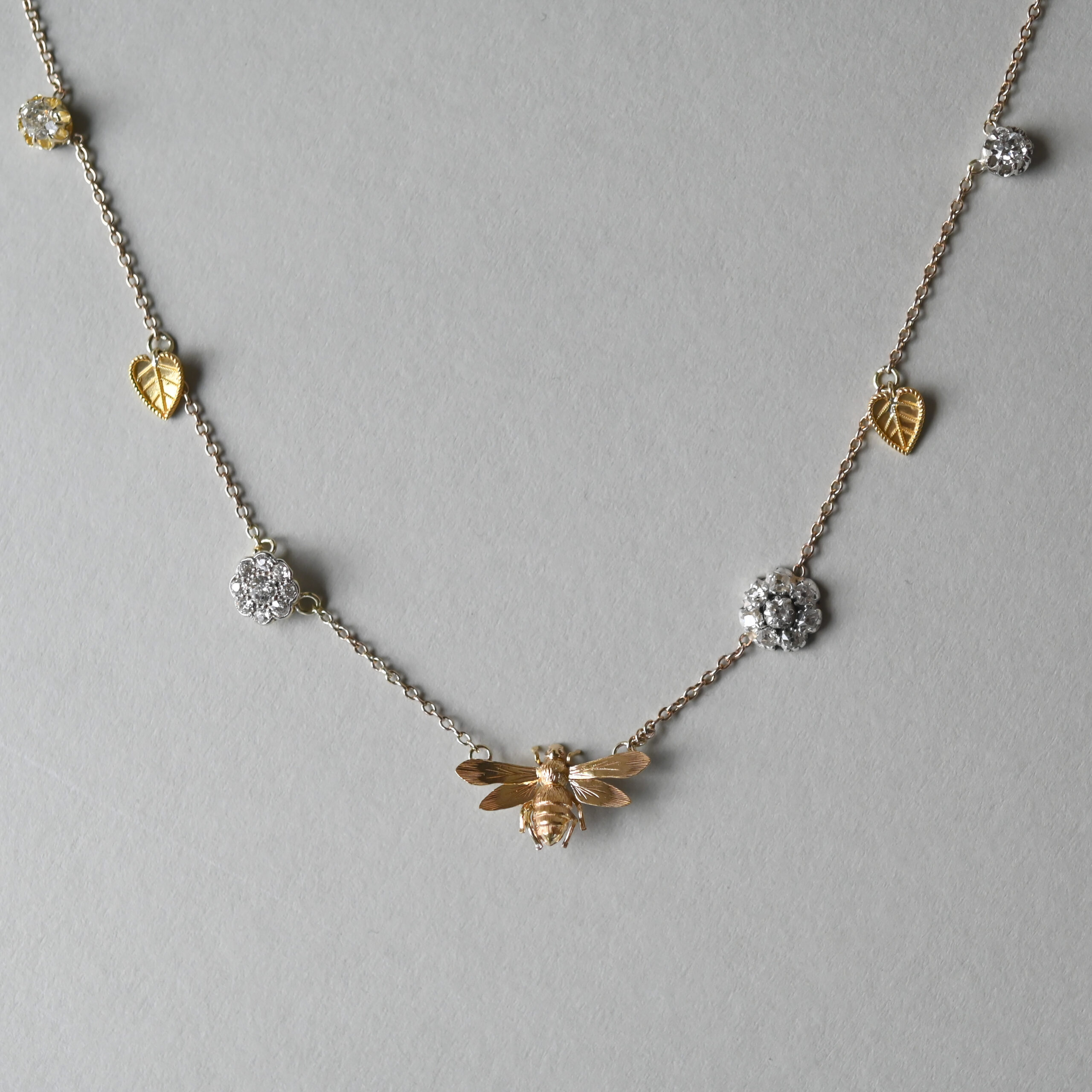 A beautiful, bespoke antique necklace lovingly made from Victorian and Edwardian jewellery components. This sweet honeypie has a 15ct gold, finely engraved honey bee to the centre, gorgeously flanked by old cut diamond floral clusters set in gold and silver, cannetille leafy gold drops and delicious solitaire diamonds. Suspended from a sturdy pendant chain with spring clasp. The bee measures 20 mm x 12 mm and the floral clusters measure 9 mm and 7 mm in diameter. An estimated total carat weight of 1.10 diamonds. Please note the box shown is for demonstration purposes.