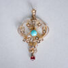 This aesthetically designed 9ct gold necklace dates to the turn of the 20th century and fits into the Edwardian era. Designed as an openwork circular pendant with a lily of the valley flower, sweetly detailed with turquoise and pearl. The pendant measures mm in diameter. Suspended from a sturdy chain with spring clasp. Please note the box shown is for demonstration purposes. A beautiful piece of antique English jewellery perfect to wear on its own or stack with others.