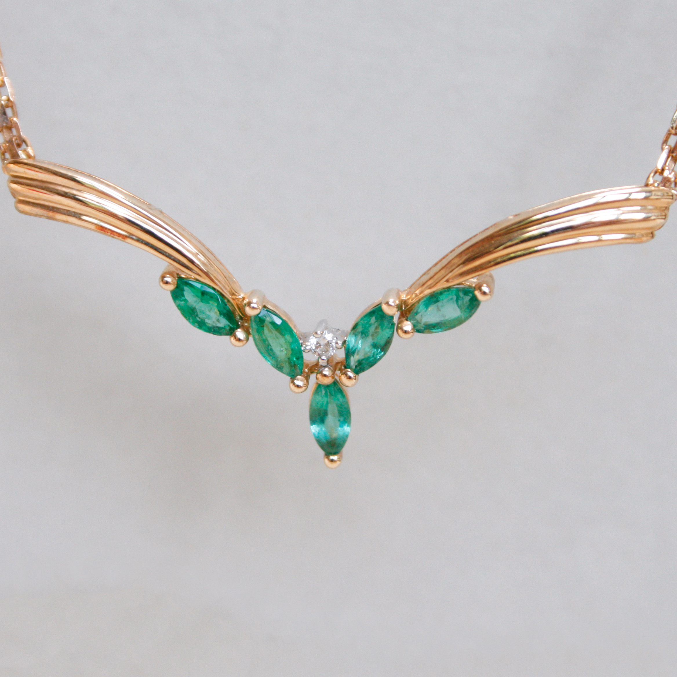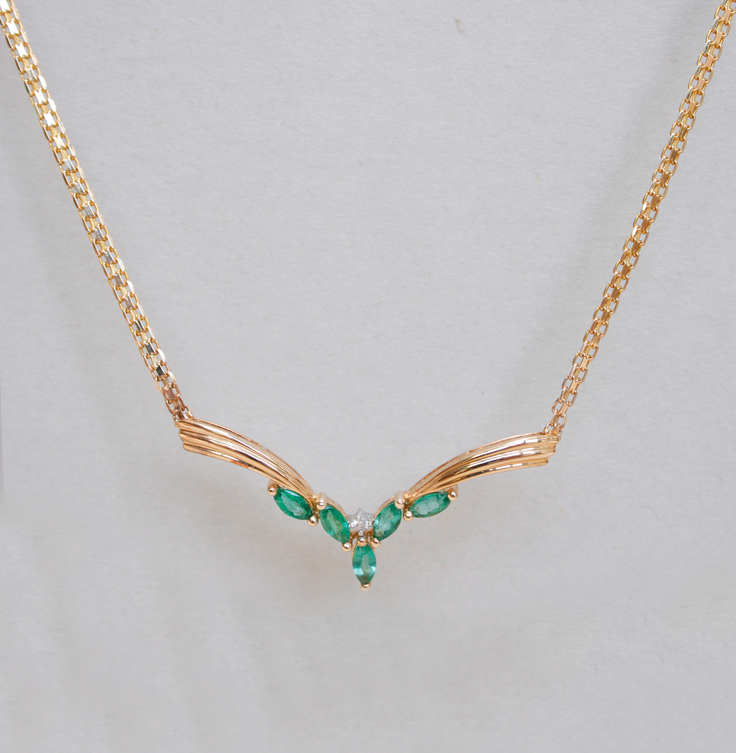 This visually pleasing, contemporary necklace is set with an emerald and diamond chervon pendant and integral fancy link 14ct gold chain. The marquise shape emeralds are Colombian and measure 5 mm x 3 mm each. With a central 2 point round cut bright and lively diamond. The chevron measures 38 mm long and the total drop measures 16 mm. Suspended from a sturdy flat and fancy link chain that measures 2 mm wide, with a push close clasp and safety catch. A beautiful piece to wear on its own or stack with others. Maker’s mark CEI for Colombian Emeralds International.