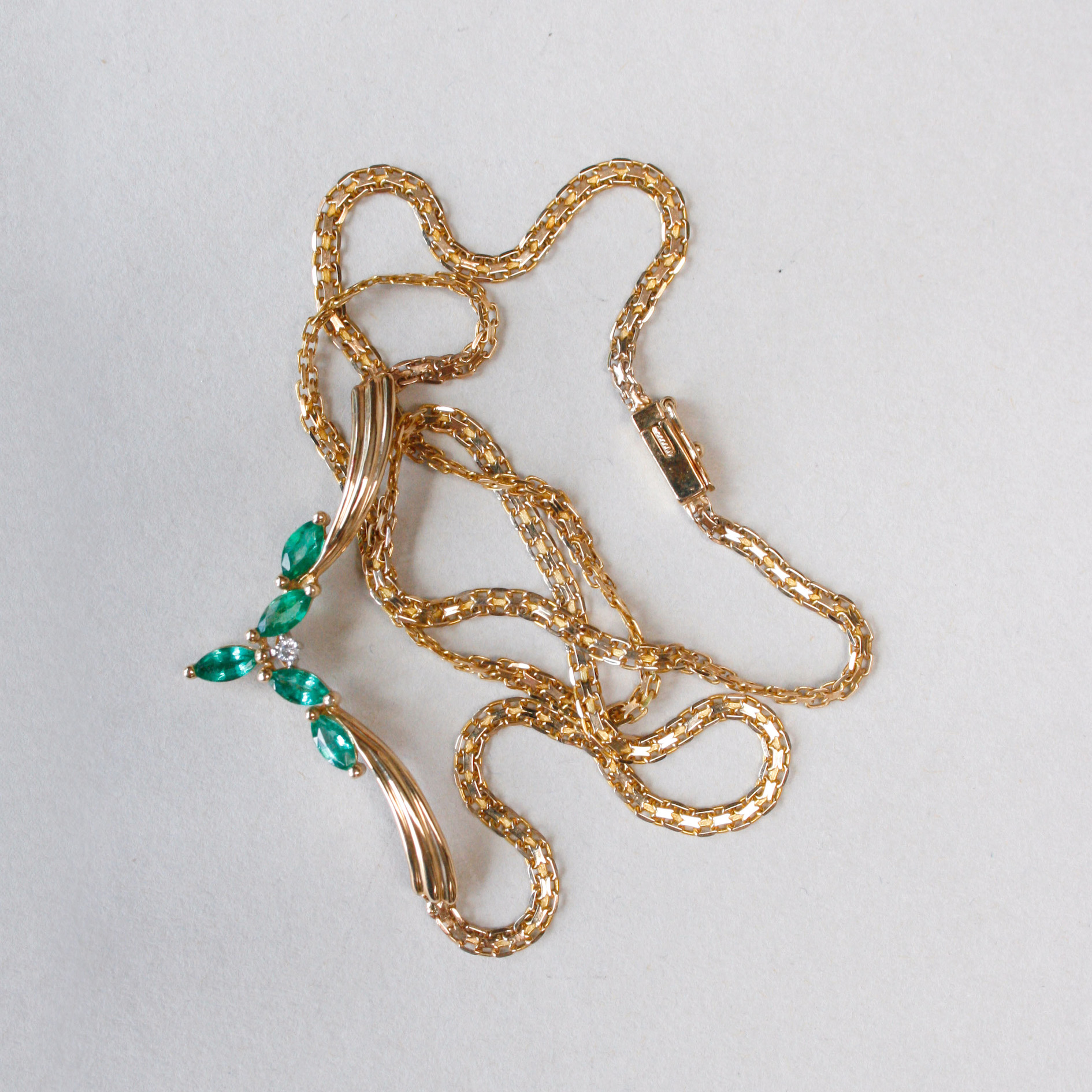 Contemporary 14ct gold Colombian emerald and diamond necklace