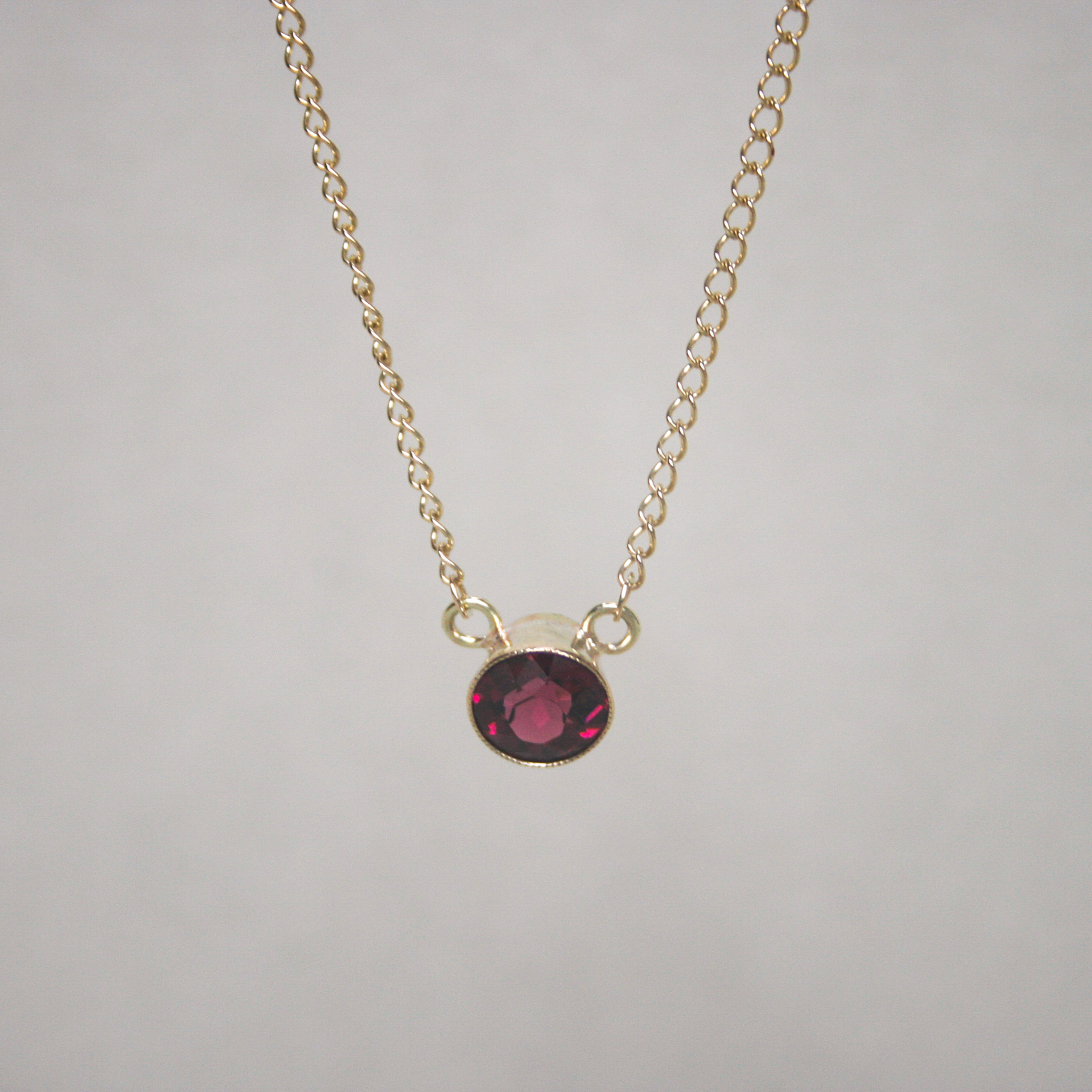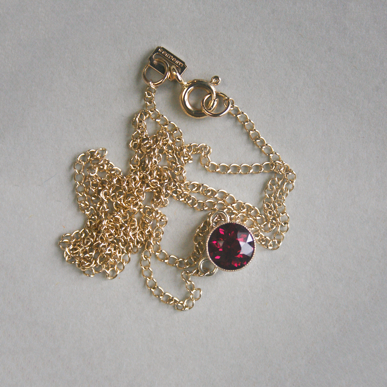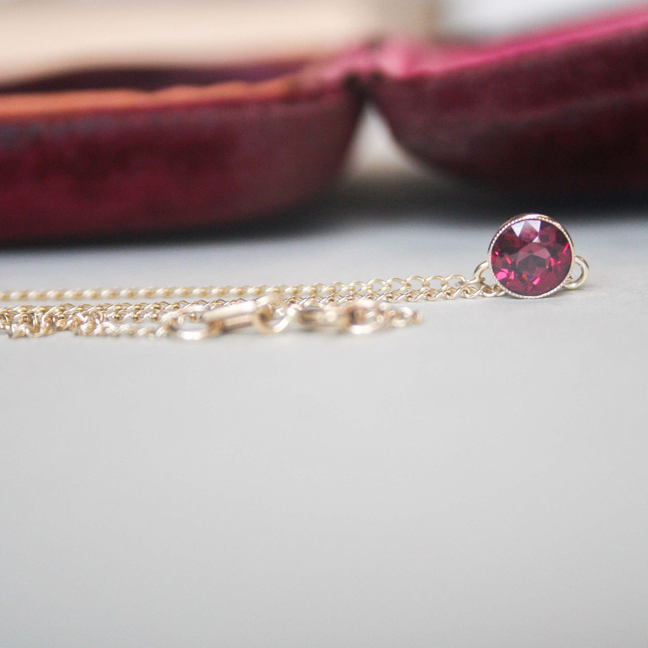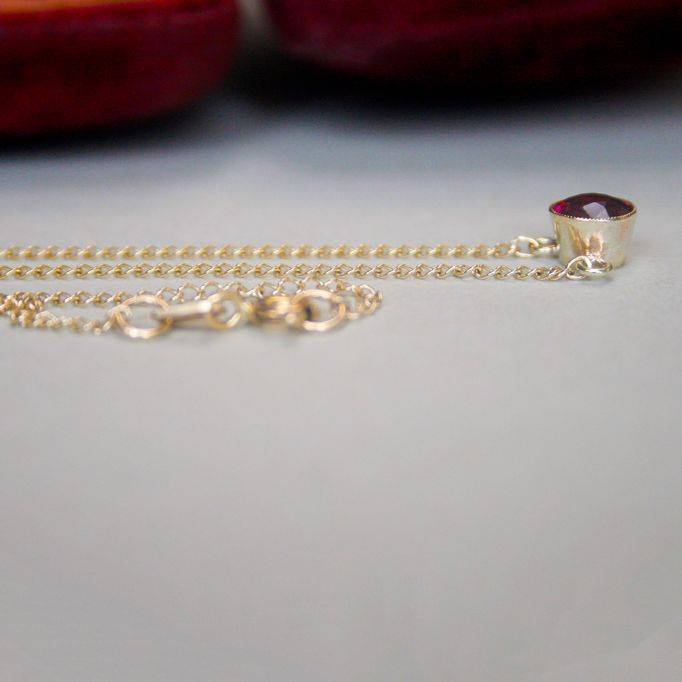A cutie 9ct gold necklace bezel set with a rich and deep berry hue garnet. The garnet measures 6 mm in diameter and was originally part of a c.1940s brooch. Suspended from a fine 9ct gold pendant chain with spring clasp. Please note the box shown is for demonstration purposes. A pretty conversion necklace recently lovingly made from vintage components.