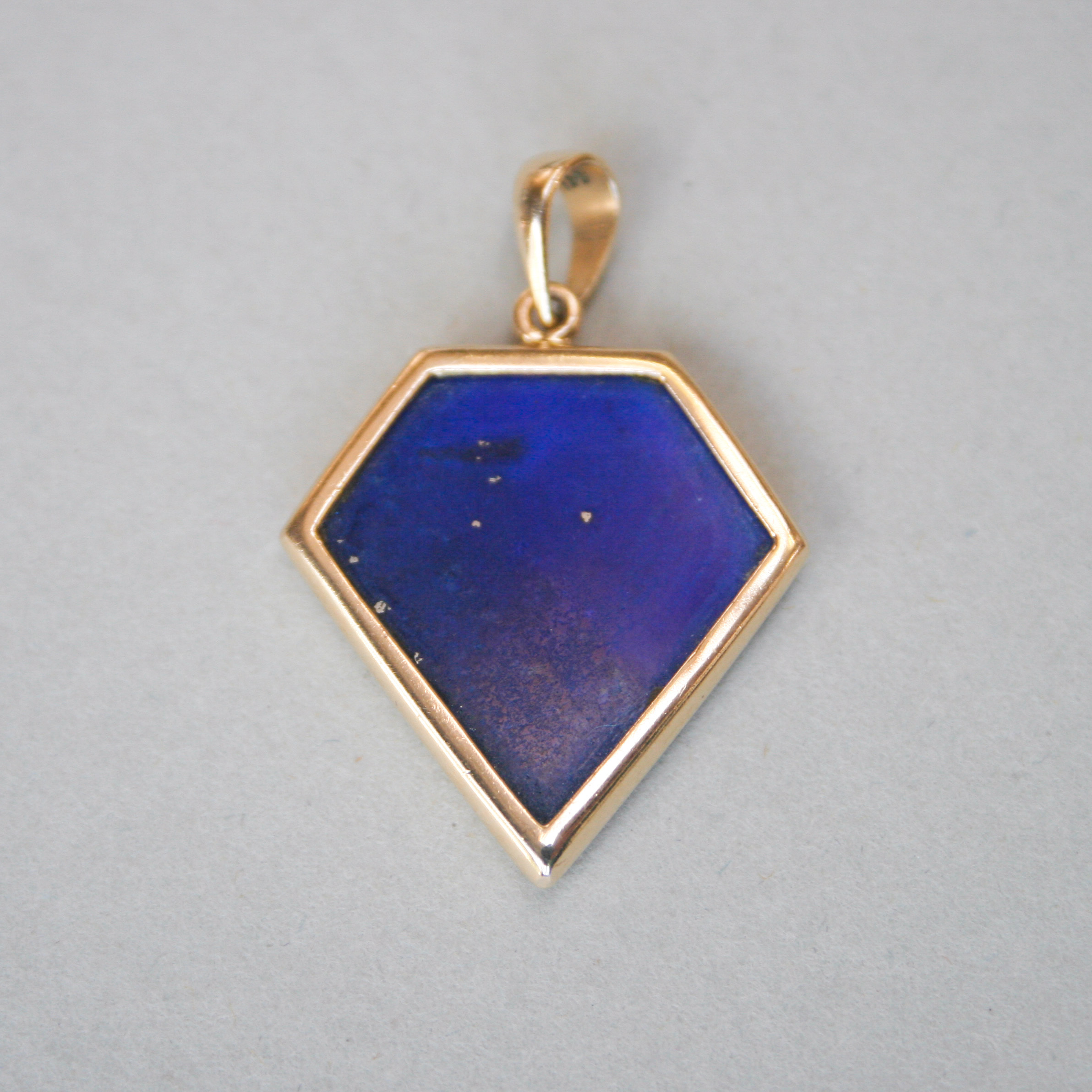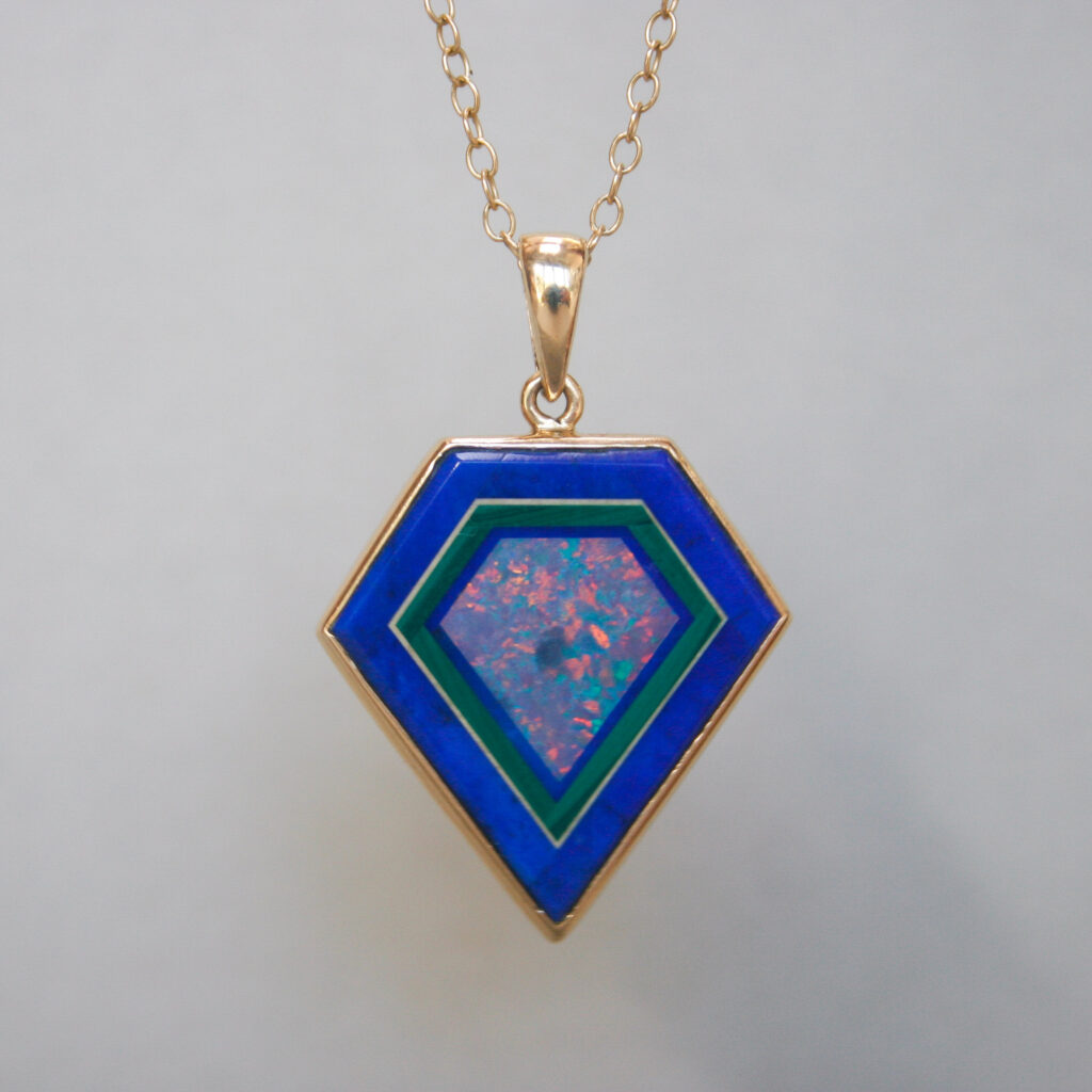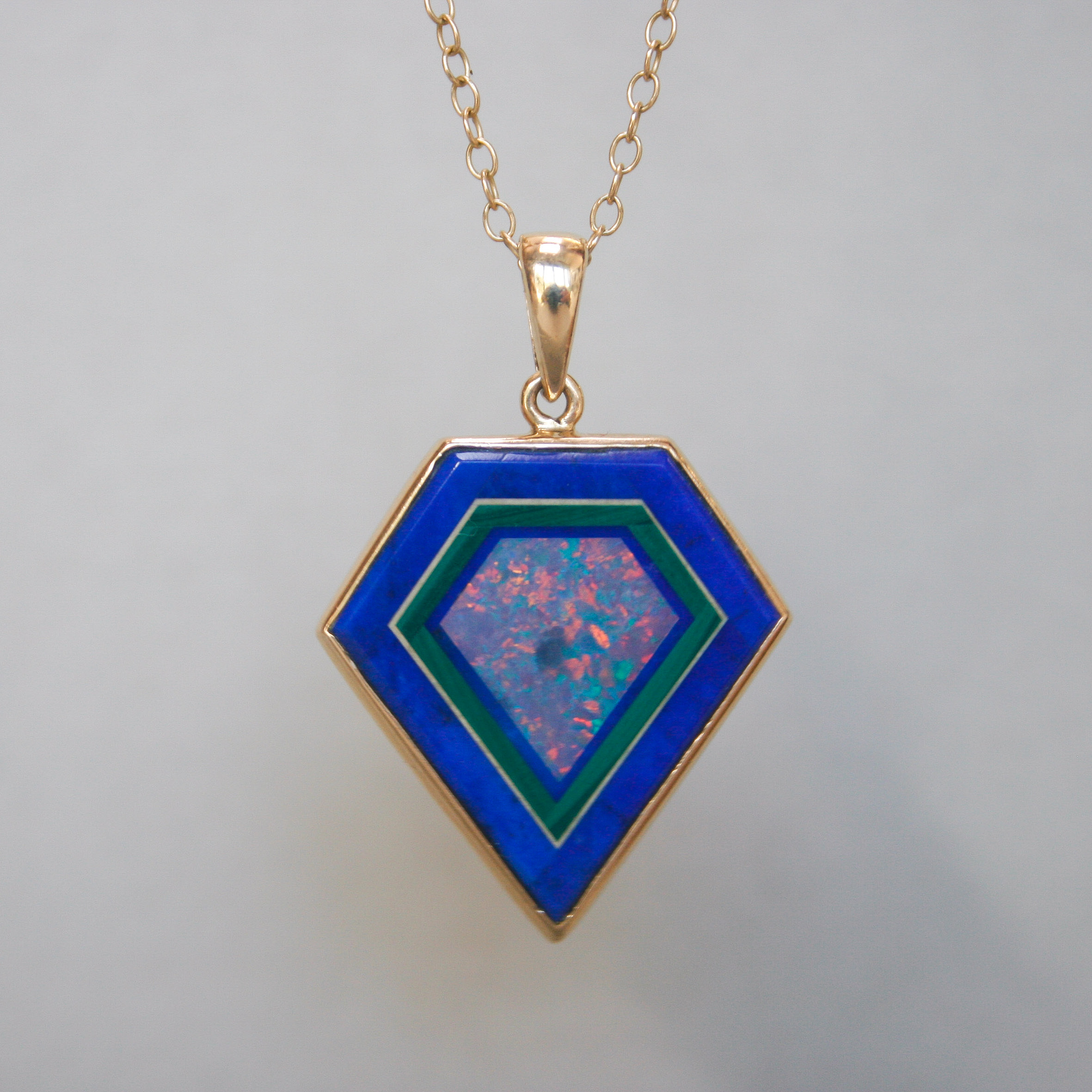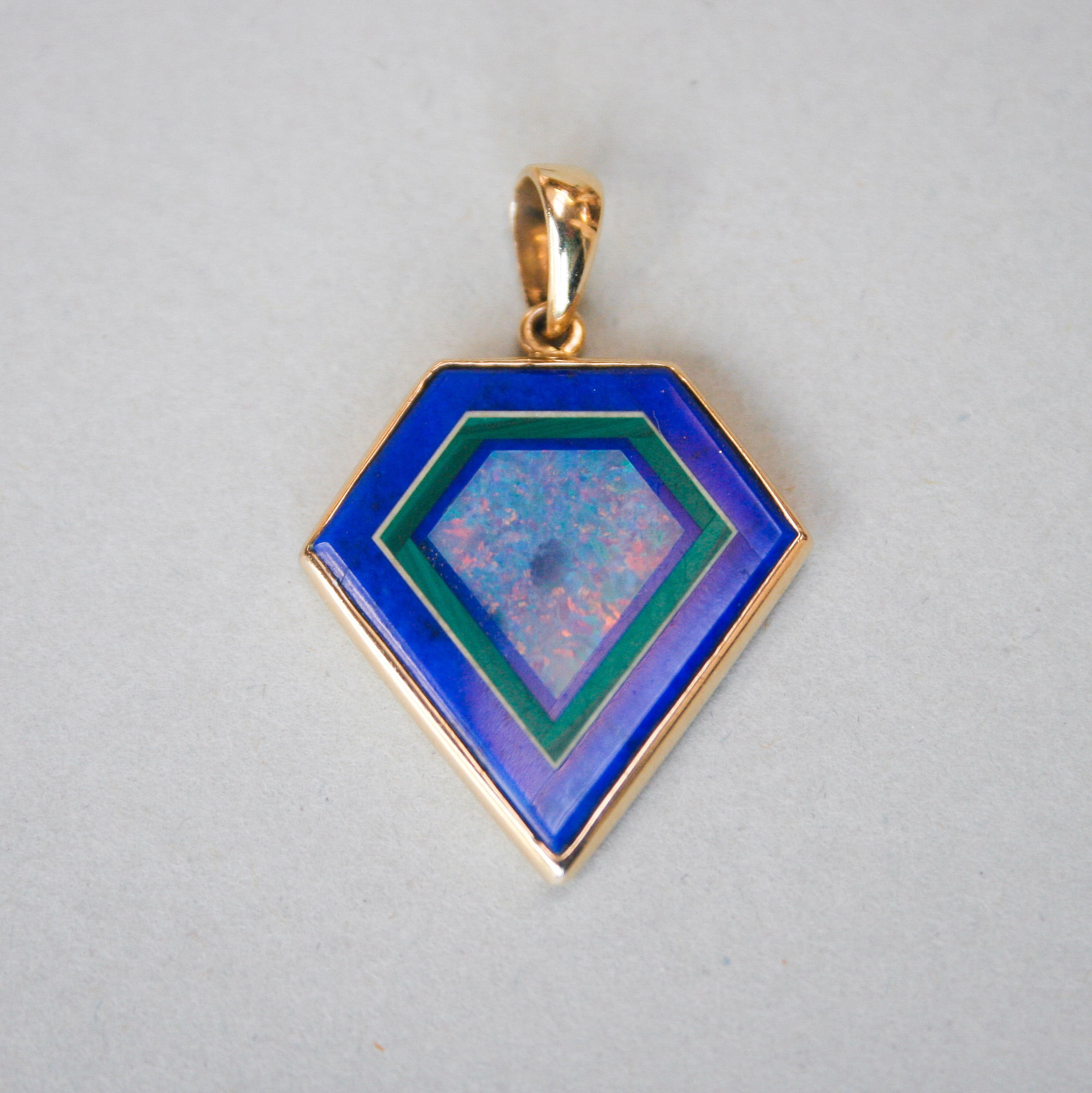A visually pleasing and aesthetic 14ct gold contemporary pendant. Designed as a geometric shield, and beautifully set with lapis lazuli, opal and malachite. The combination of colours and gemstones is both beautiful and unusual. I haven’t seen a piece quite like this before. Likely to be a unique and bespoke made jewel. Dates to the early 21st century. Please note the chain shown is for demonstration purposes.