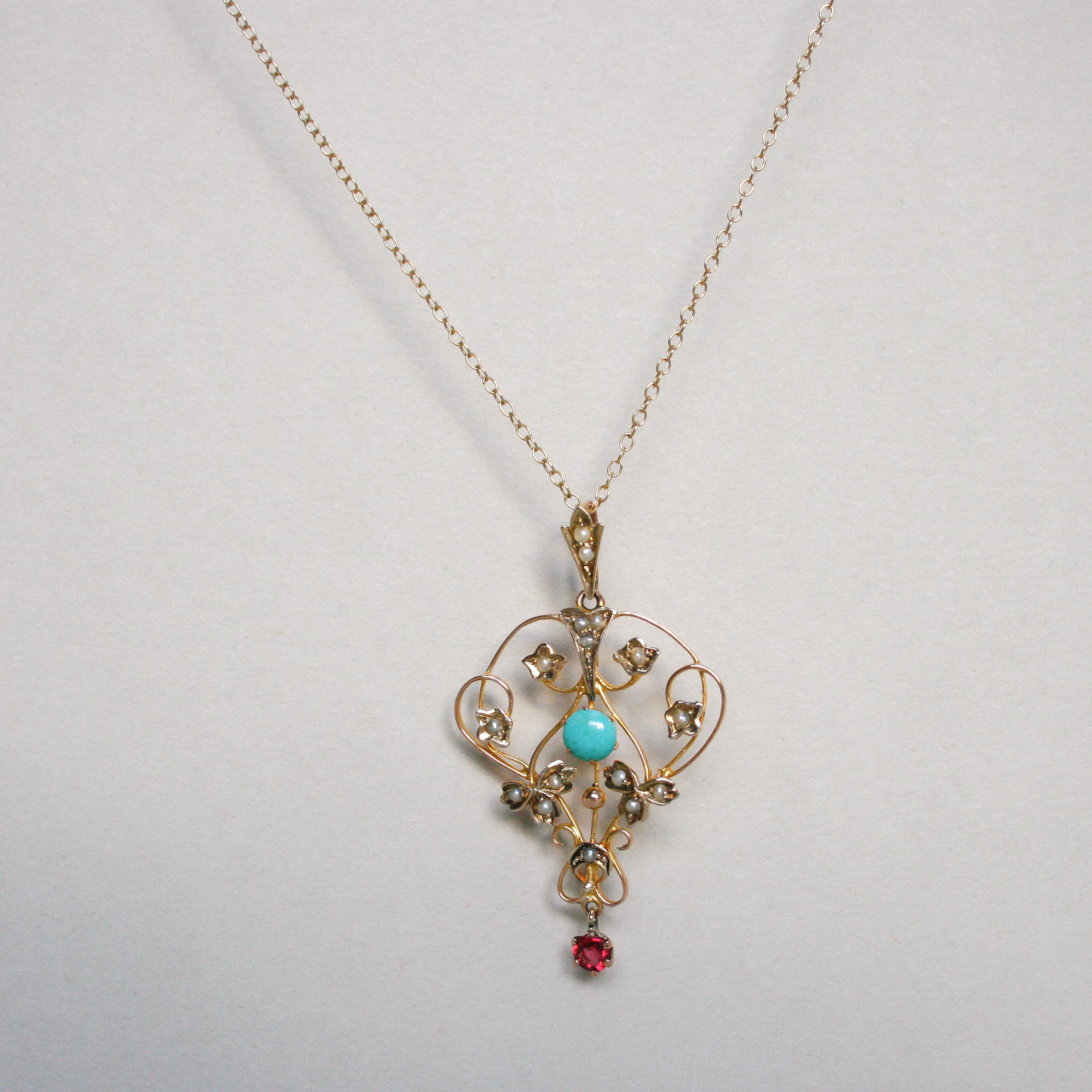 A beautiful Edwardian pendant dating to the early 20th century, c.1910. Designed with Art Nouveau influences and gorgeous flowing leaf and tendril forms. This pretty piece is set with graduated lines of creamy white seed pearls, a turquoise cabochon and a sweet berry hue garnet drop suspended. Set within an openwork foliate detail frame and a suspended from a pearl set trefoil bail. Please note the chain shown is for demonstration purposes. An aesthetic piece of English antique 9ct gold jewellery with a pretty and unusual combination of gems.