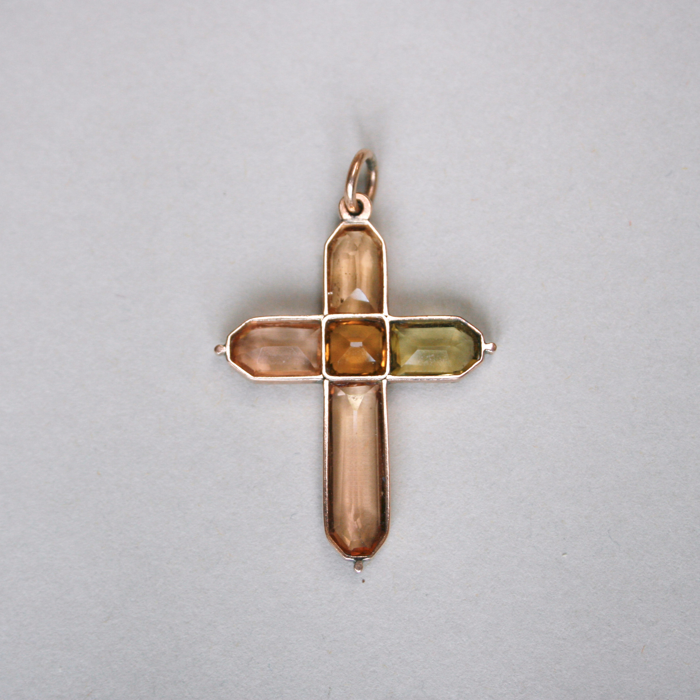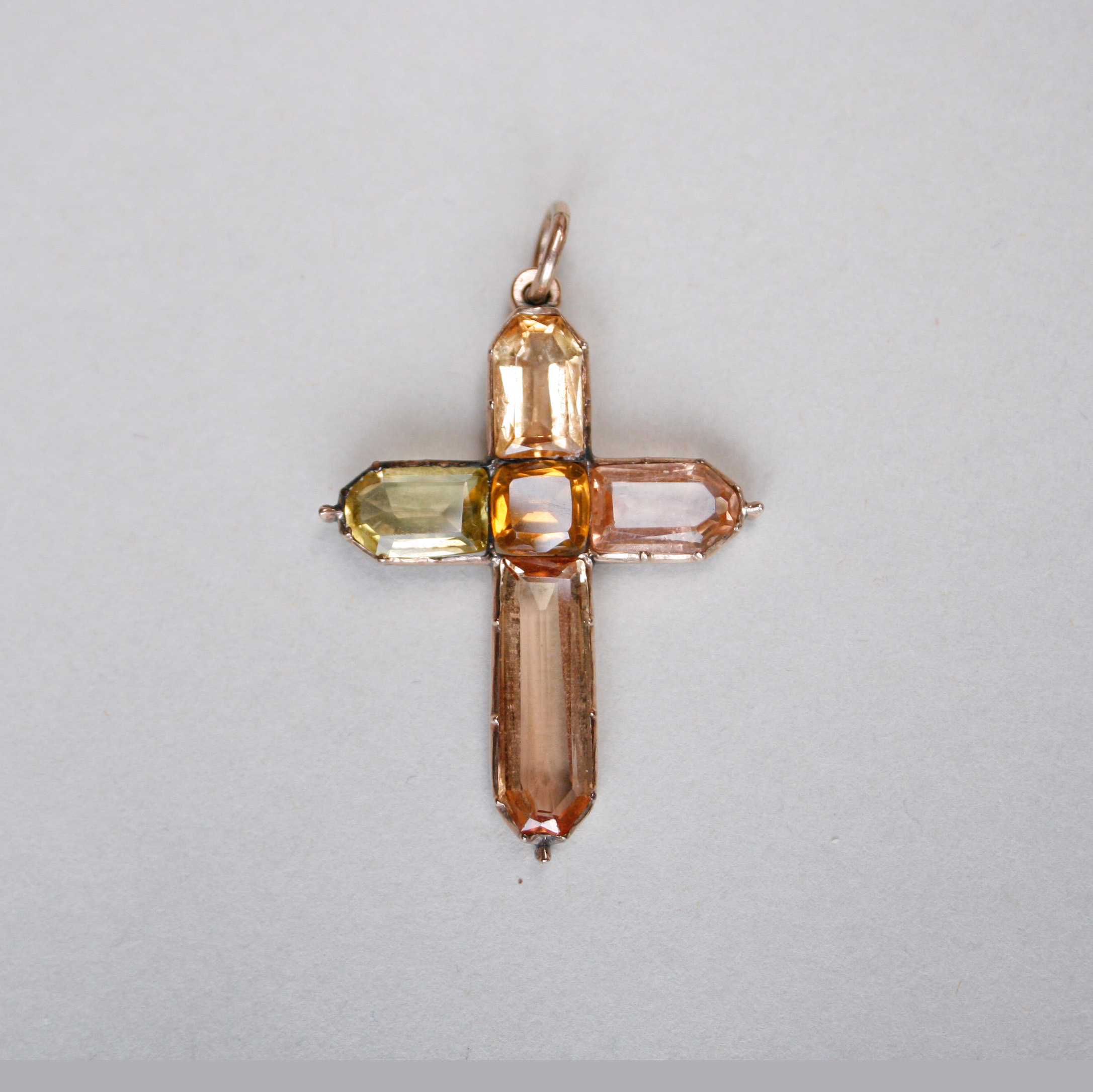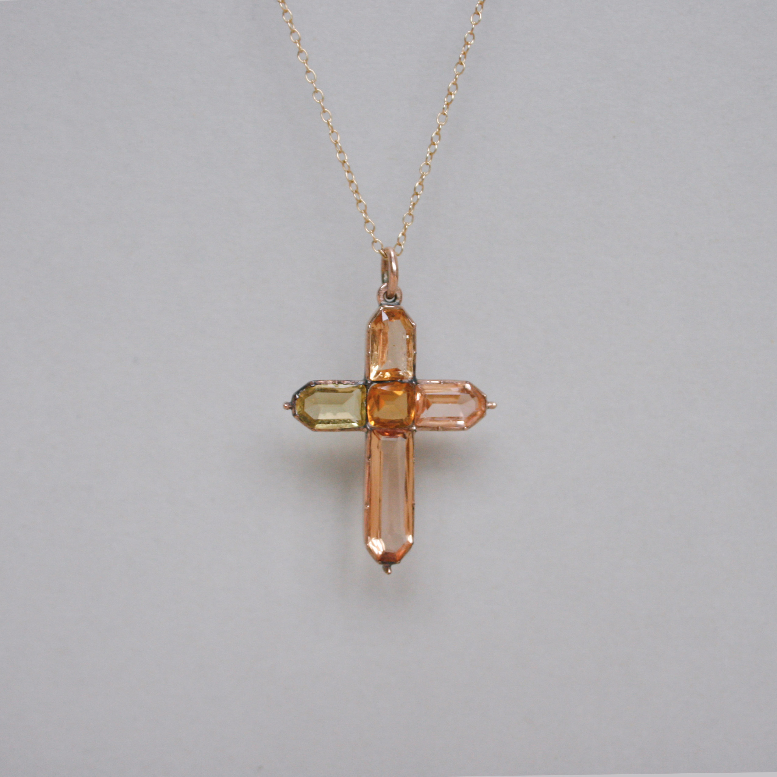 A beautiful antique pendant dating to the first half of the 19th century, fitting neatly between the late Georgian and ealy Victorian eras. Gorgeously set with hand cut citrine, topaz and paste gems in a lovely honey hue ombre palette. Finely detailed with bead finials. The top and bottom gemstones are topaz, the central stone is citrine and the gems on each arm are paste. Please note the chain and box shown are for demonstration purposes. A wonderful example of early English 15ct gold jewellery.