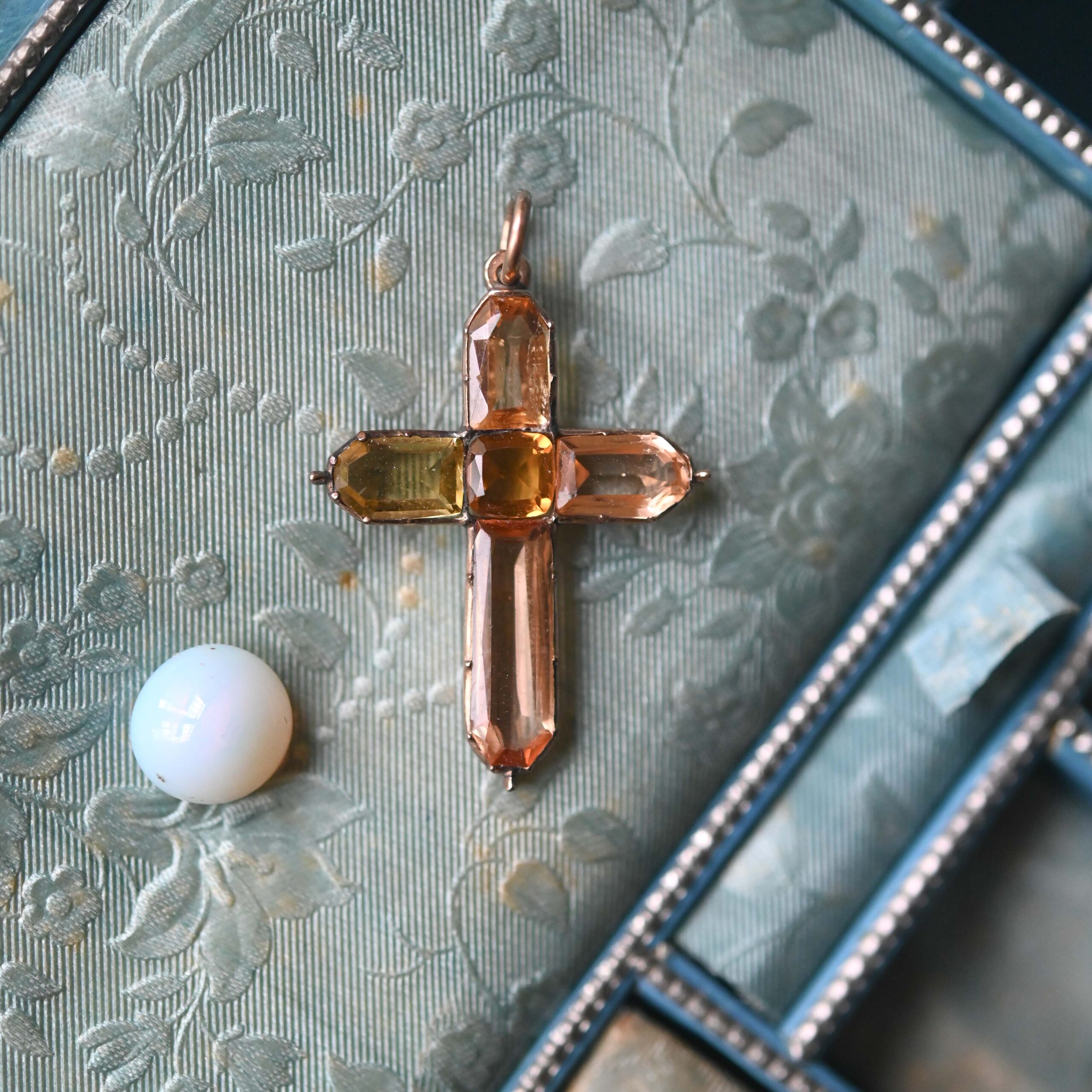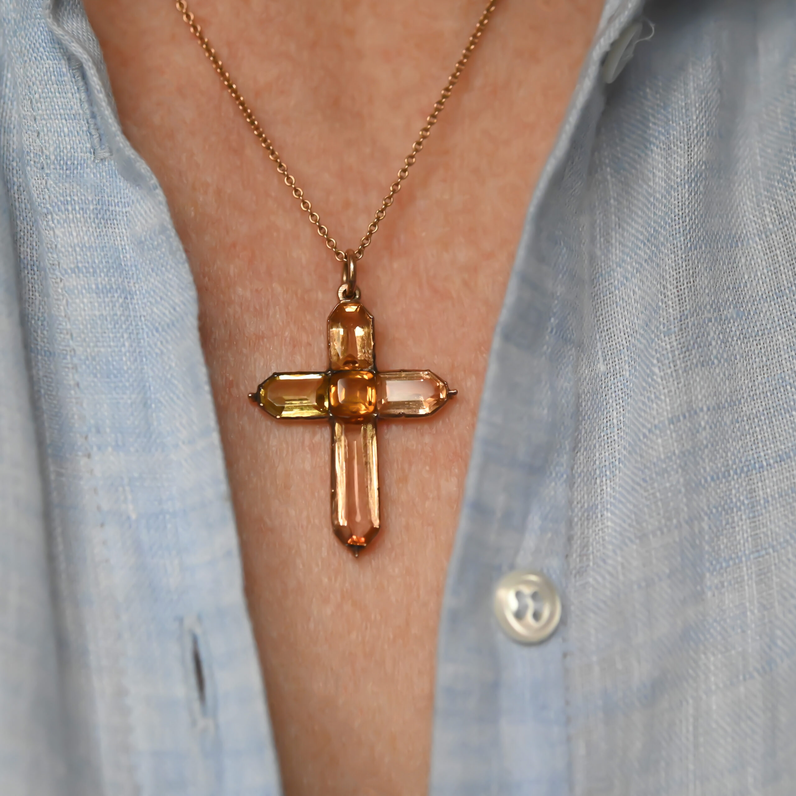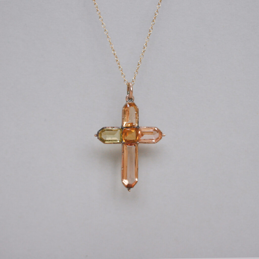 A beautiful antique pendant dating to the first half of the 19th century, fitting neatly between the late Georgian and ealy Victorian eras. Gorgeously set with hand cut citrine, topaz and paste gems in a lovely honey hue ombre palette. Finely detailed with bead finials. The top and bottom gemstones are topaz, the central stone is citrine and the gems on each arm are paste. Please note the chain and box shown are for demonstration purposes. A wonderful example of early English 15ct gold jewellery.