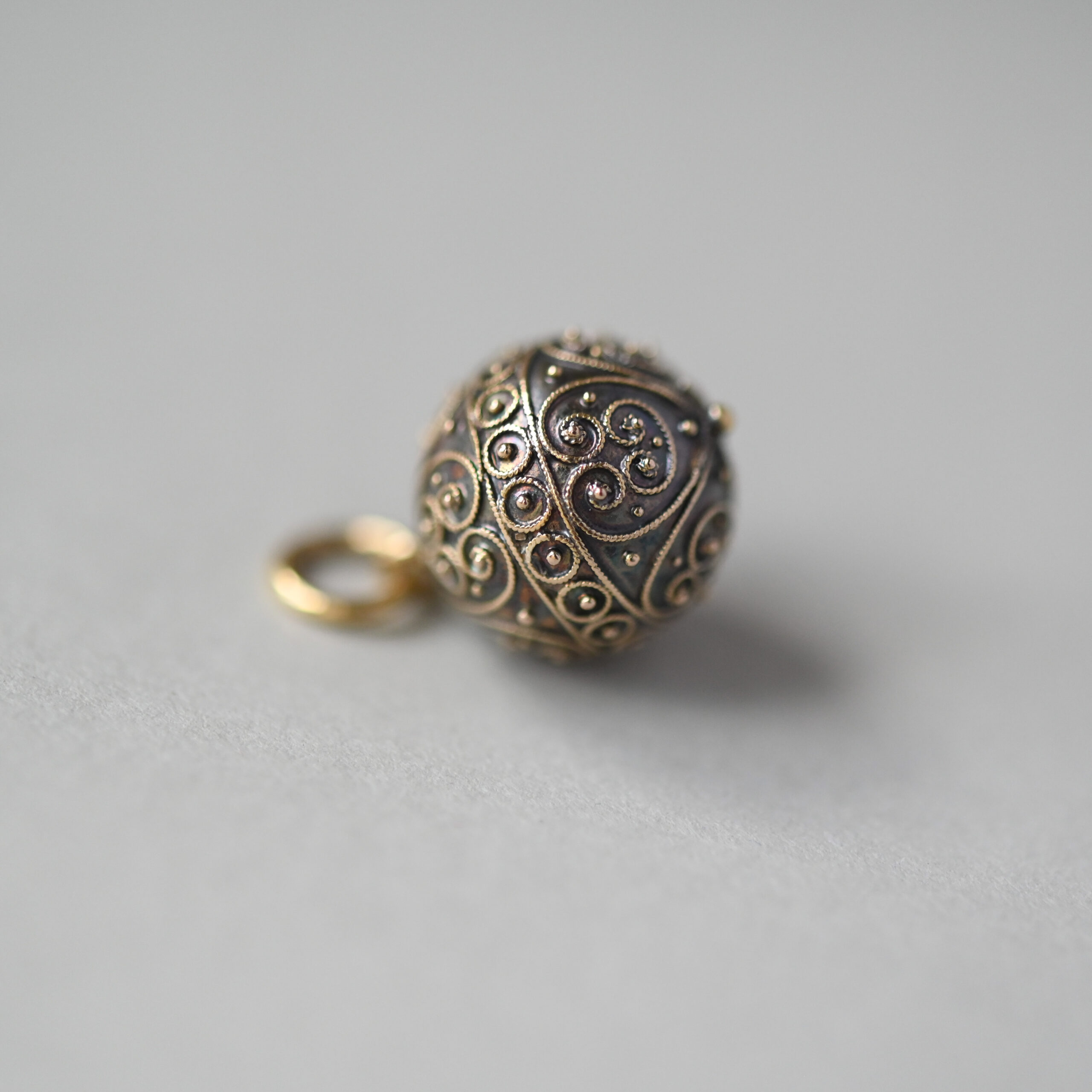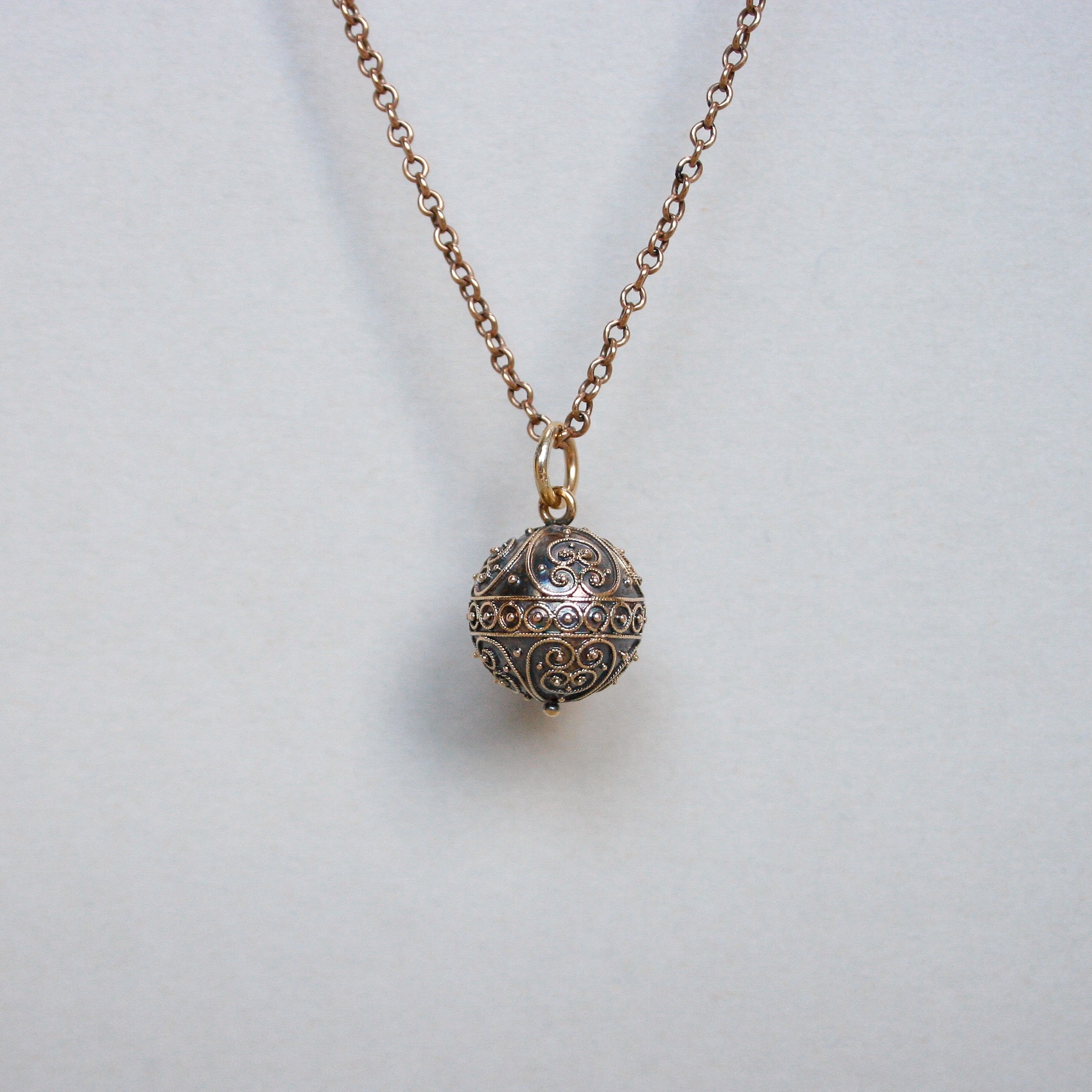 Dating to the c.1890s, this very pretty and sweet antique 15ct gold pendant charm fits neatly into the Victorian era. Designed as an orb with fine cannetille detailing throughout. This piece is tarnished and I wouldn’t recommend rubbing or polishing it due to the applied scroll details. This is, in my opinion, part of its history. Suspended from a plain jump hoop bail. Please note the chain shown is for demonstration purposes. A quintessential piece of English Victorian 15ct gold jewellery.