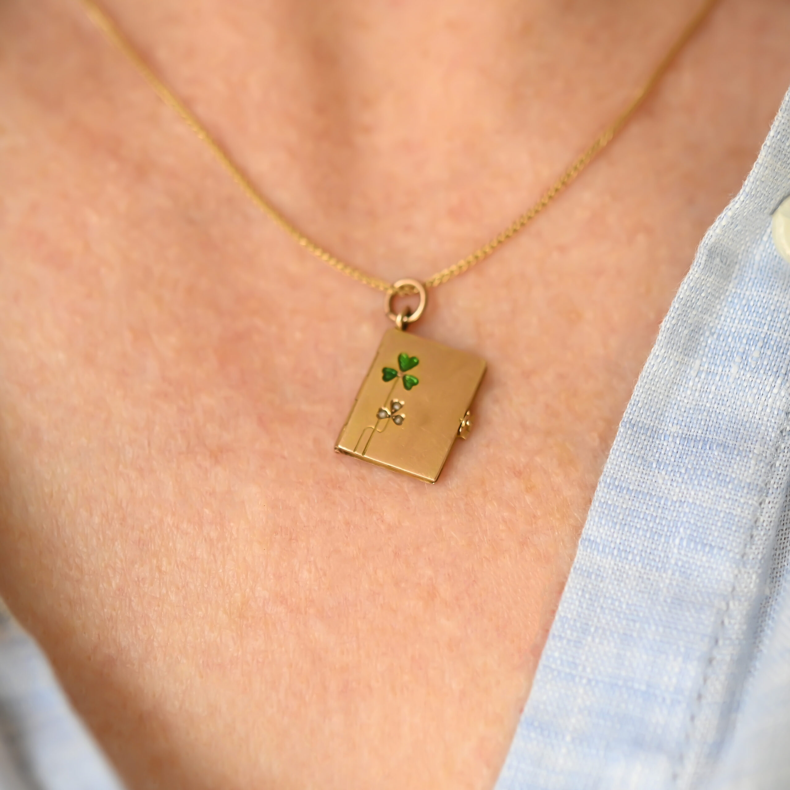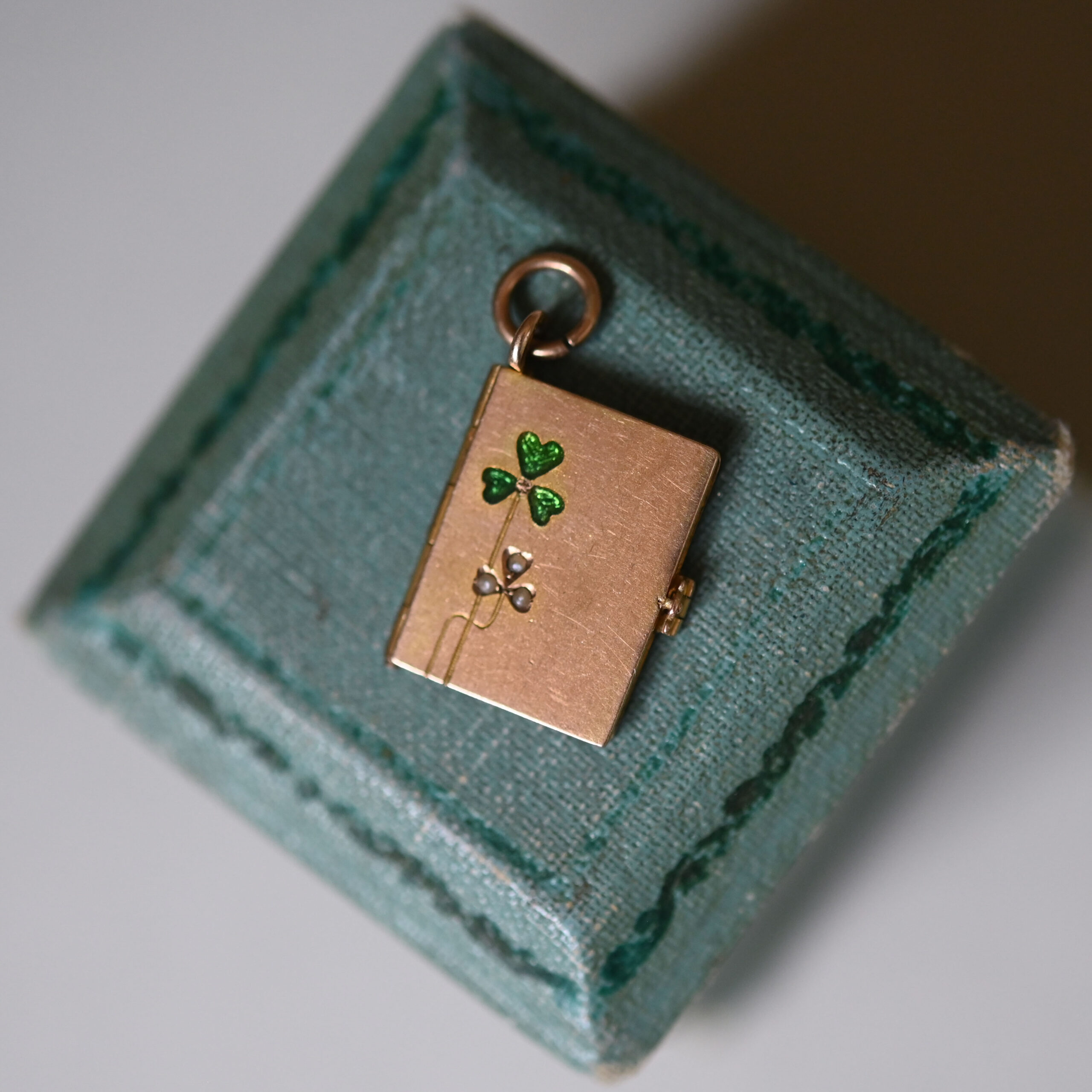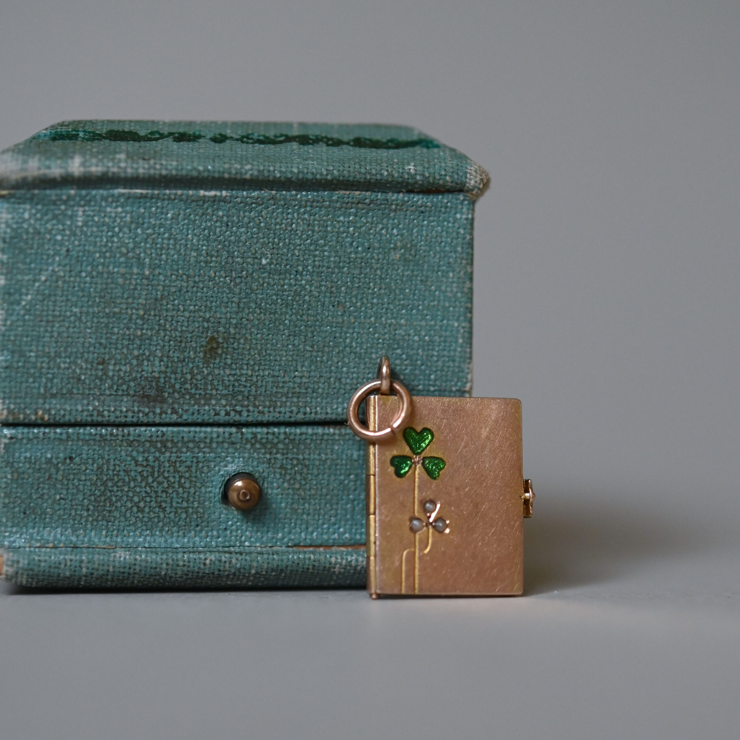 A very sweet antique 9ct gold locket pendant designed as an opening book. With green enamel and seed pearl detailed clovers to the front and an adorable latch at the side. The interior has a high carat gold wash and either a photograph or picture can be placed inside through a slot at the top. An adorable piece of antique English jewellery dating to the turn of the 20th century. Please note the chain and box shown are for demonstration purposes.