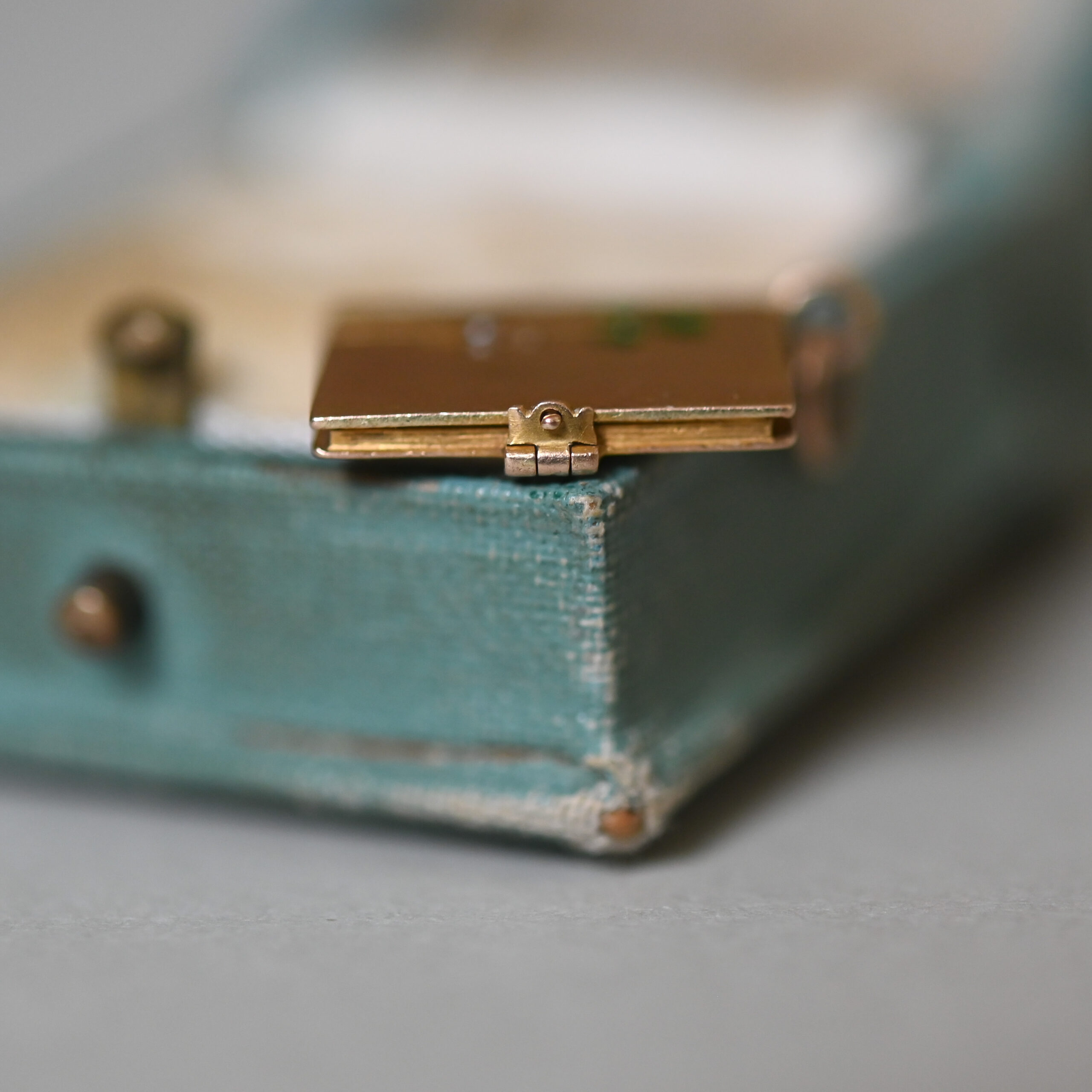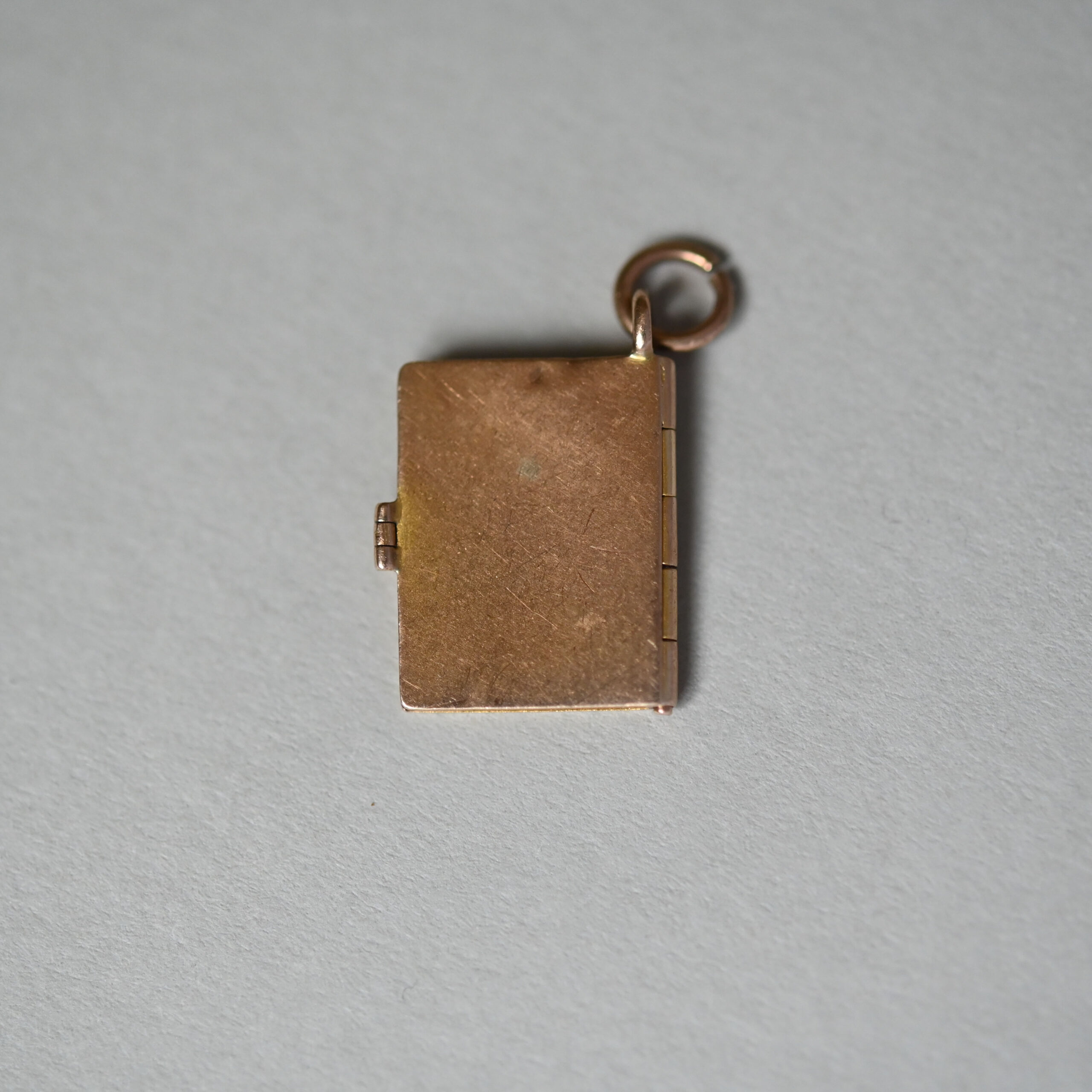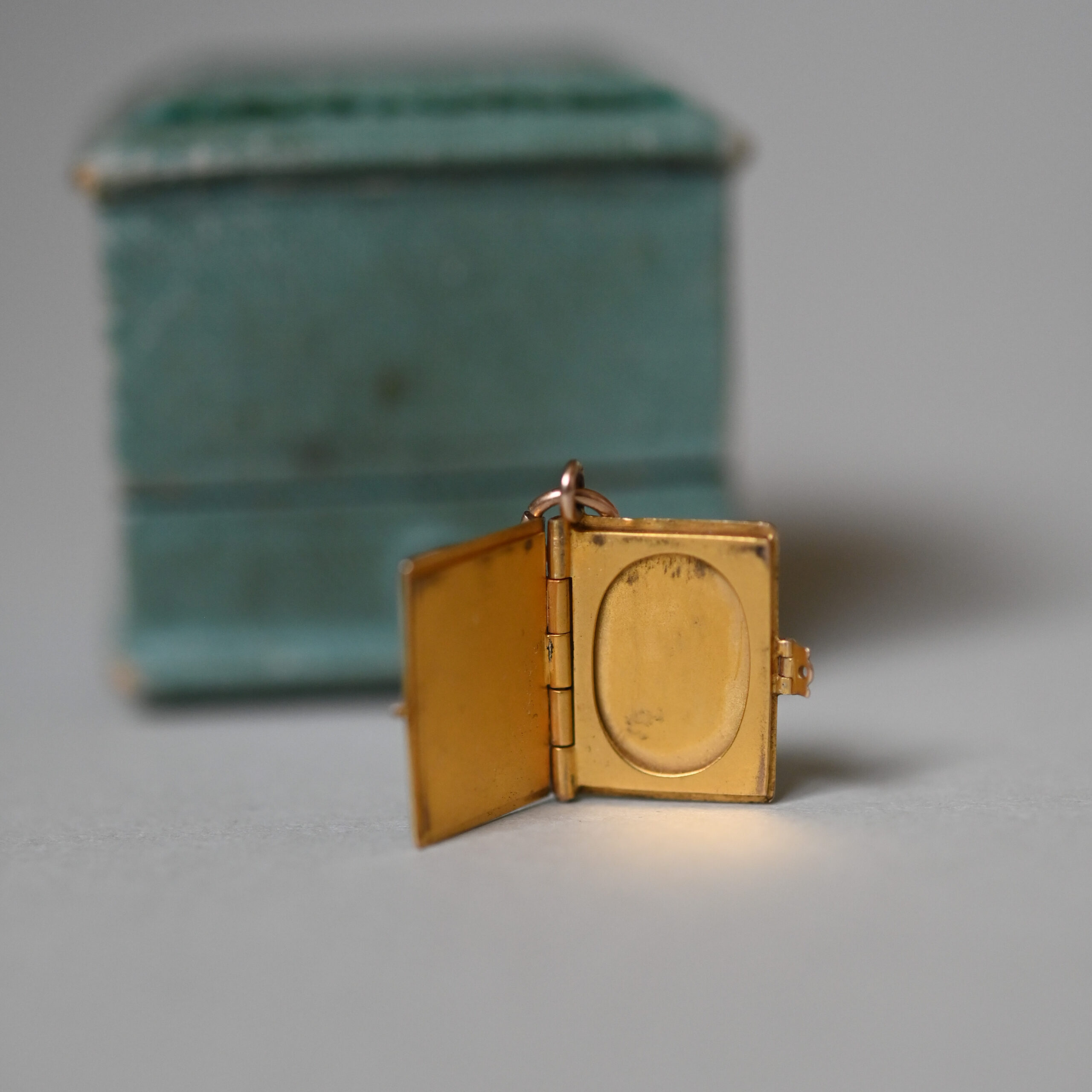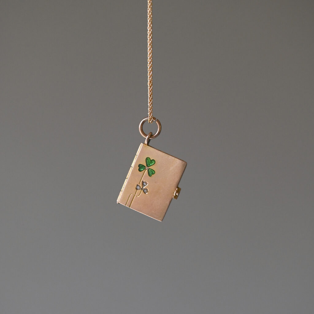 A very sweet antique 9ct gold locket pendant designed as an opening book. With green enamel and seed pearl detailed clovers to the front and an adorable latch at the side. The interior has a high carat gold wash and either a photograph or picture can be placed inside through a slot at the top. An adorable piece of antique English jewellery dating to the turn of the 20th century. Please note the chain and box shown are for demonstration purposes.
