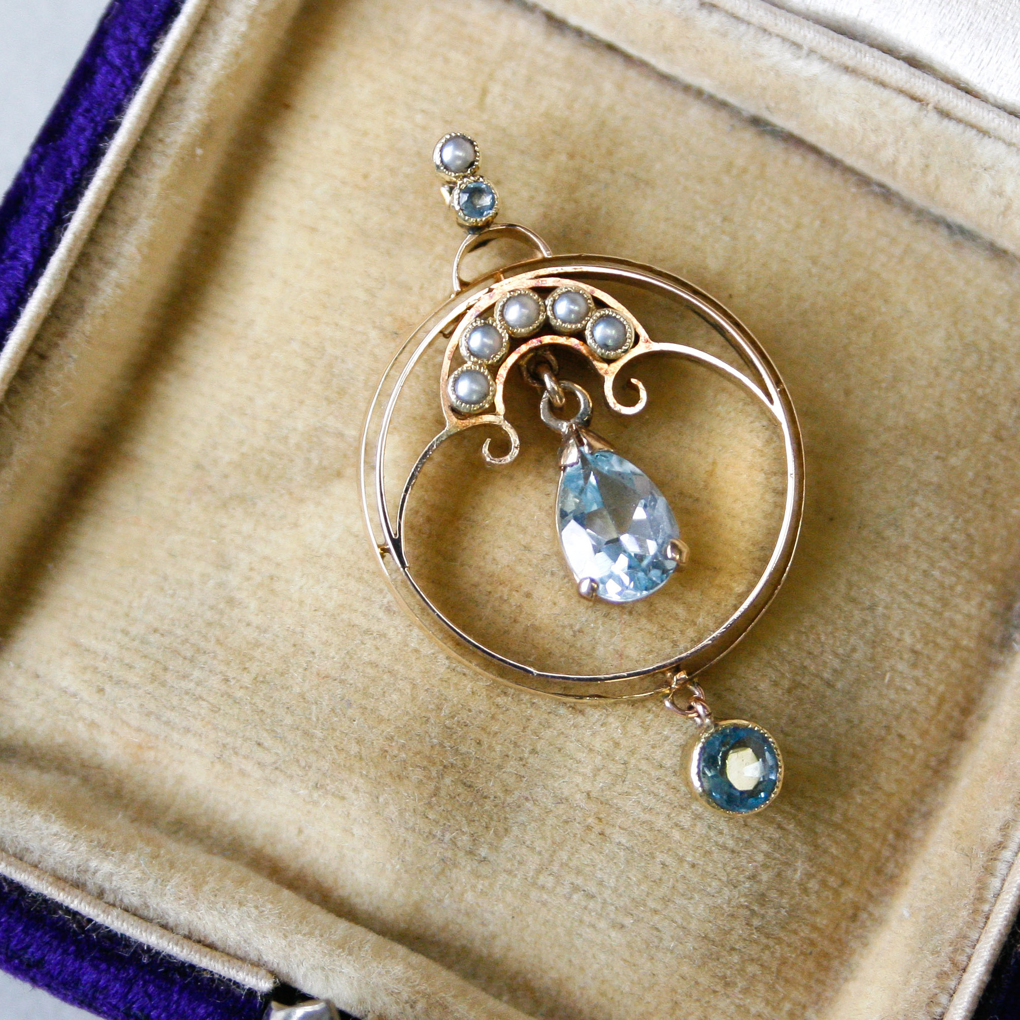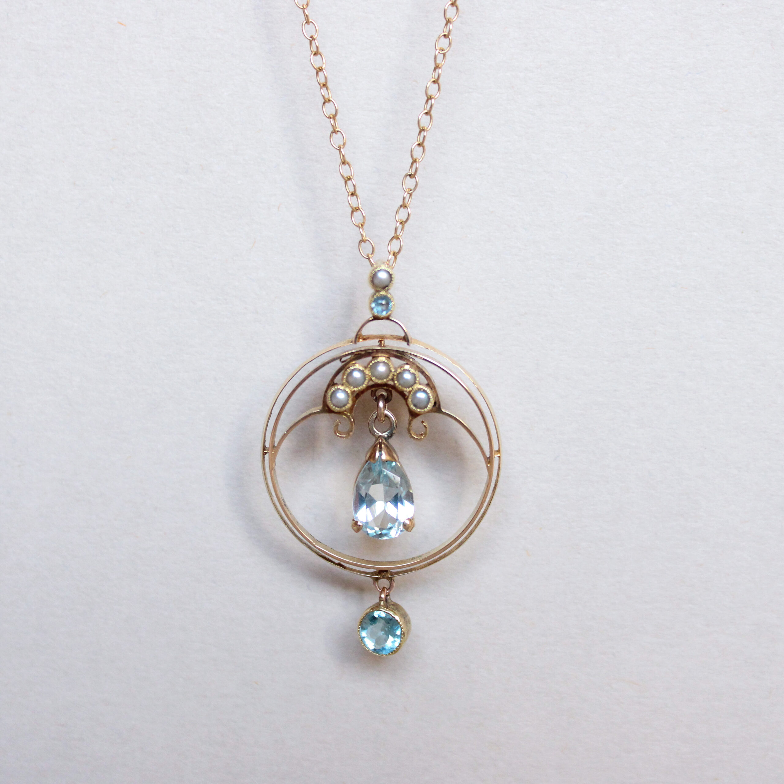 A beautifully elegant 15ct gold Edwardian aquamarine and pearl pendant in circular form. An arc of creamy white pearls sits above a tear-drop shaped aquamarine measuring 8 mm x 5 mm. With a 4 mm round cut aquamarine suspended below, creating a beautiful and daintily designed lavalier. With a lovely pearl and aquamarine detail on the bail. Edwardian jewellery of the early 20th century focused on delicate, airy and pretty designs. This piece is a gorgeous example of antique Edwardian 15ct gold jewellery. Please note the box and chain shown are for demonstration purposes.