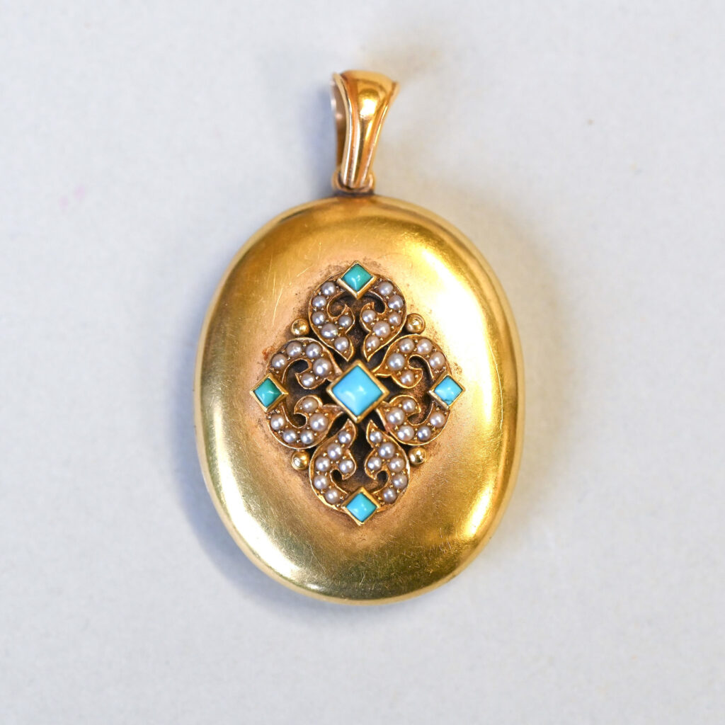 Victorian 15ct gold turquoise and pearl locket pendant, c.1860sVictorian 15ct gold turquoise and pearl locket pendant, c.1860s