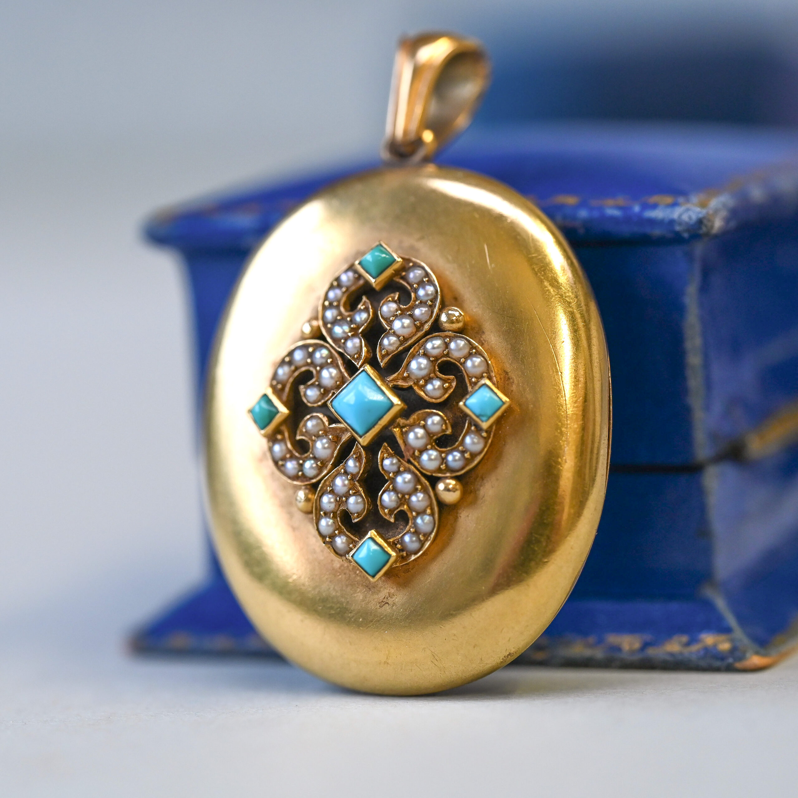 A beautiful Victorian 15ct gold locket pendant with gorgeous turquoise and pearl detailing. The diamond shaped, sugar loaf cut turquoise are set on top elegant scroll-like forms, set with creamy white seed pearls. Creating a pretty and carefully balanced decorative design. The combination of turquoise and was a popular Victorian aesthetic, creating a palette of soft pastels hues. The locket opens and closes neatly and securely at the side. One interior compartment still retains its original glazed panel. Please note the boxes shown are for demonstration purposes. Dates to c.1860s – 1880s.