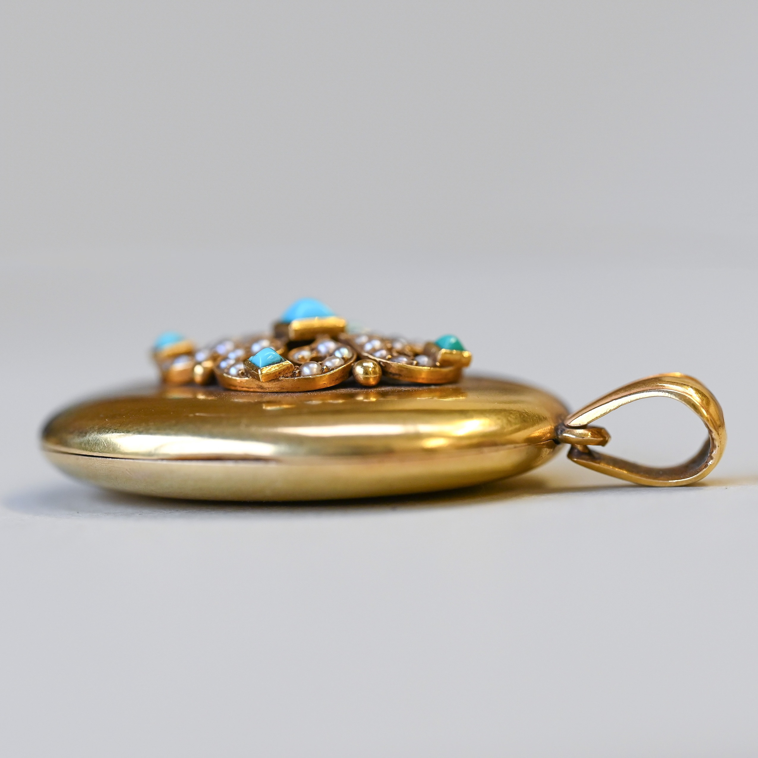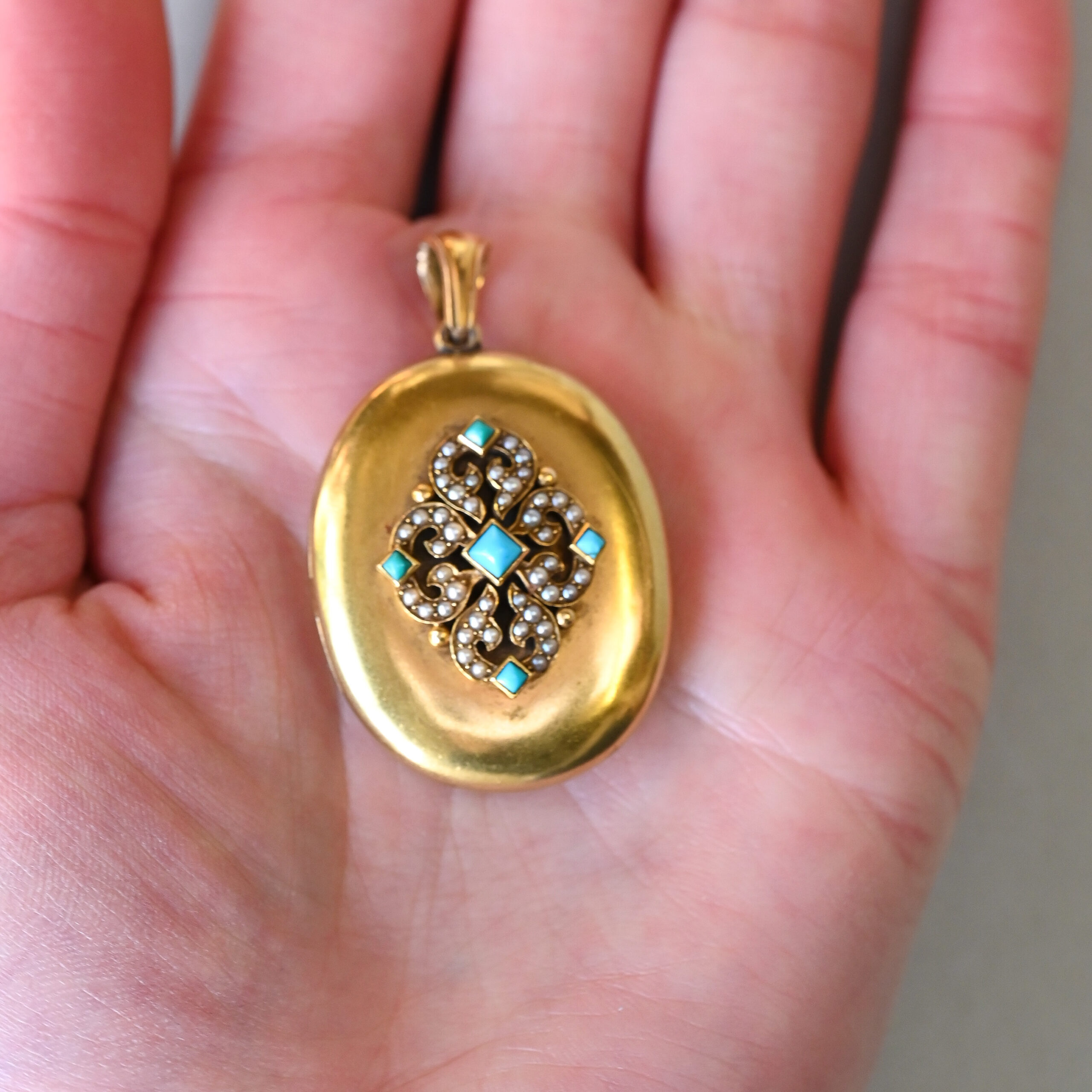 Victorian 15ct gold turquoise and pearl locket pendant, c.1860s