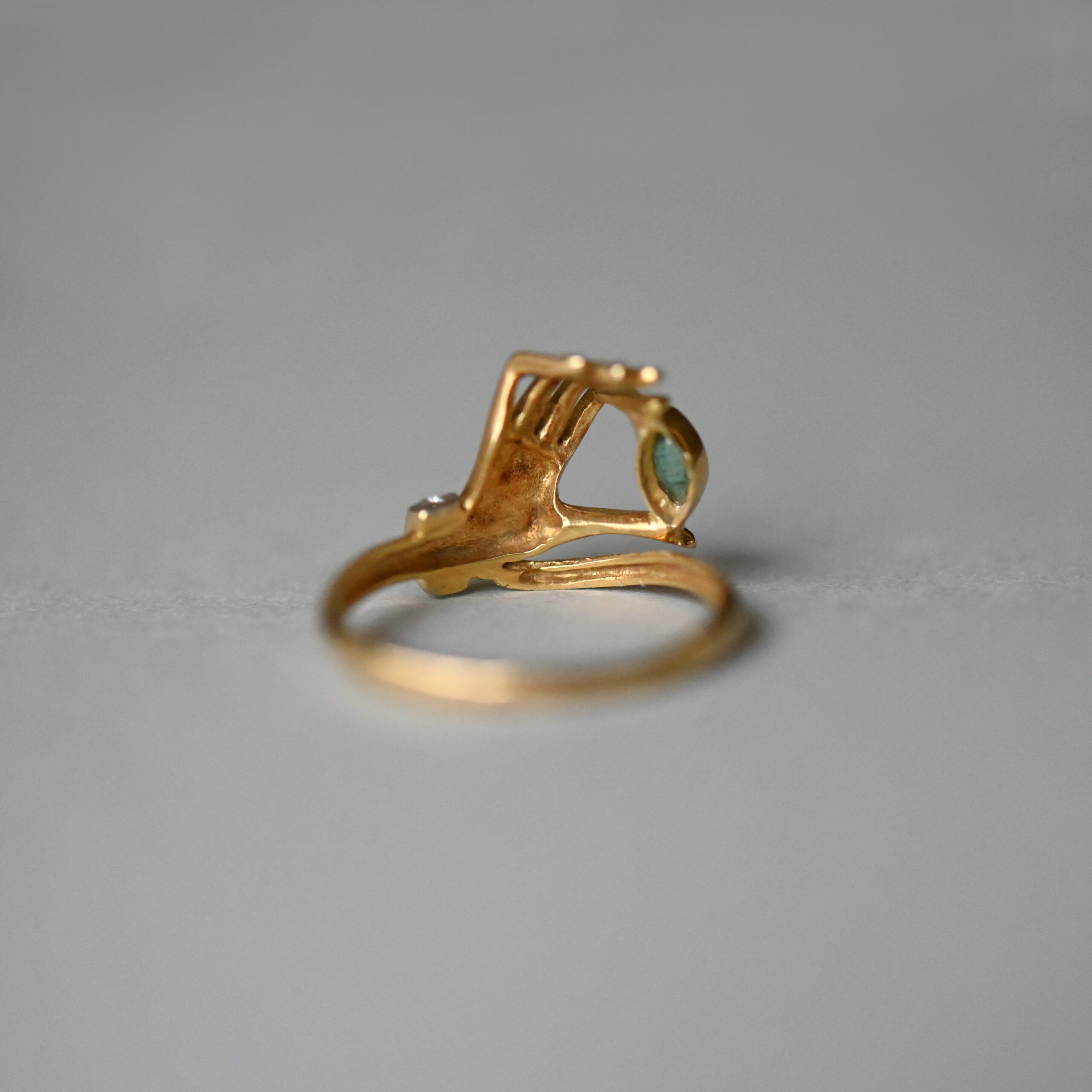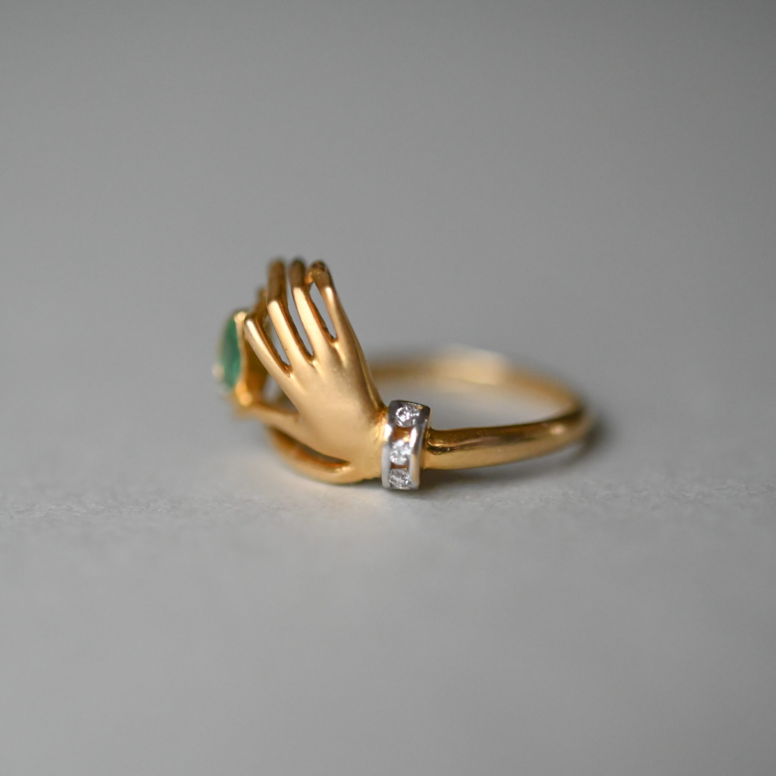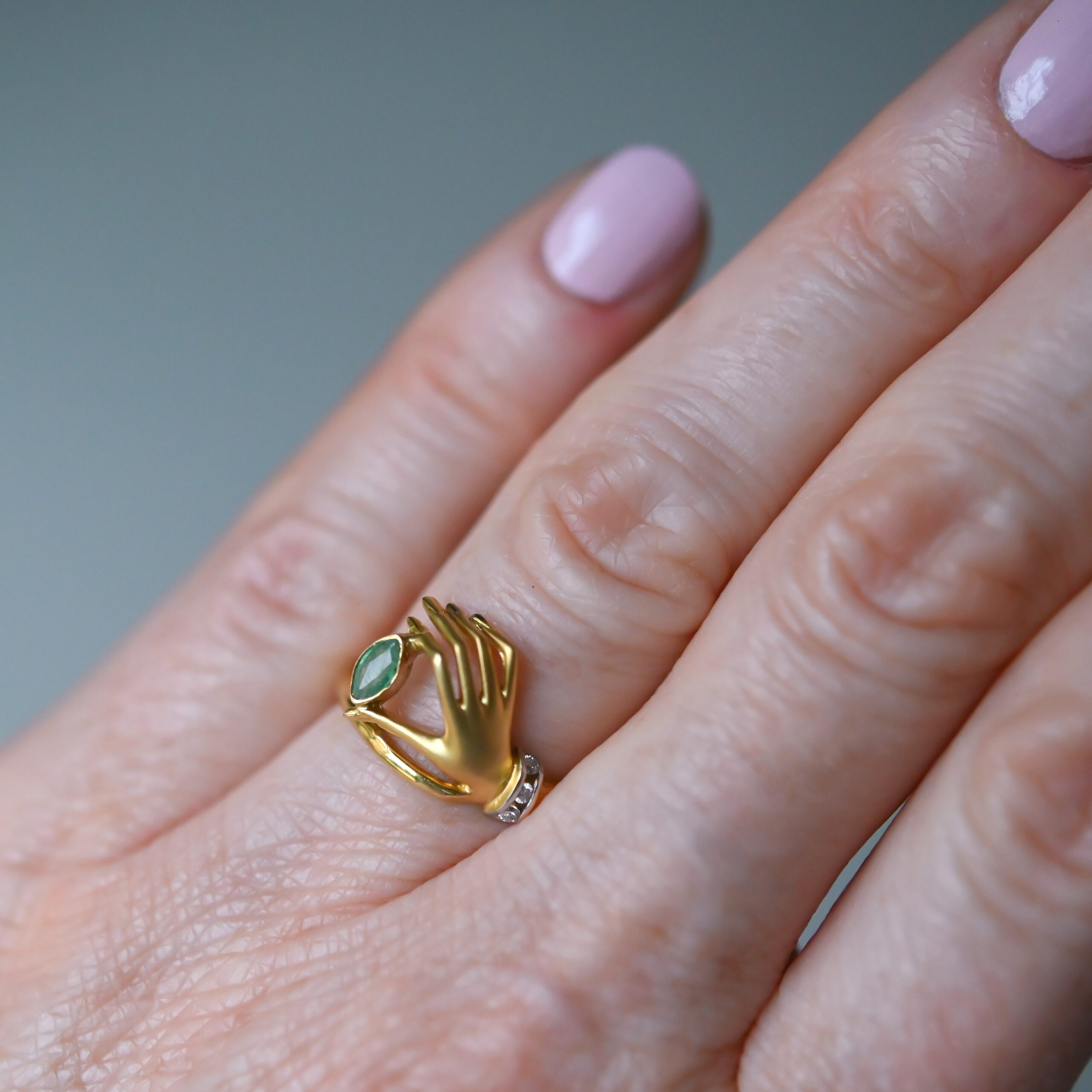 A finely made 18ct gold ring by Spanish jewellery house Carrera y Carrera. Modelled as a hand with gorgeously posed and elegant fingers clutching a navette-shaped emerald. The emerald measures 5 mm x 3 mm. With a brilliant cut diamond set cuff. The ring face measures 12 mm x 15 mm. A beautiful and visually captivating piece of vintage 18ct gold jewellery.