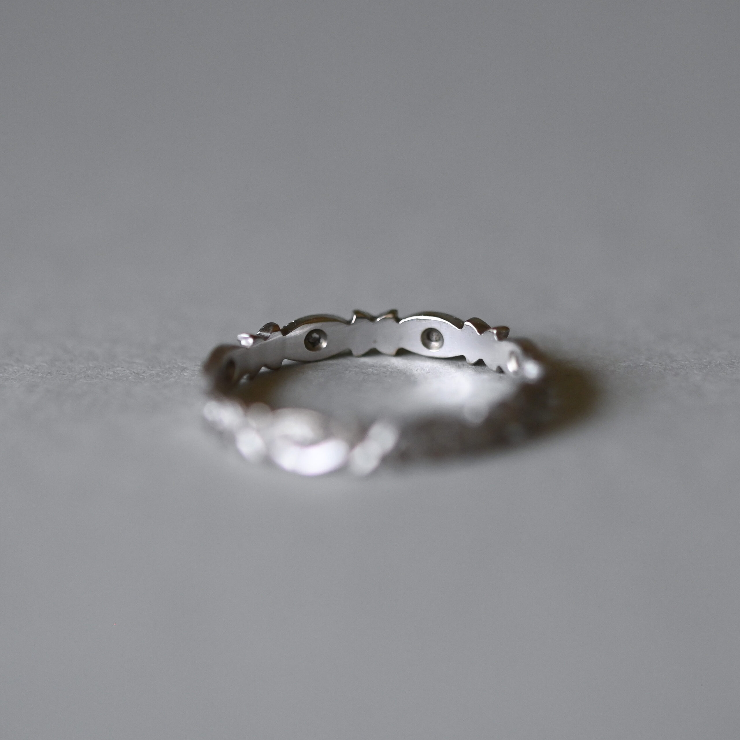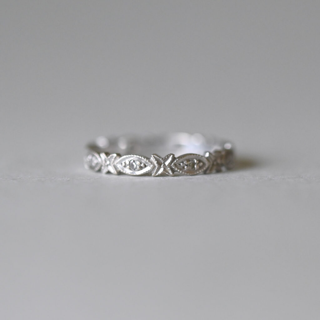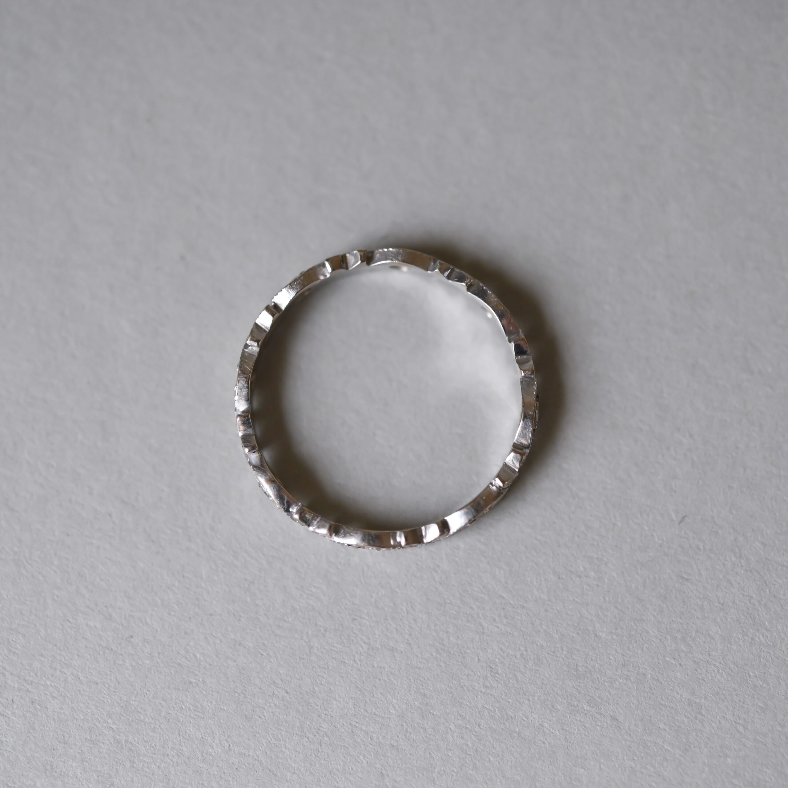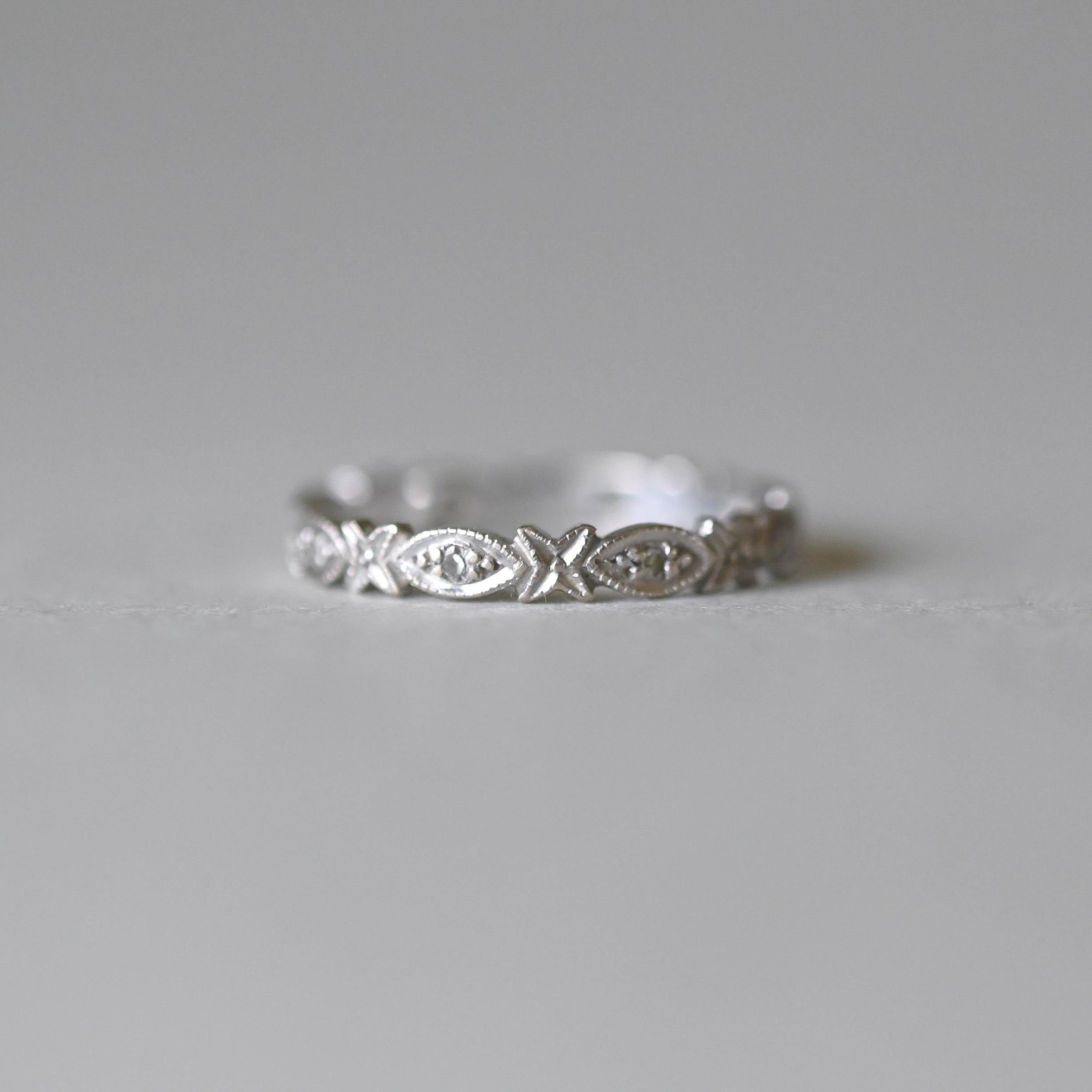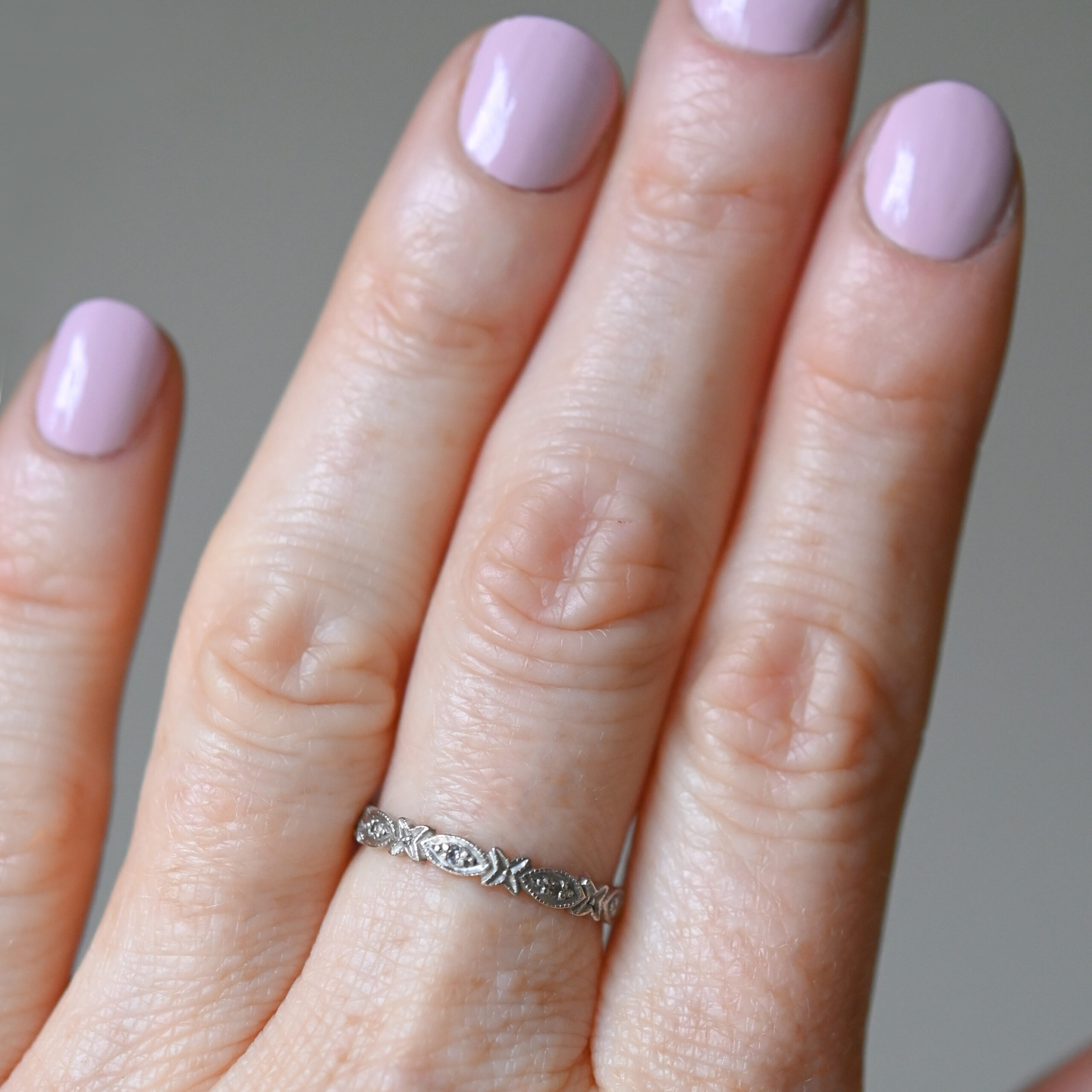A beautiful and classic 18ct white gold band ring set with mini diamonds. Designed with an alternating pattern of lozenge and x stars throughout. Set with eight individual one point round cut diamonds, totalling 0.08 carats. The band measures 3mm wide. Perfect to wear on its own or stack with others.