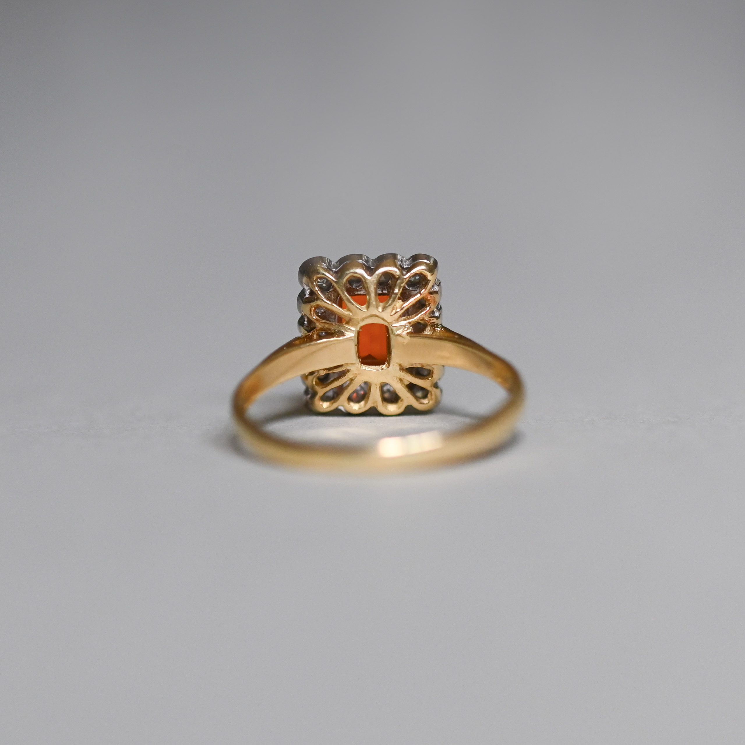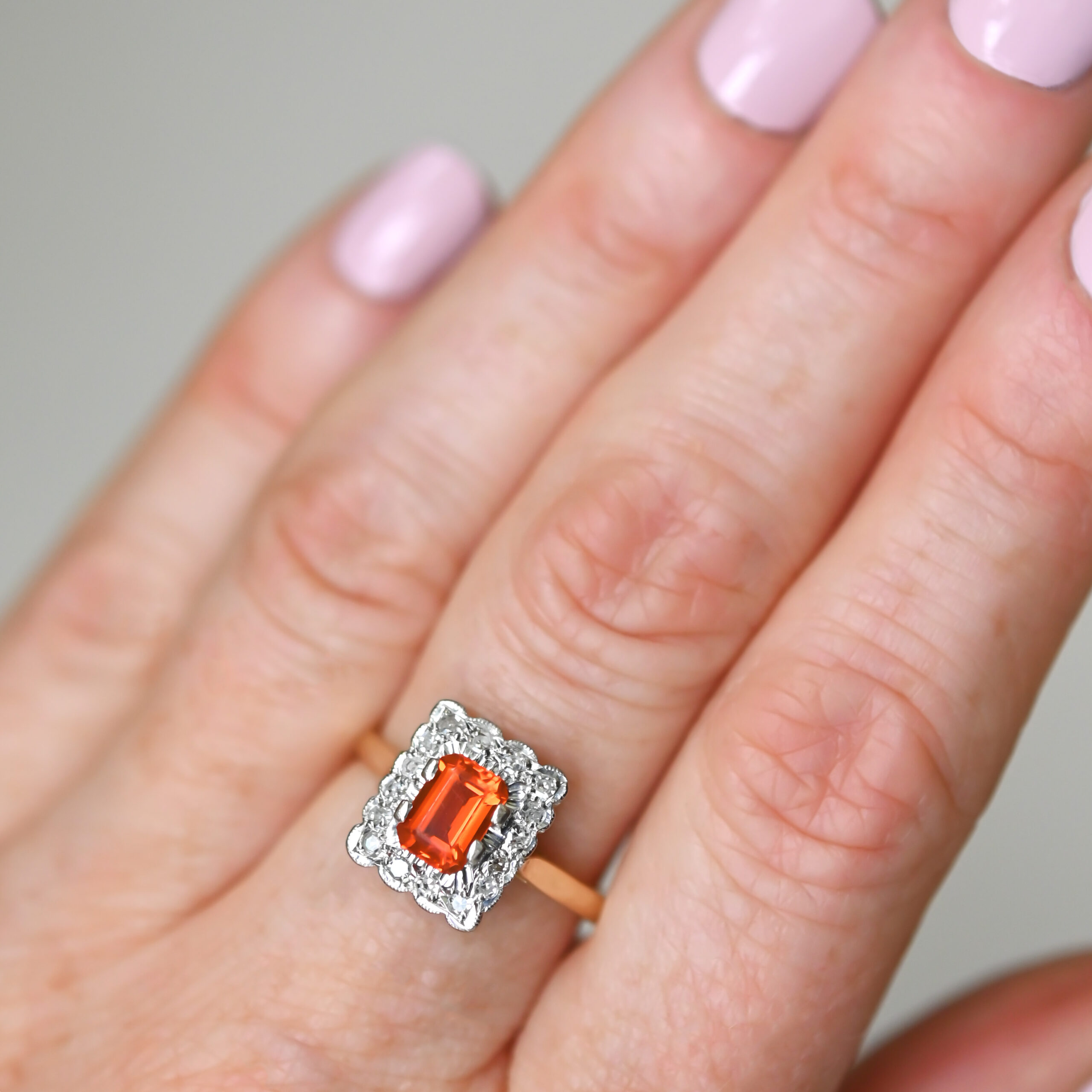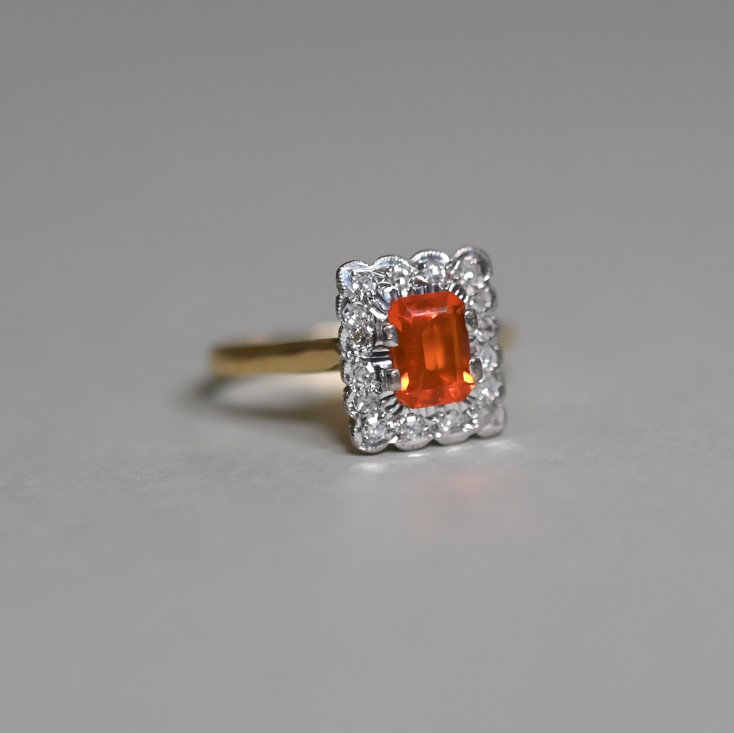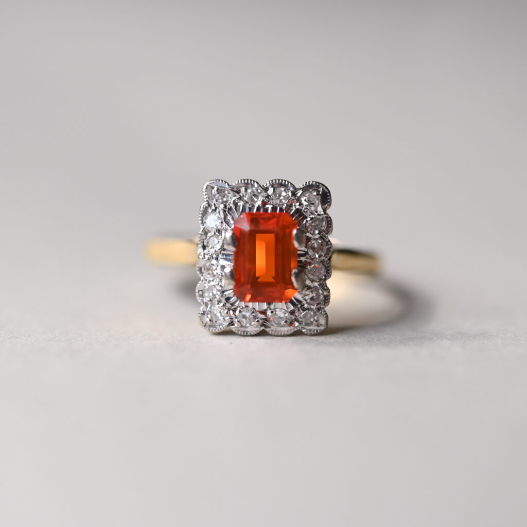A beautifully and classically designed 18ct gold ring, set with a central step-cut fire opal. The fire opal is a gorgeously saturated hue and measures 8 mm x 5 mm. Framed by a halo of x16 individually set very bright and lively diamonds. An estimated total of 0.32 carats. The cluster measures 13 mm x 10 mm and the setting is white gold. On a plain yellow gold shank. This exquisite piece would make a perfect vintage style engagement ring. Dates to 1980s.