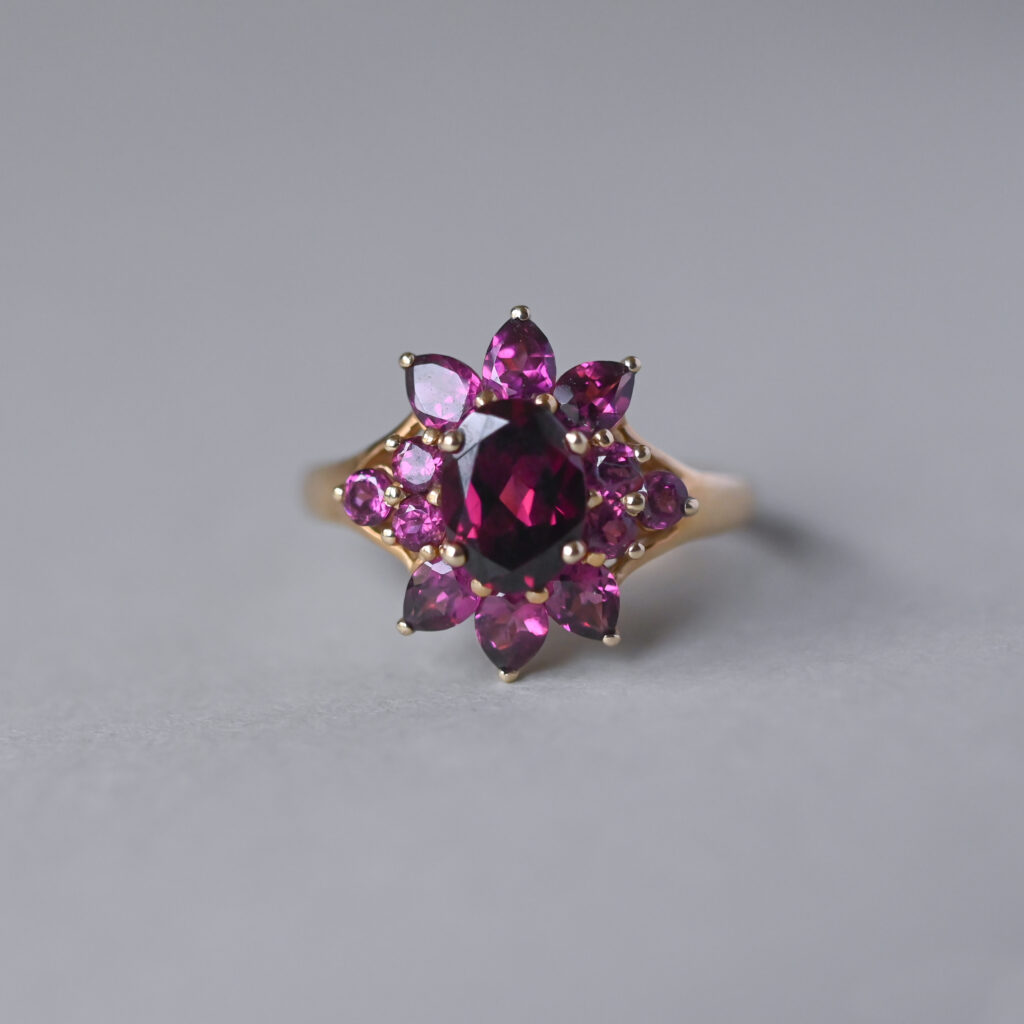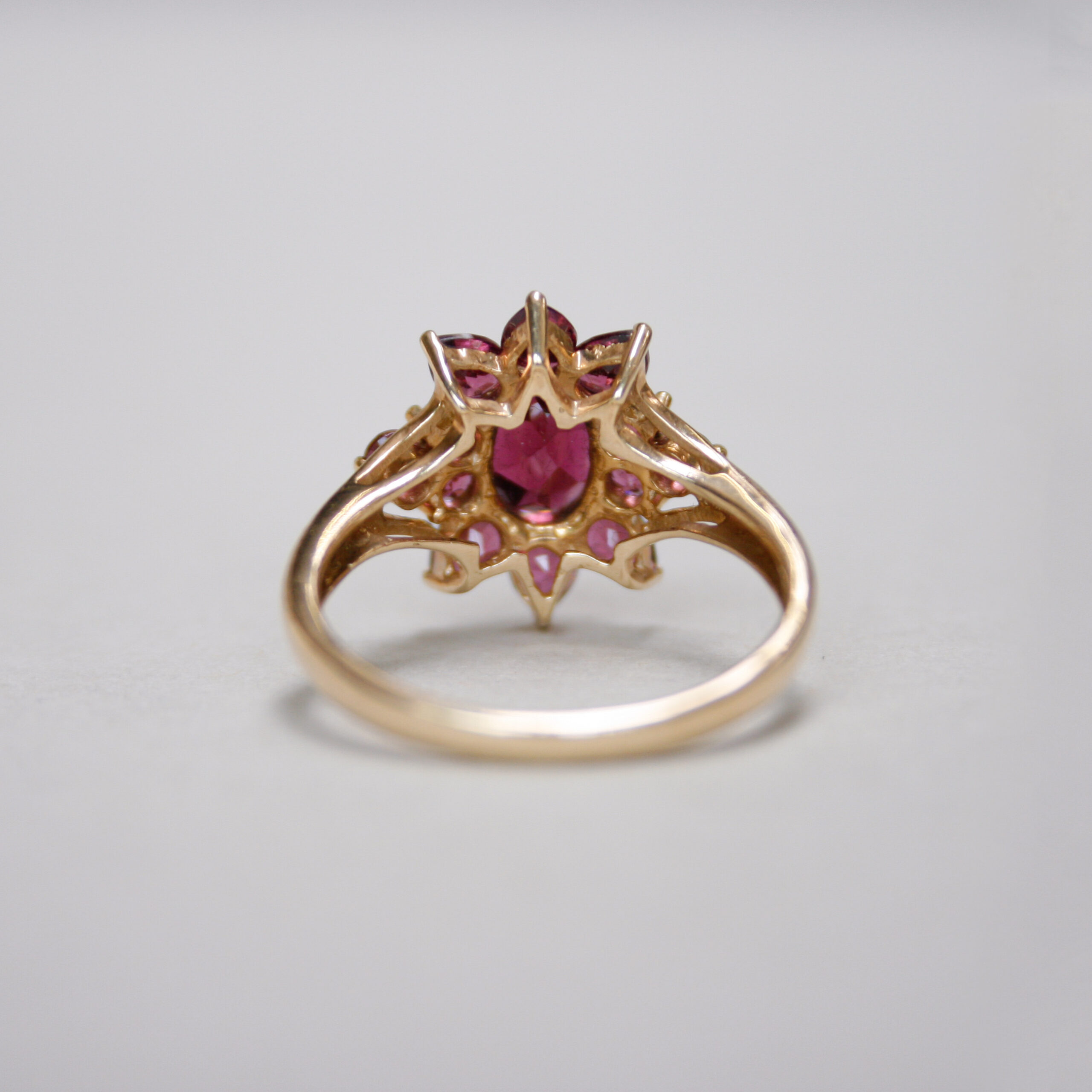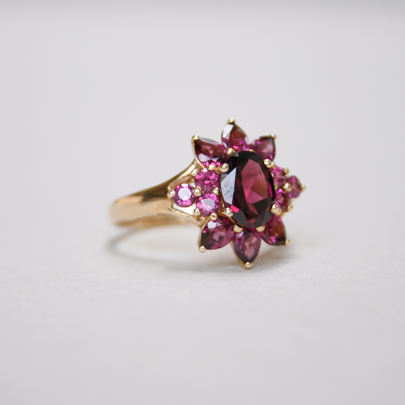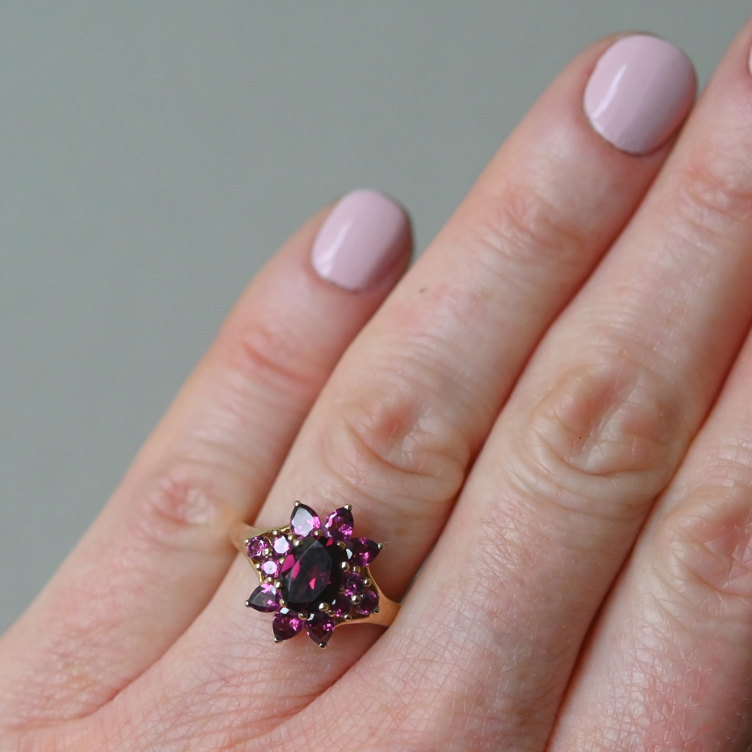 A beautifully and classically designed 9ct gold ring claw set with a central oval shaped garnet and a halo of mixed cut garnet petals. The garnets are a rich berry hue and gorgeously saturated. The central garnet measures 7 mm x 5 mm. The cluster measures 16 mm x 14 mm. With split detail shoulders and a plain shank. A very pretty contemporary 9ct gold ring.