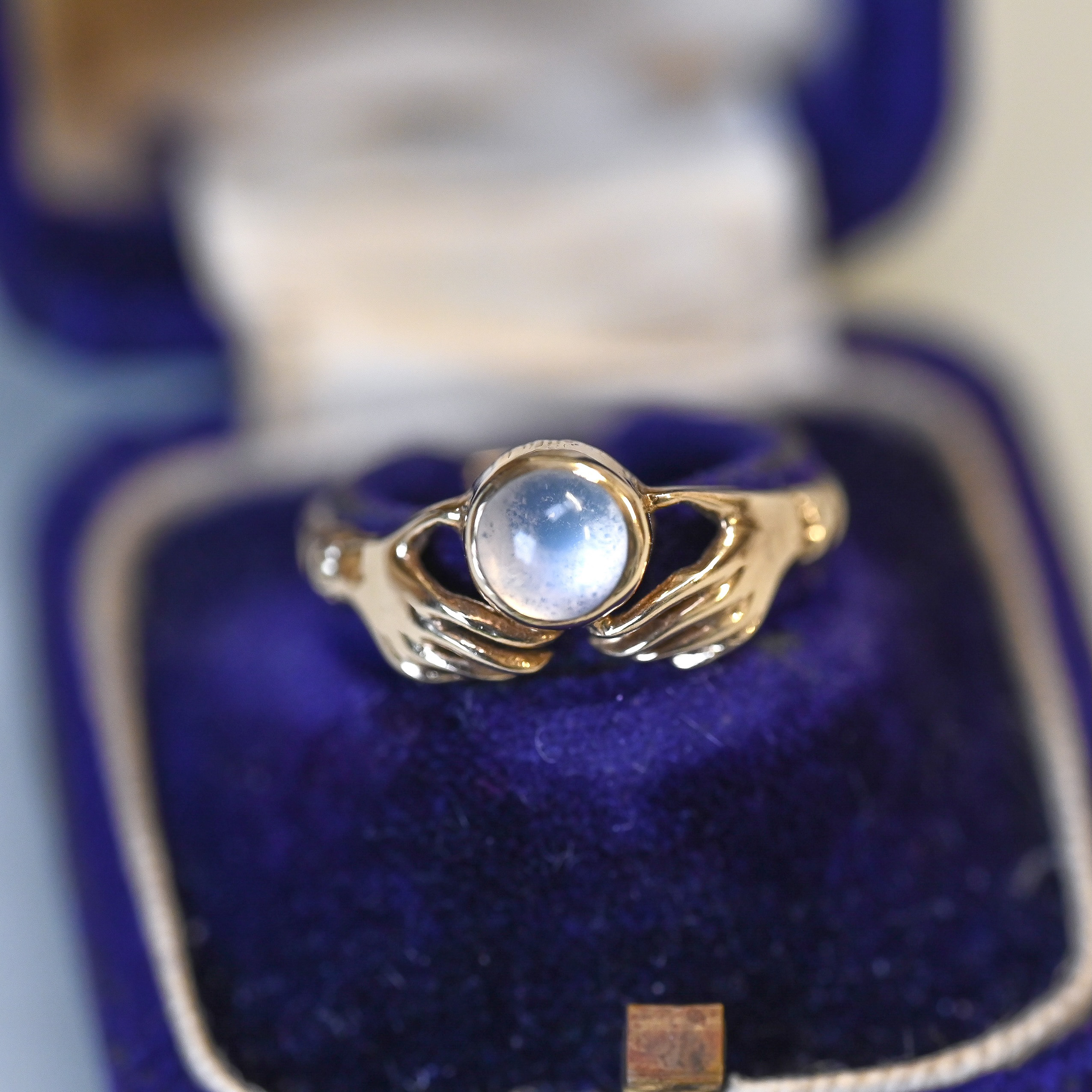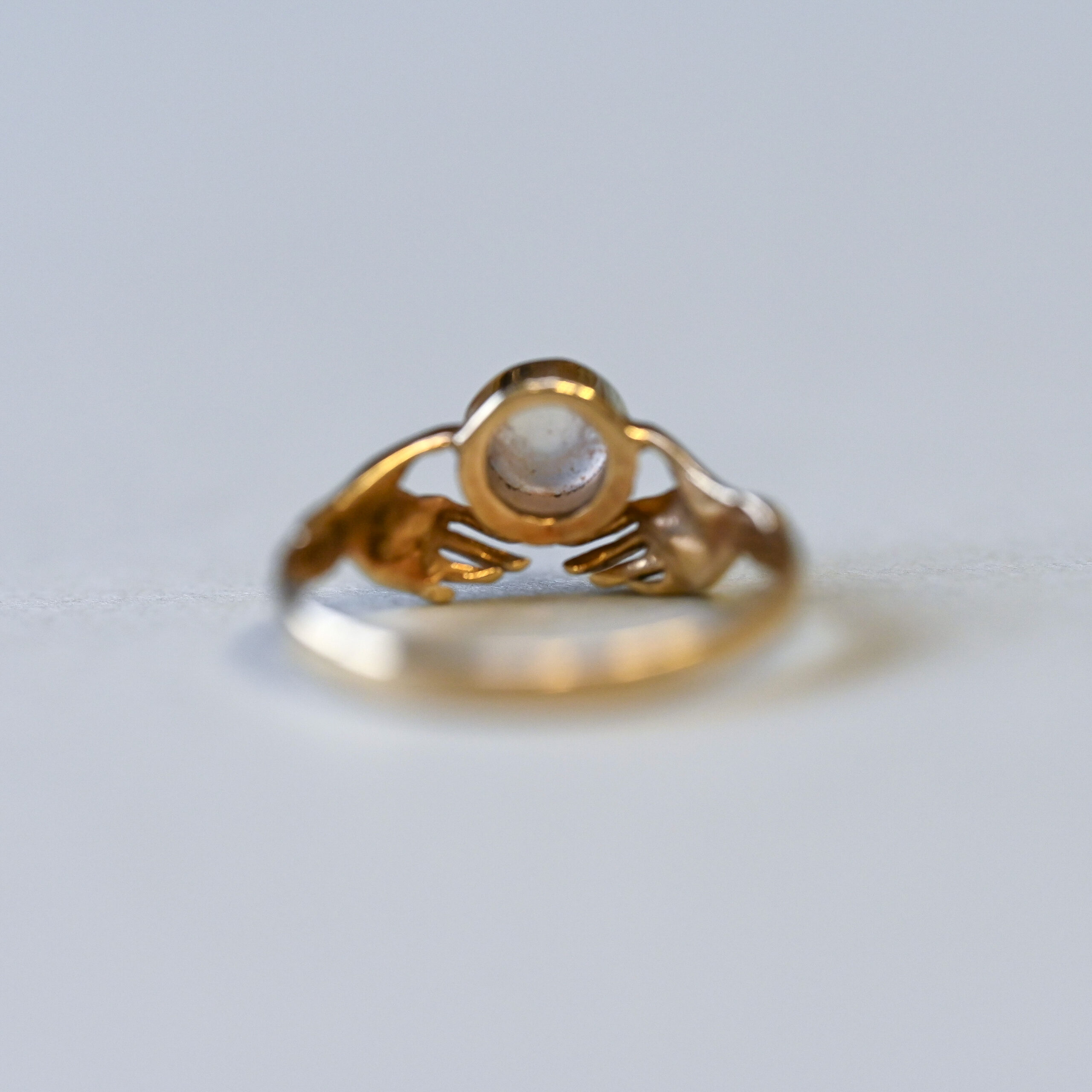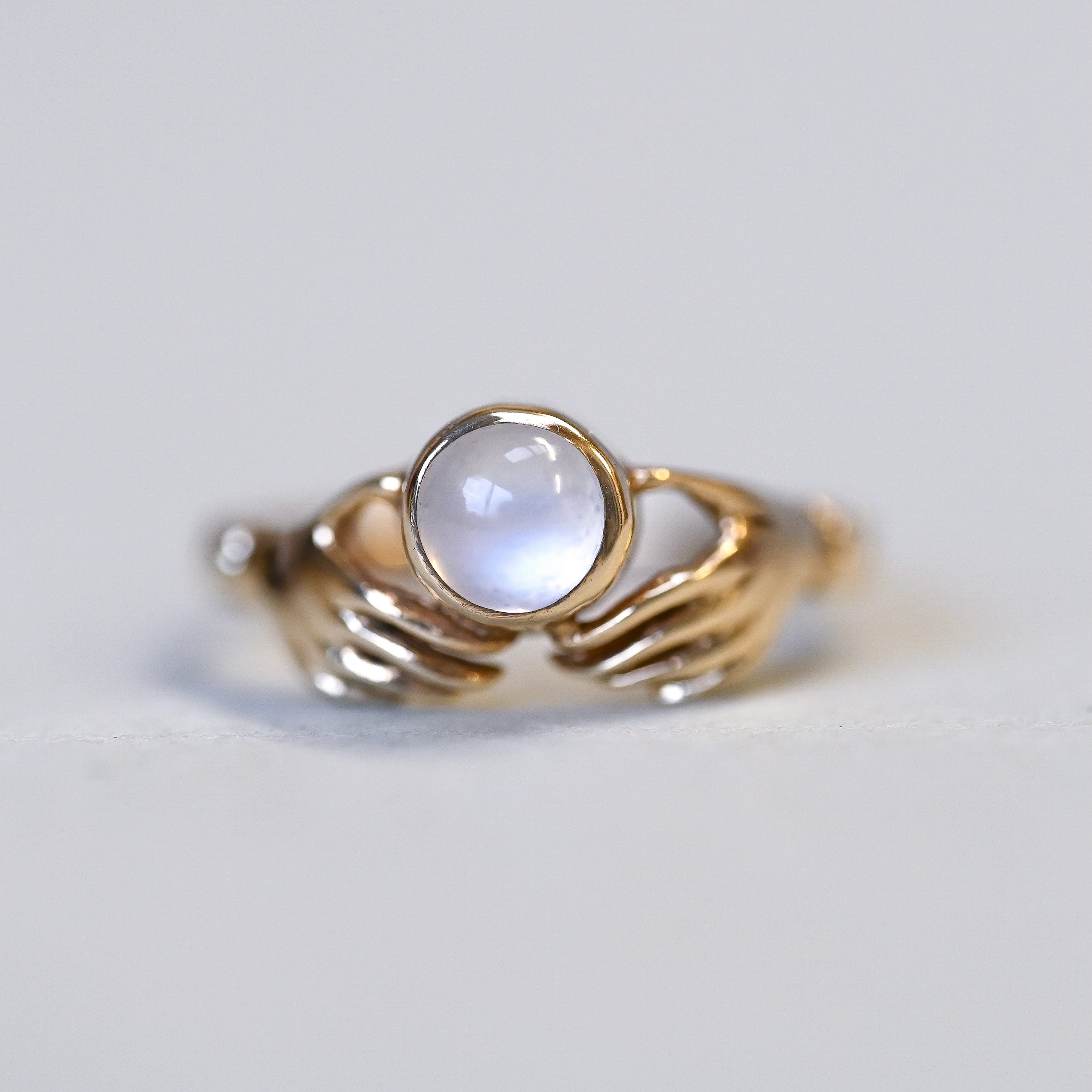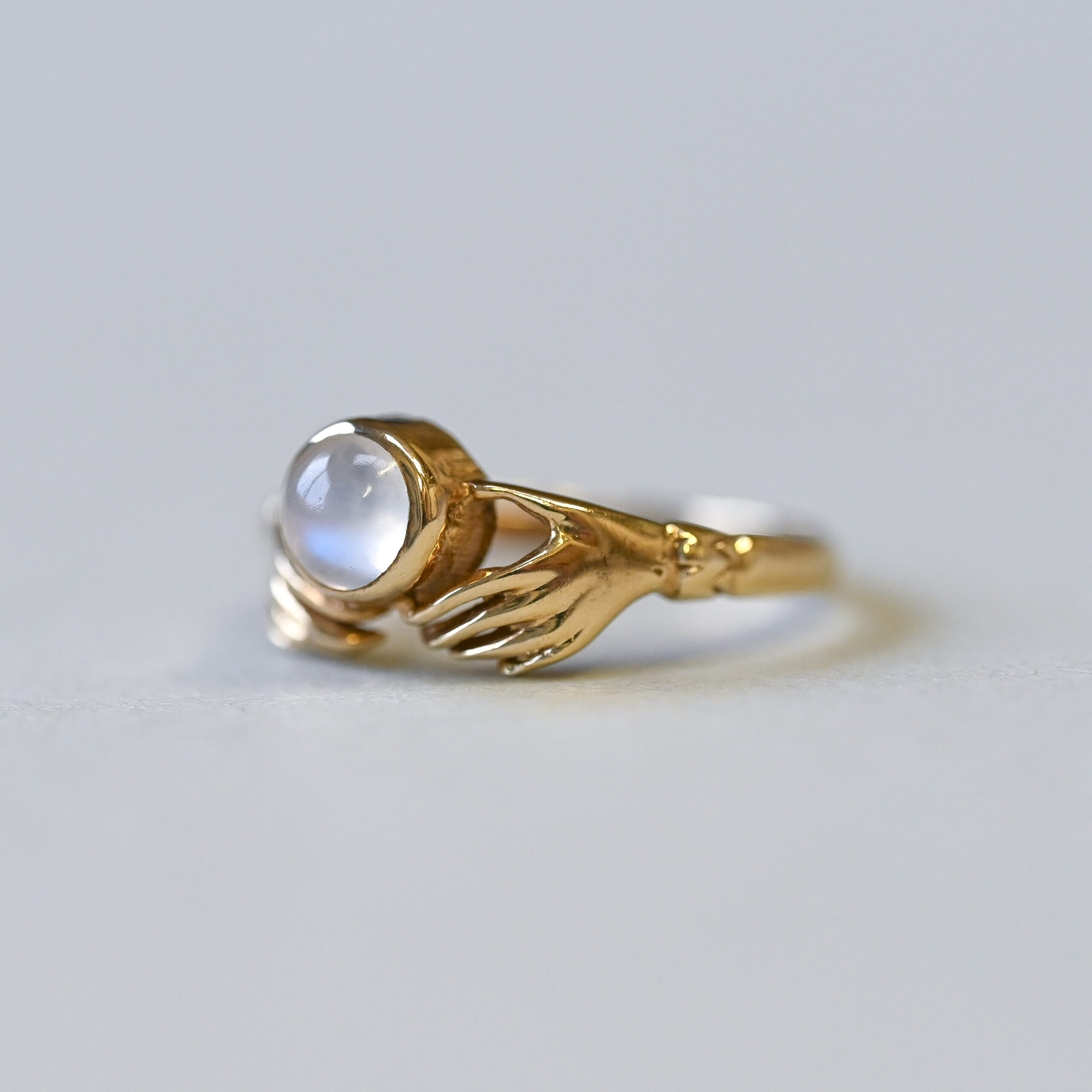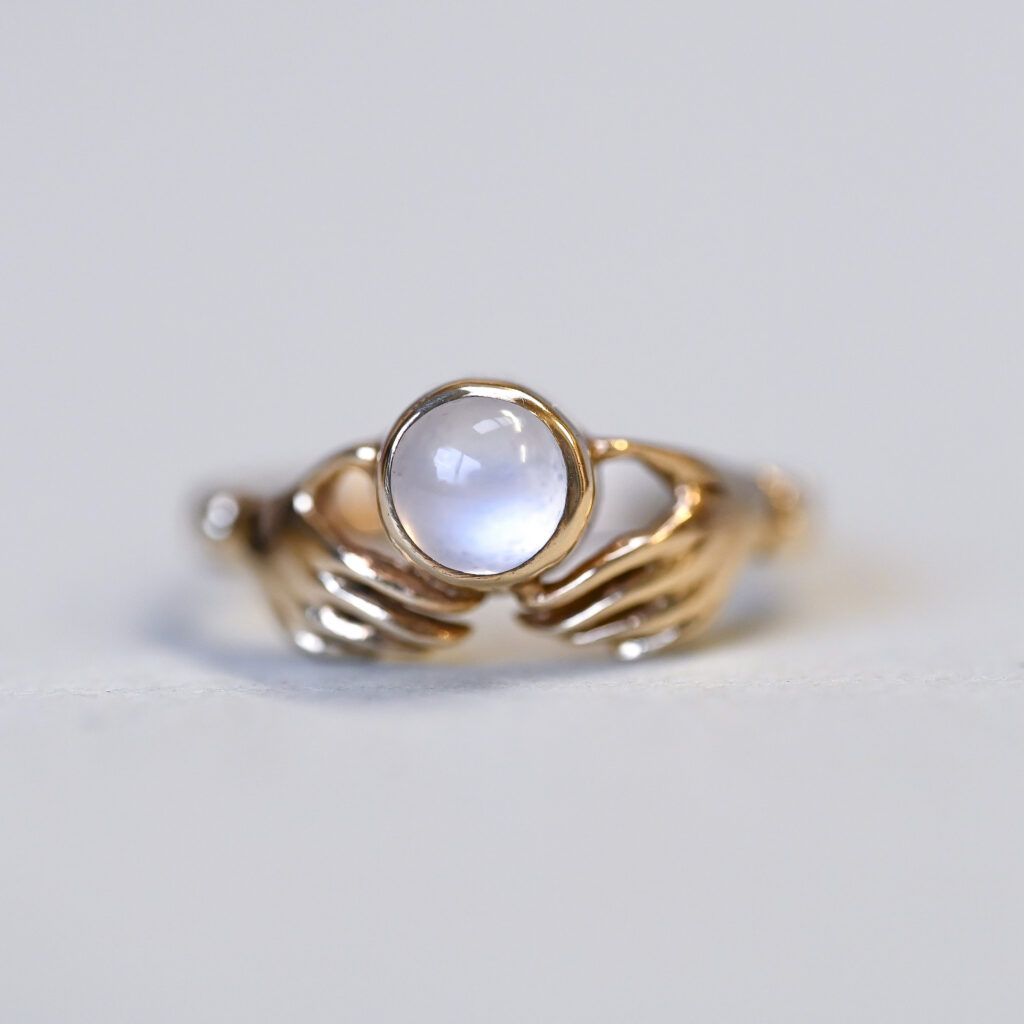 Aesthetic 9ct gold moonstone fede hand ring