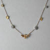 A gorgeously designed floral cluster 9ct gold ring set with four round green sapphires and a central light candy pink sapphire. With delicate white topaz interspersed on the petals. The ring face measures 13 mm x 13 mm. On a plain shank. A pretty contemporary piece that celebrates shape and colourful gemstones.