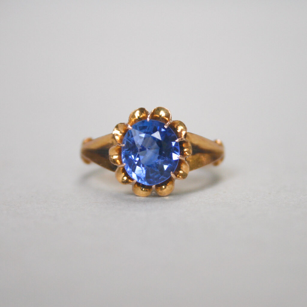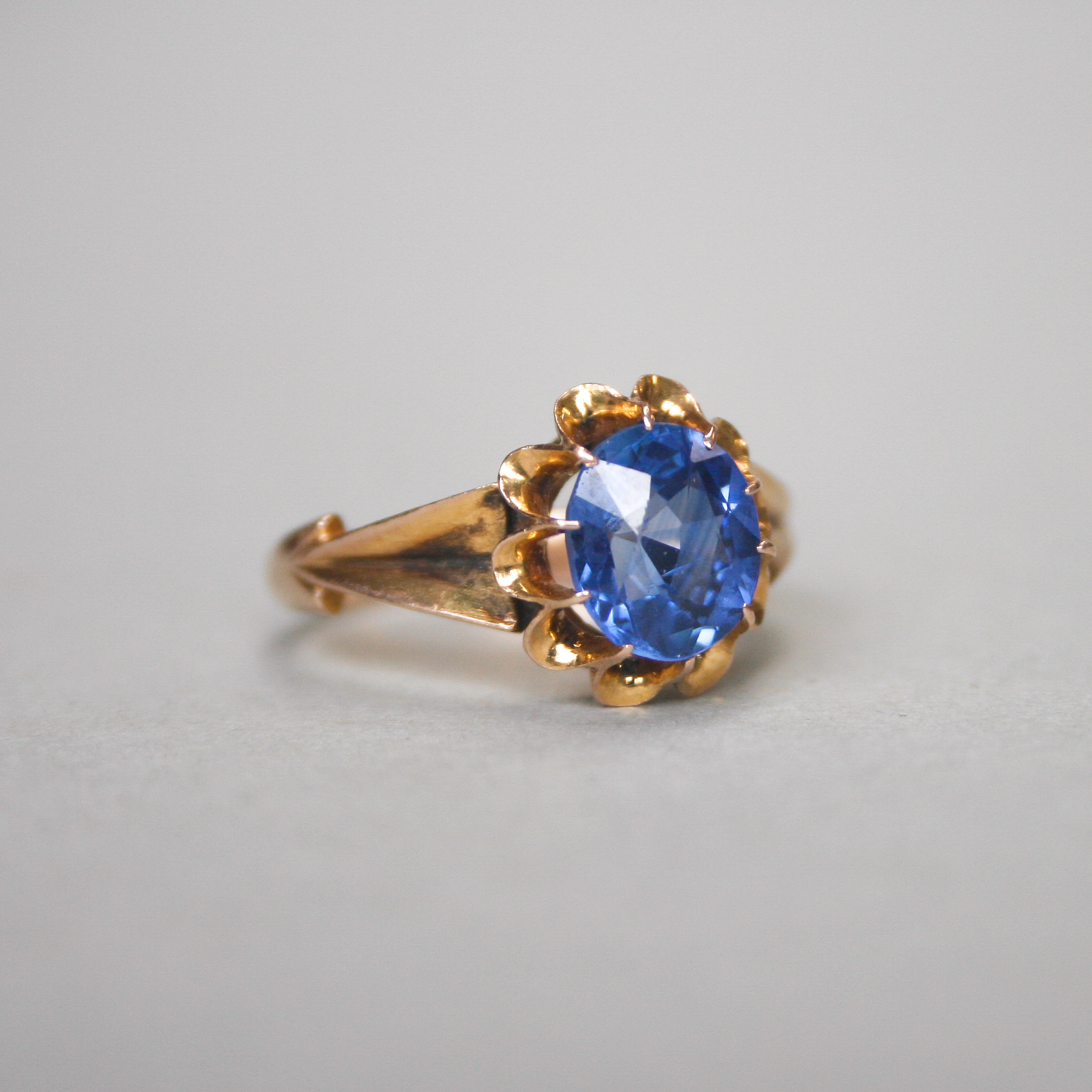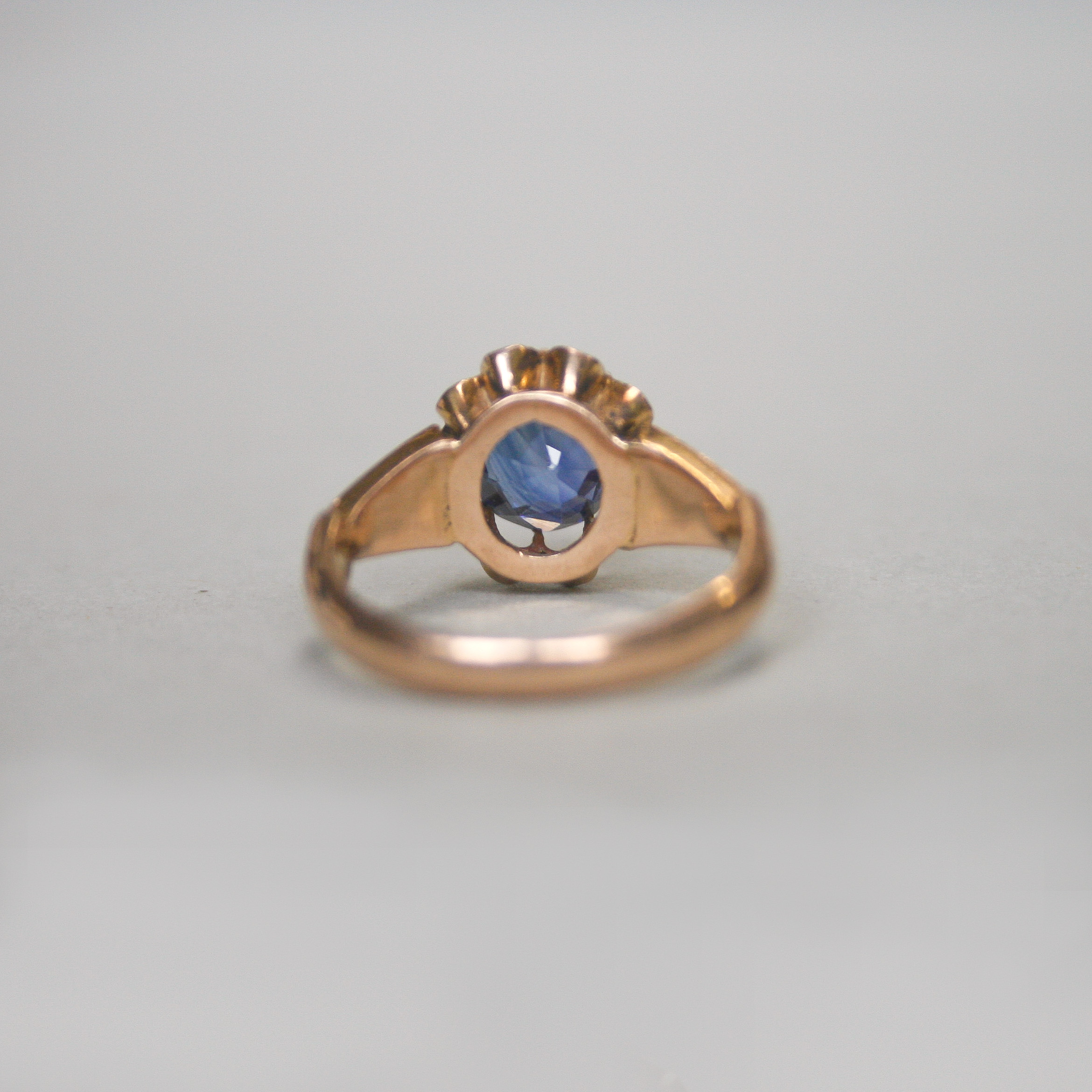 Dating to the turn of the 19th and 20th century, this beautiful antique piece fits neatly between the late Victorian and Edwardian eras. Claw set with a gorgeous oval shaped sapphire in a very pretty buttercup style setting. The sapphire is a beautiful velvet blue hue and measures 9 mm x 8 mm, estimated to be 2.5 carats. The ring face measures 14 mm x 13 mm. There is an area of colour zoning present in the sapphire and the growth lines are slightly curved, suggesting possible flame fusion process. This may indicate it being a synthetic stone, meaning a real sapphire grown under laboratory conditions. With grooved shoulders and a plain shank. A lovely example of antique high carat gold jewellery.