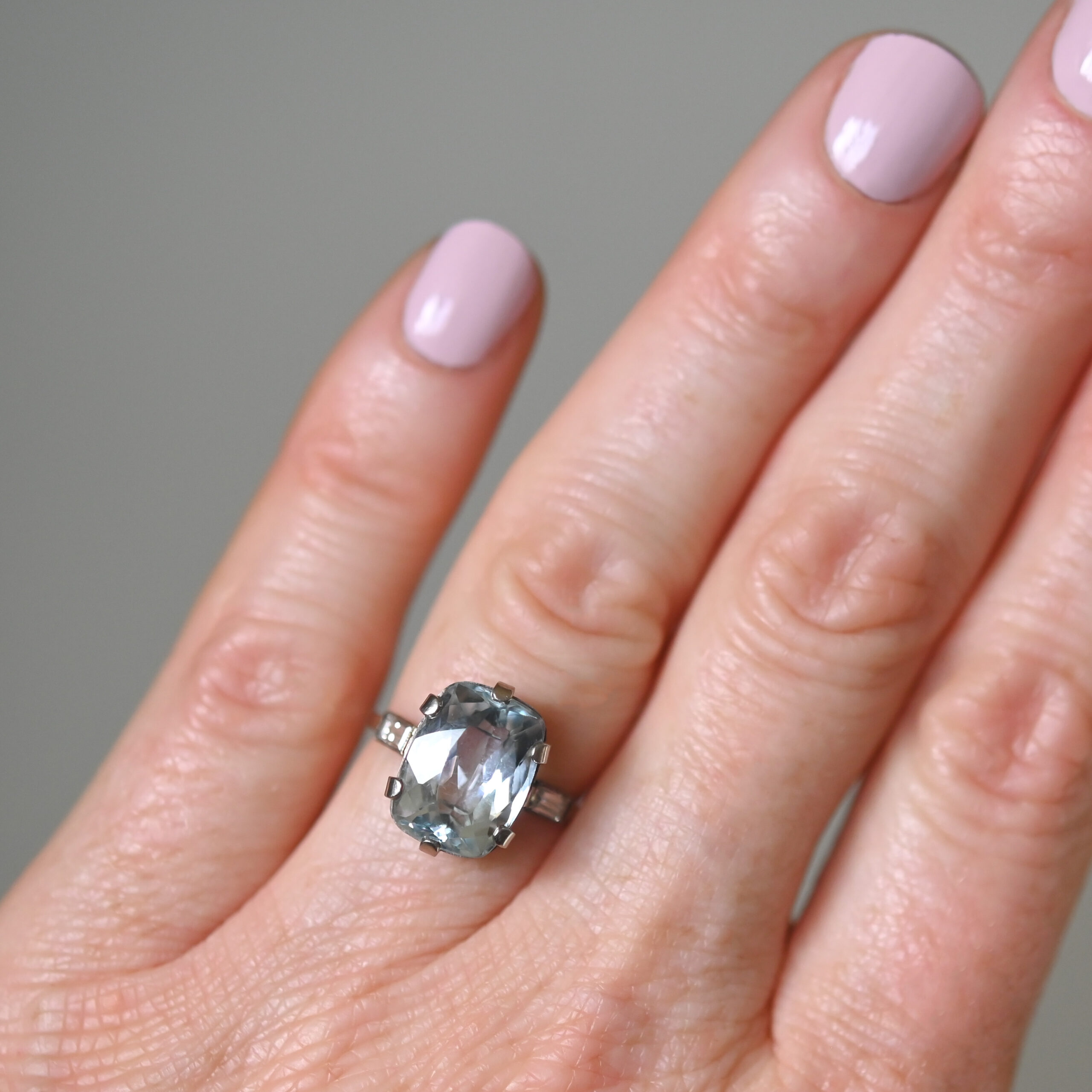A classically designed 18ct white gold ring claw set with a beautifully cut central topaz. The topaz is a pretty sky blue hue and measures 12 mm x 9 mm, totalling an estimated 5.0 carats. Flanked by 2 mm x 5 mm baguette cut diamonds. A beautiful example of English Art Deco jewellery, dating to the c.1930s. This gorgeous piece would make a perfect vintage engagement ring.