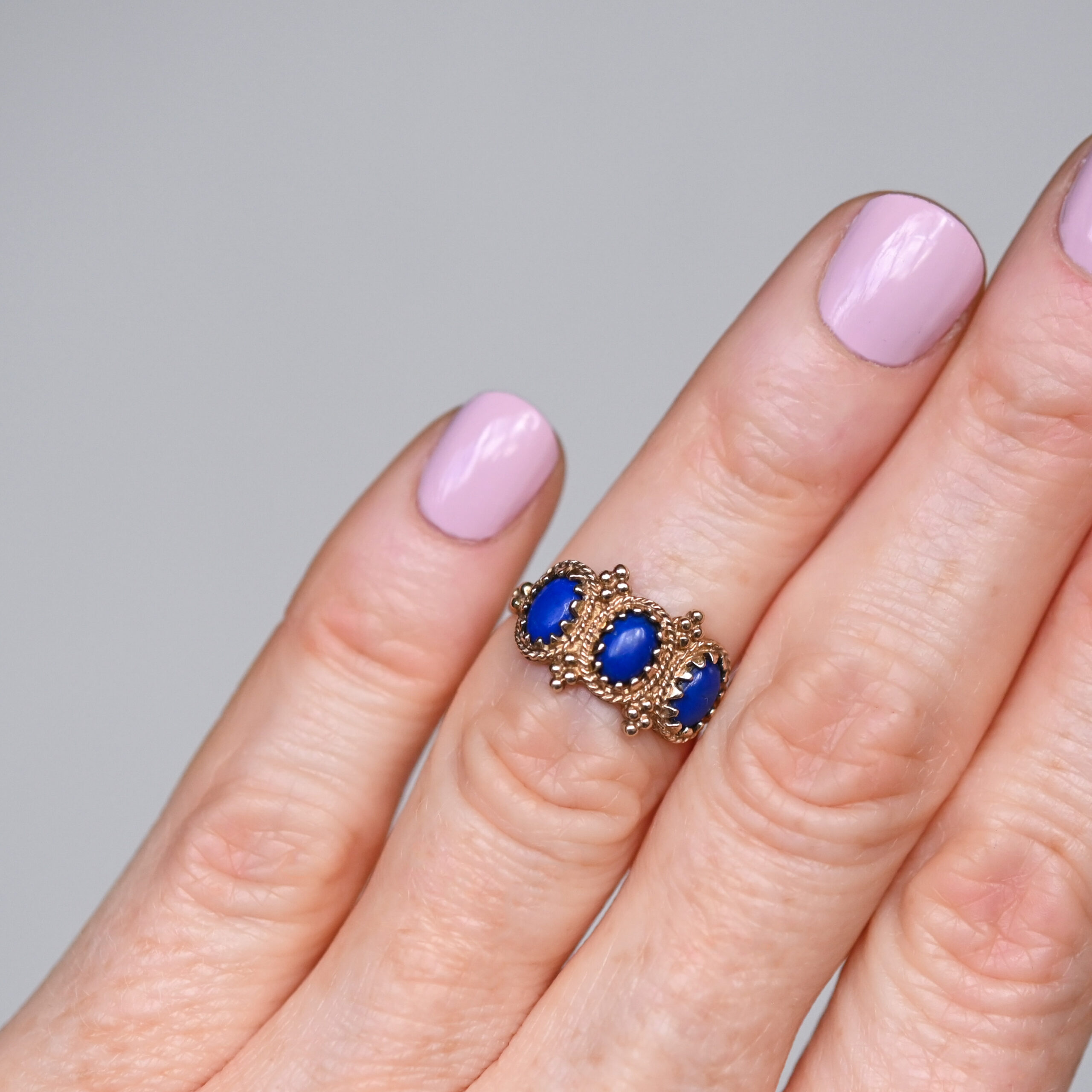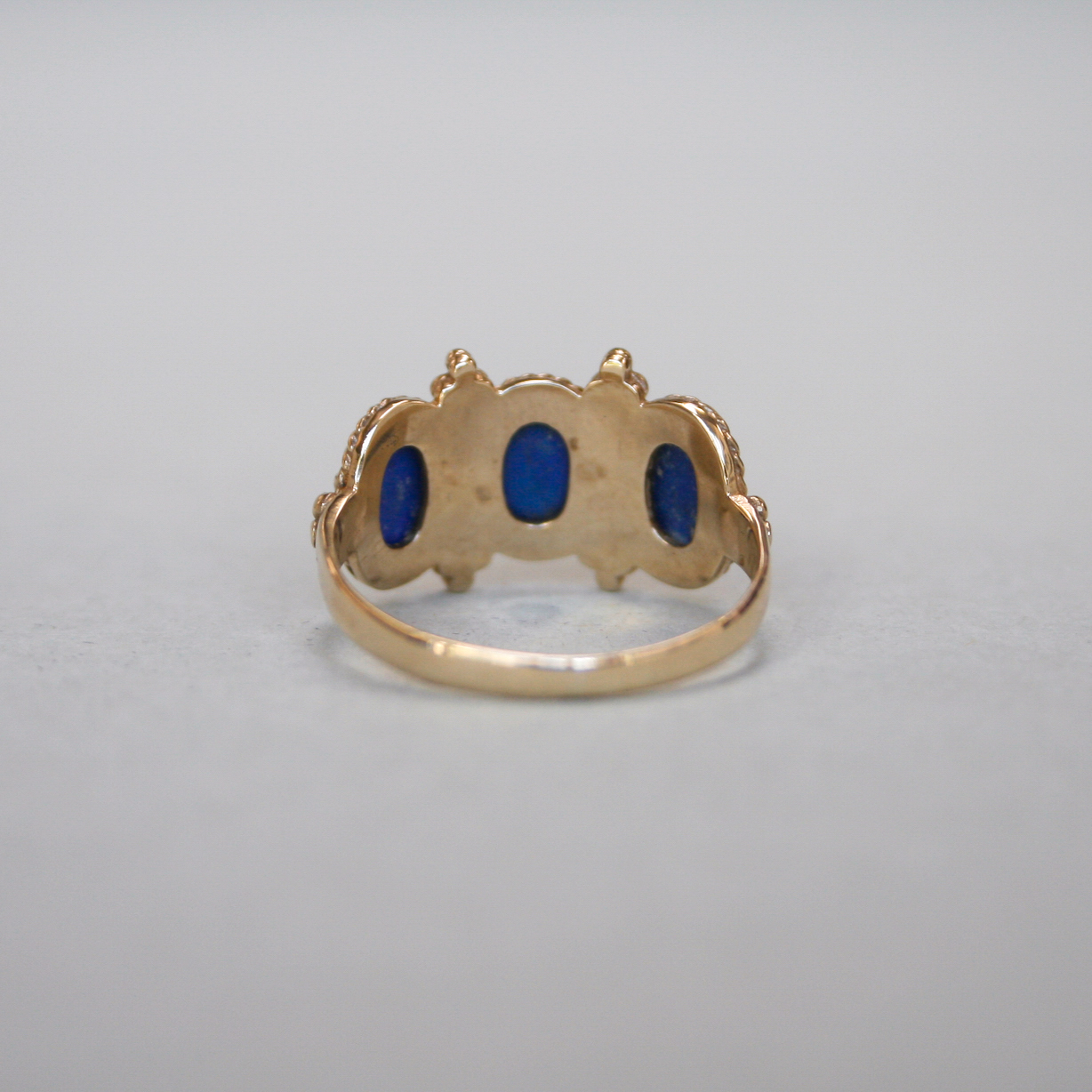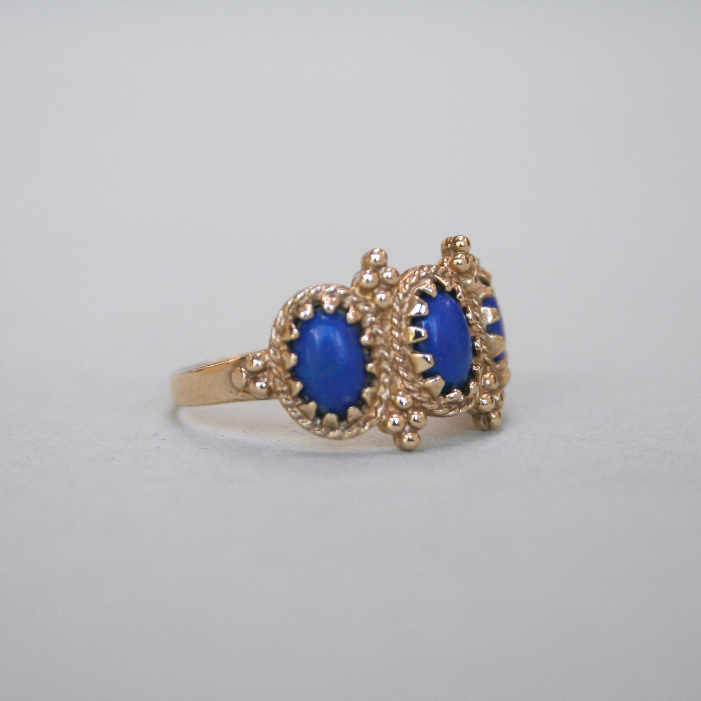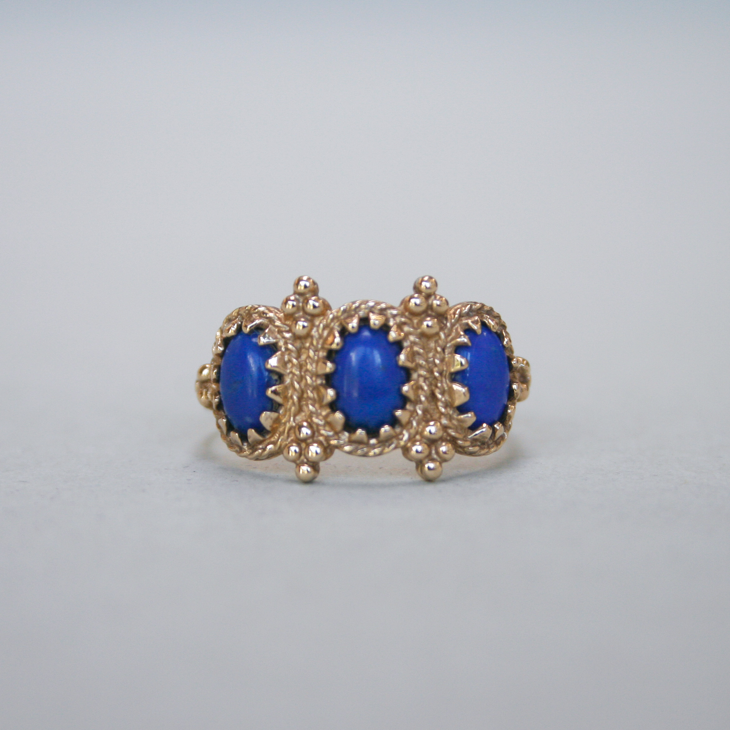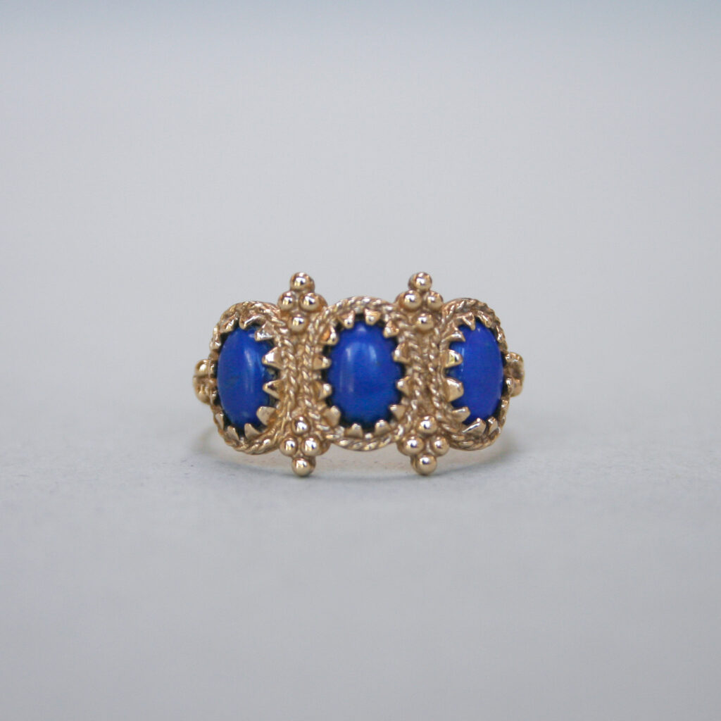 A very pretty, contemporary 9ct gold ring designed with Byzantine aesthetics in mind. Set with three oval lapis lazuli cabochons, beautifully framed by rope twist and bead detailing. The ring face measures 11mm x 18mm and each lapis lapis measures 6mm x 4mm. This piece dates to the 1980s and has a lovely ancient feel. On a plain shank.