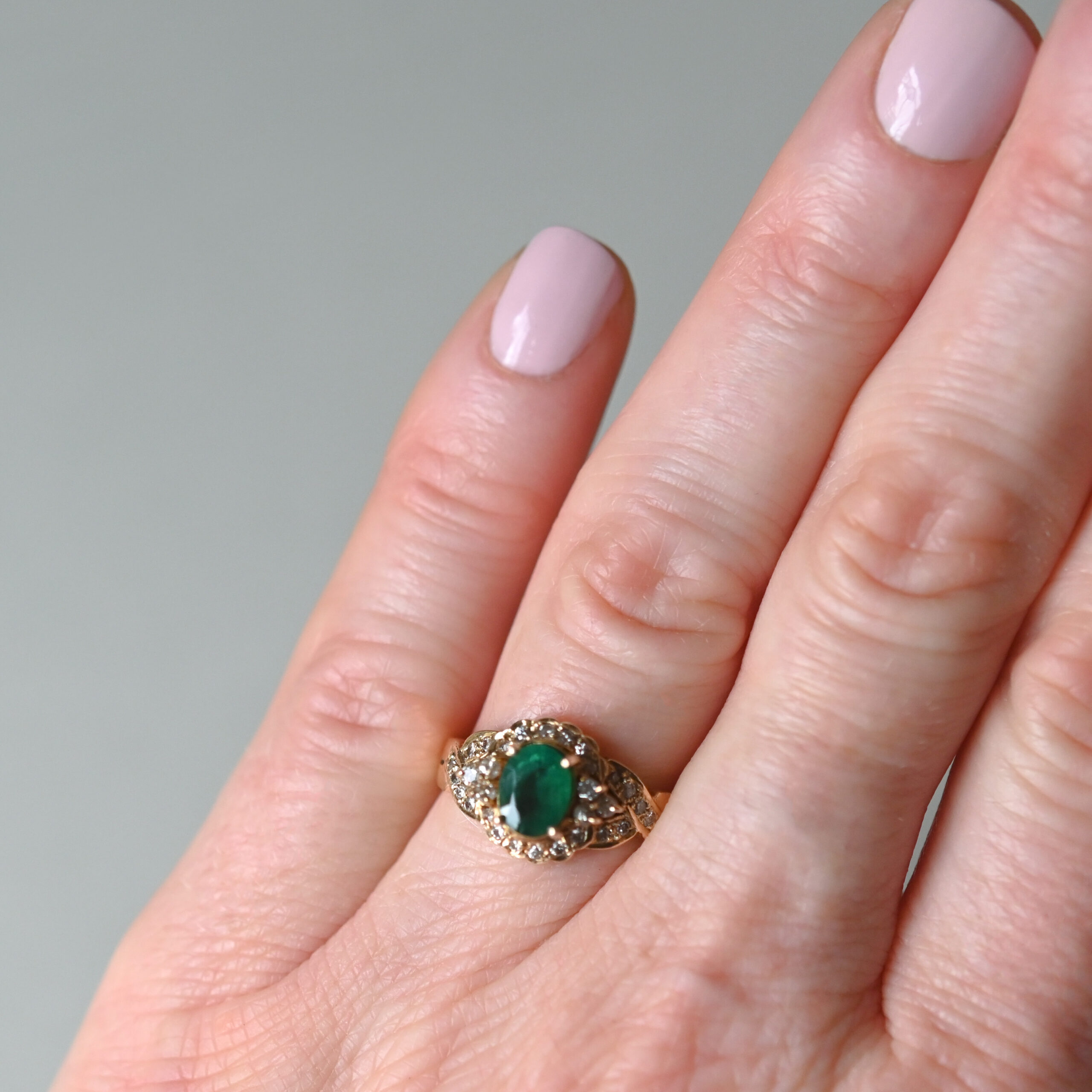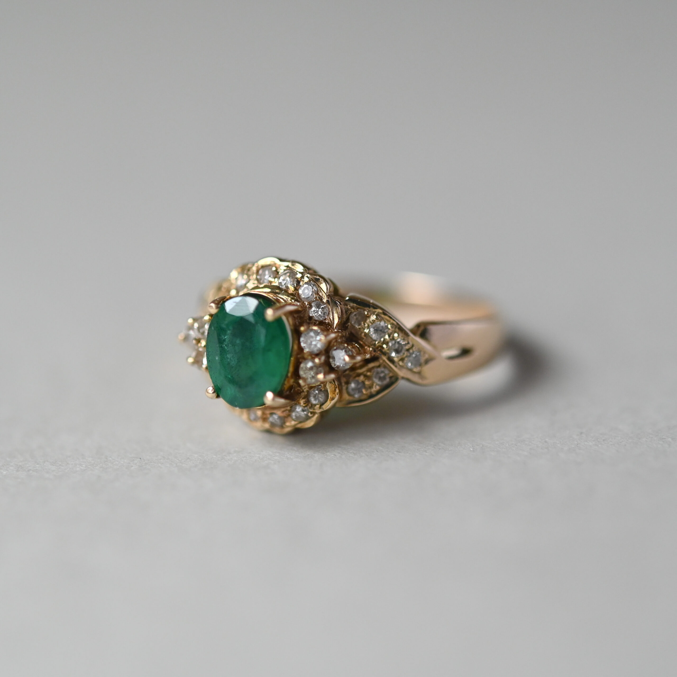 A classically designed 18ct gold ring, claw set with a central oval cut emerald. The 7 mm x 5 mm emerald is a very pretty forest green hue and displays beautiful natural inclusions. Flanked by sweet trefoils and finely framed by diamonds in a scallop edged halo. The shoulders are designed as diamond set crossover twists, adding an extra touch of sparkle. The ring face measures 11 mm x 11 mm. An estimated total carat weight of 0.24ct diamonds. On a plain shank. This aesthetic piece would make a beautiful vintage style engagement ring.