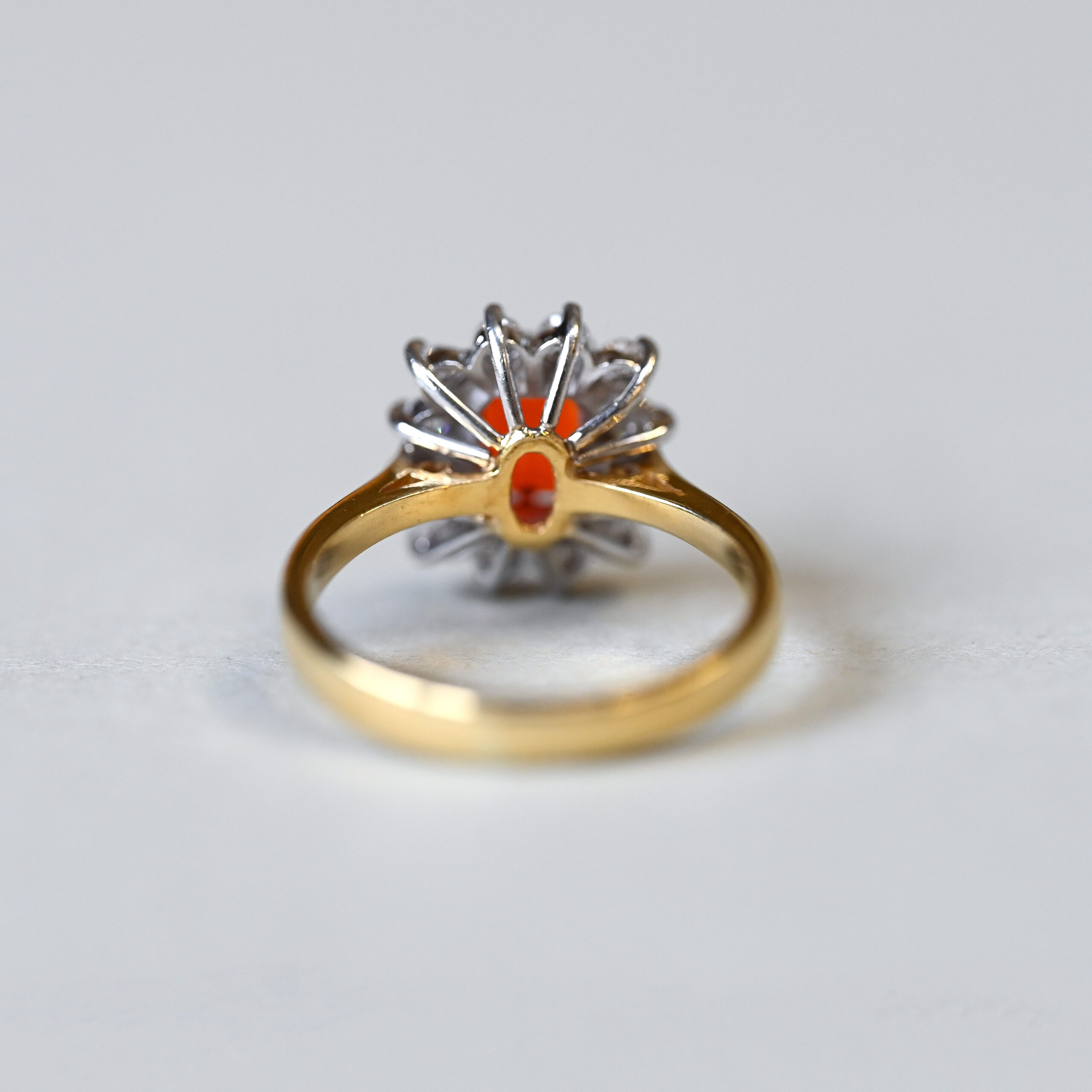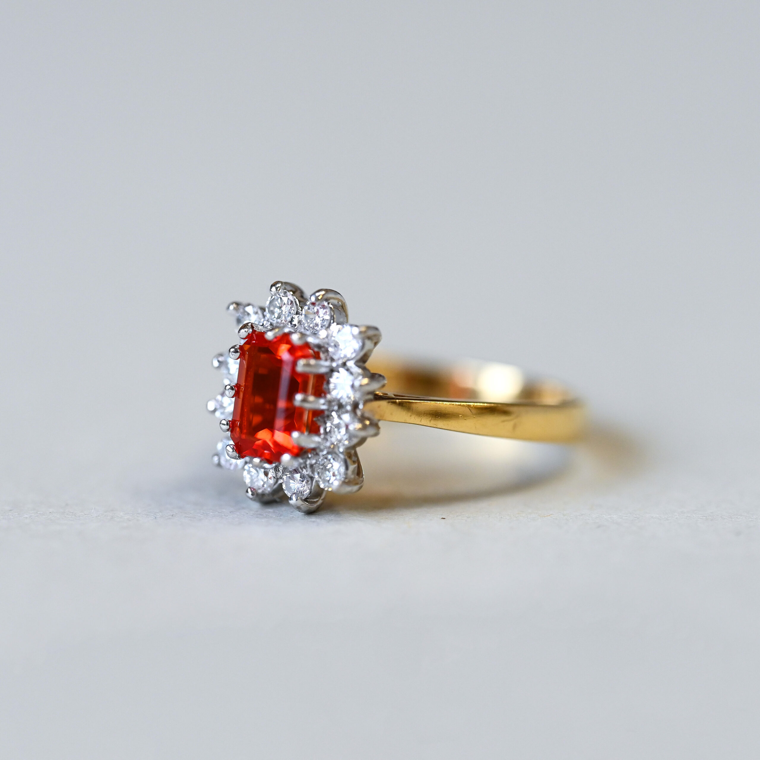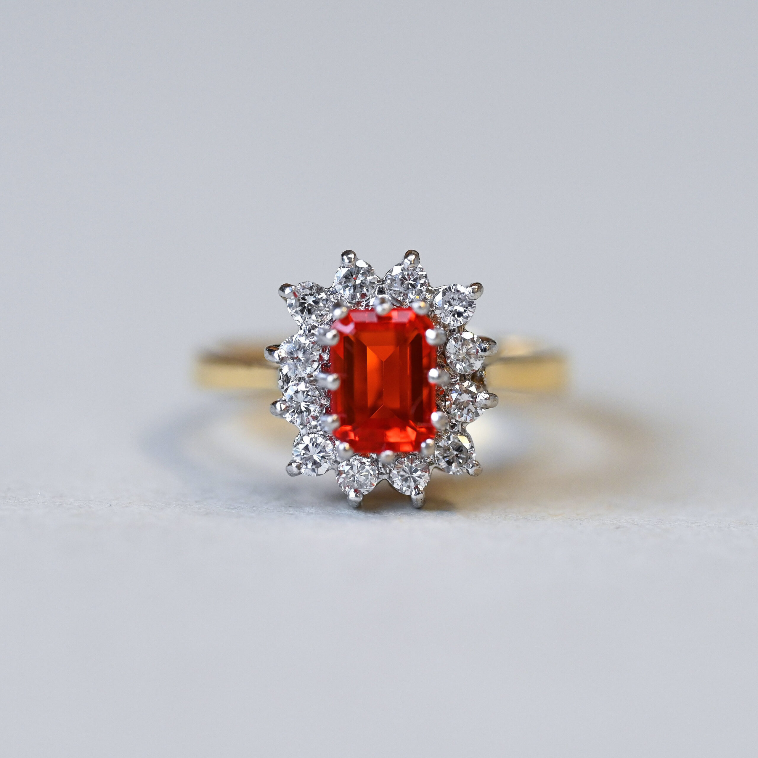 A timeless and classically designed 18ct gold ring, claw set with a rectangular step cut fire opal. The vibrancy of the fire opal’s glowing hue contrasts beautifully with the crisp, white and very lively diamonds. Cluster measures 12.5 mm x 11.2 mm, with the opal measuring 7.2 mm x 5.4 mm and an estimated total diamond weight of 0.42 carats. Flanked by tapered shoulders. On a plain shank. This colourful and very pretty piece would make a perfect engagement ring.