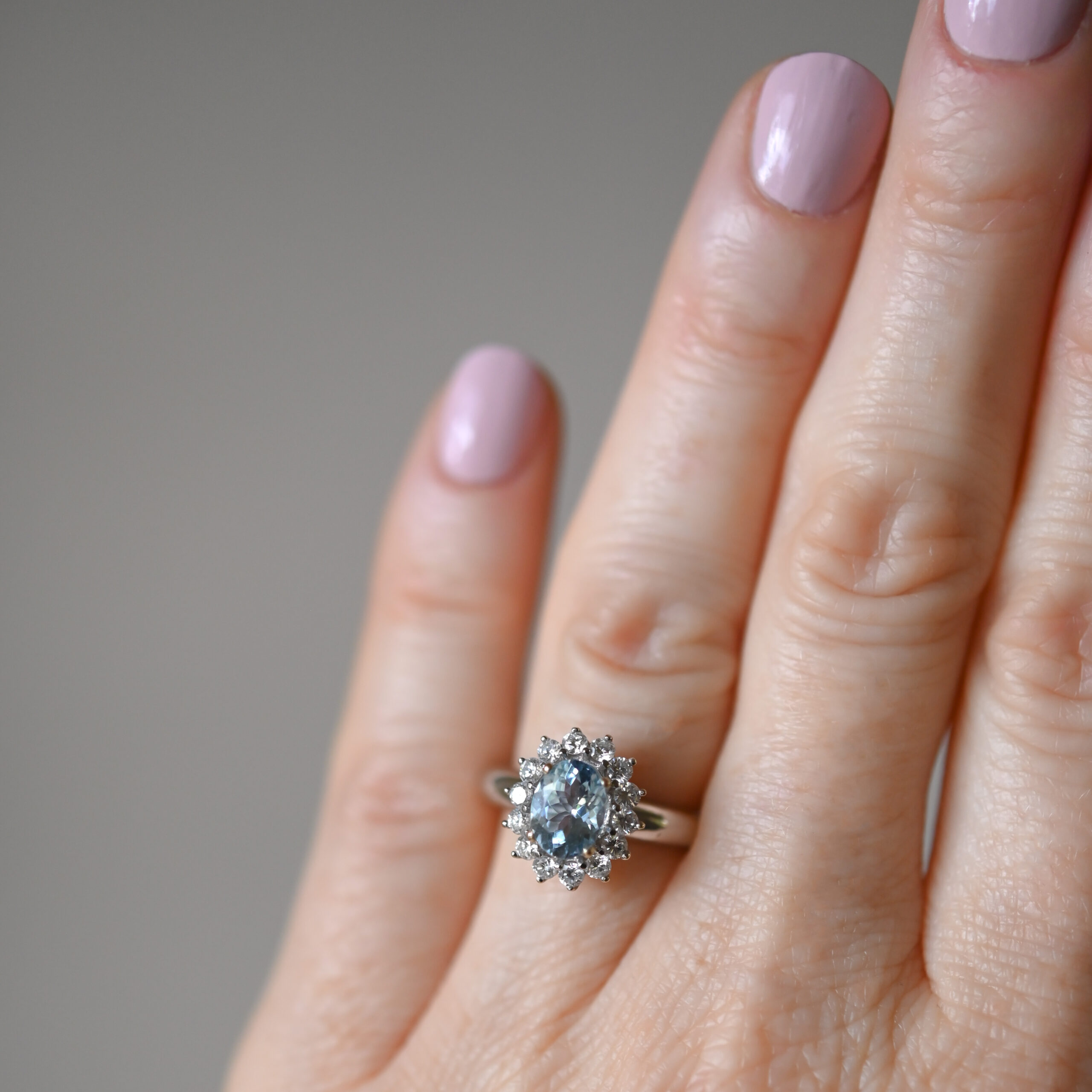 A classically designed 18ct white gold ring claw set with a central oval aquamarine. The aquamarine is a beautiful seafoam hue and measures 8 mm x 6 mm, estimated to be 1.1 carats. Framed by a halo of 14 individually set 4 point diamonds, totalling approximately 0.56 carats. The diamonds are very bright, lively, well matched. The ring face measures 13 mm x 11 mm. The top of the aquamarine table sits 9 mm from the finger. On a plain shank. This pretty and beautifully made piece would make a perfect vintage style engagement ring.